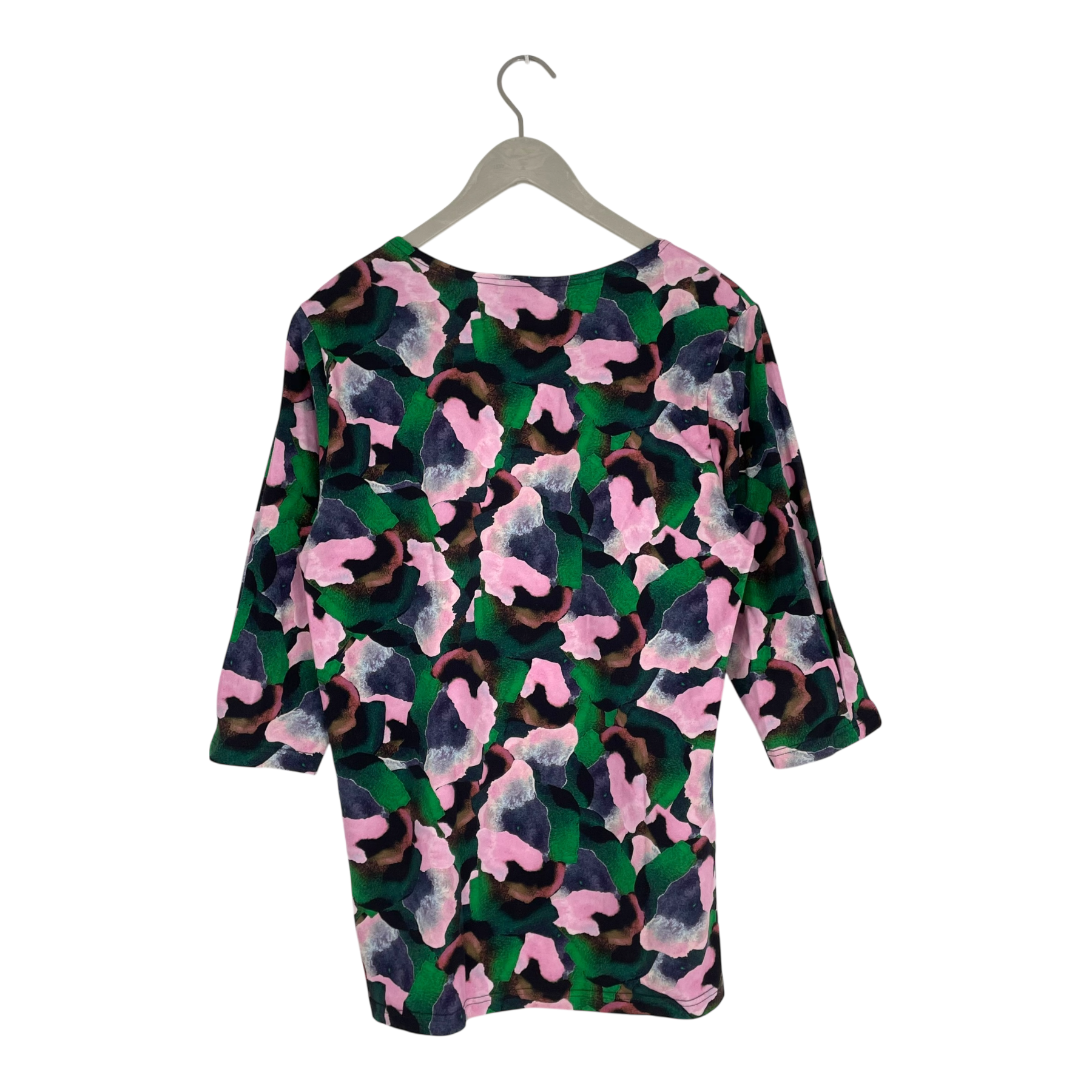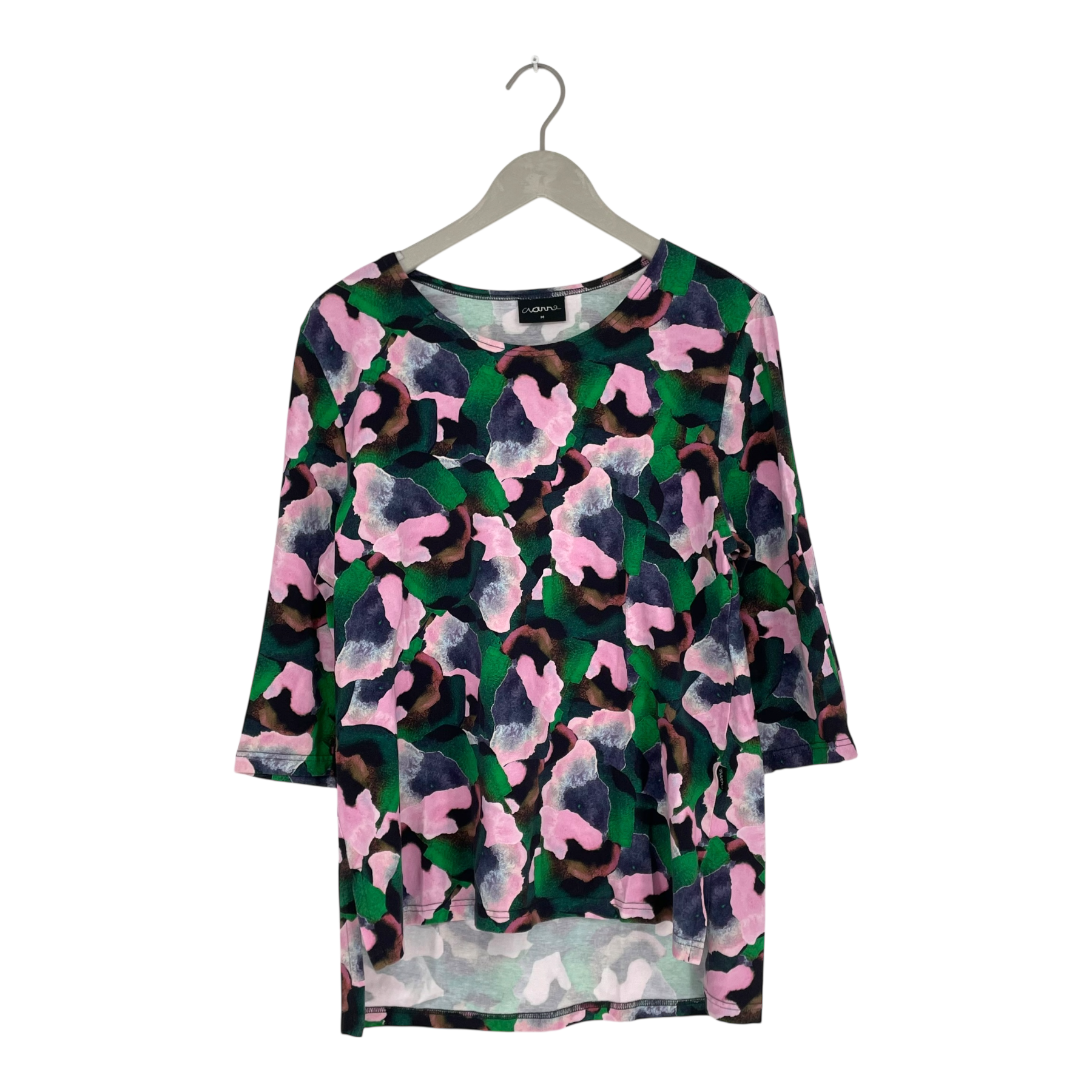 Aarre 2/3 long-sleeved shirt in Orvokki print. The hem is slightly longer from the back,  small slits on the sides, and pleats on the cuff ends.