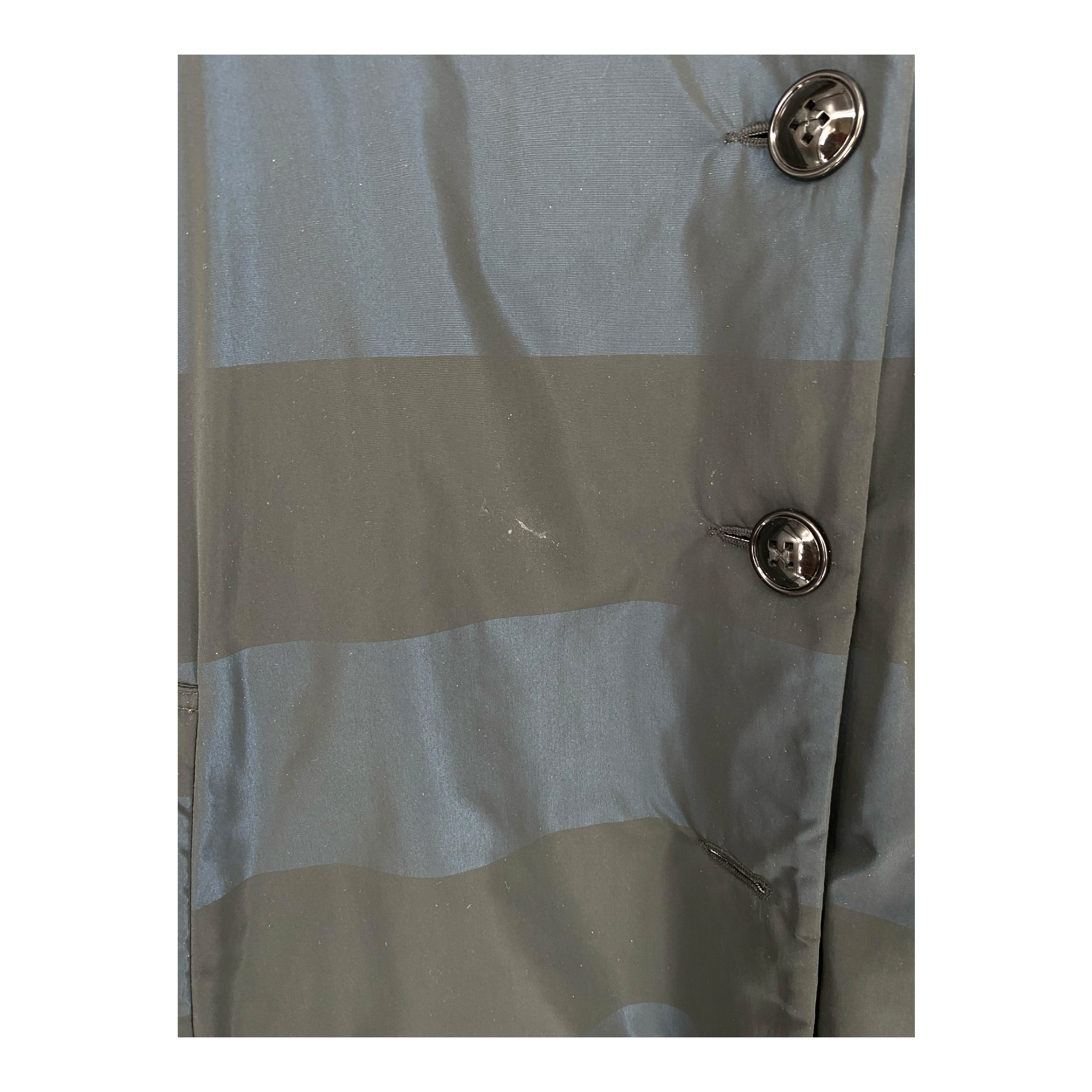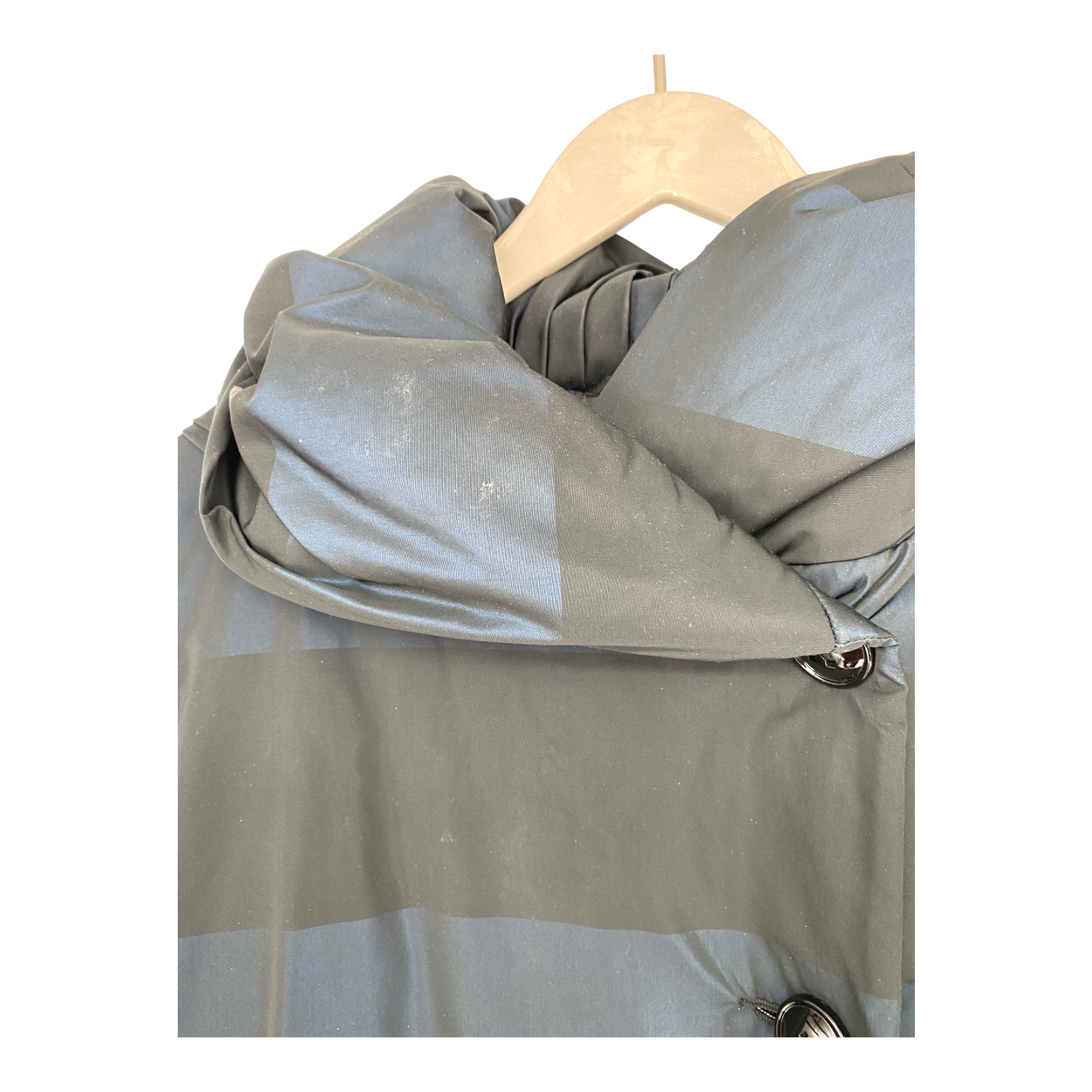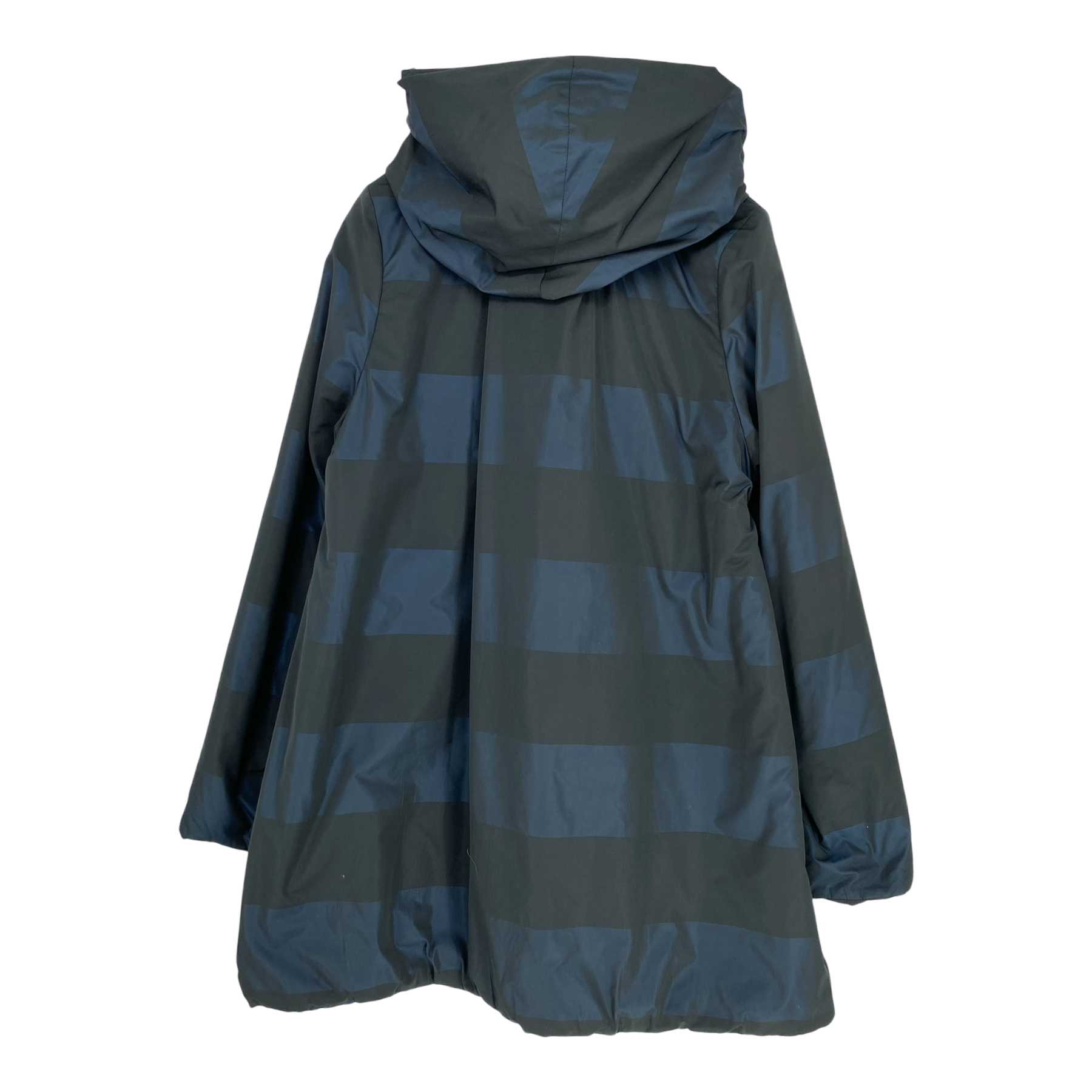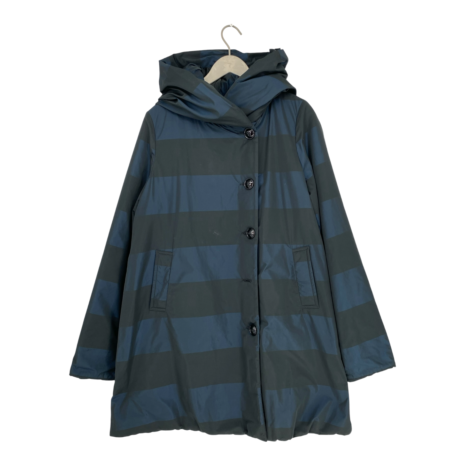 Ritva Falla A-line coat with wide horizontal stripes. This single-breasted coat features a button-front closure, a generous hood, and two front pockets. The hem can be adjusted with a ribbon.