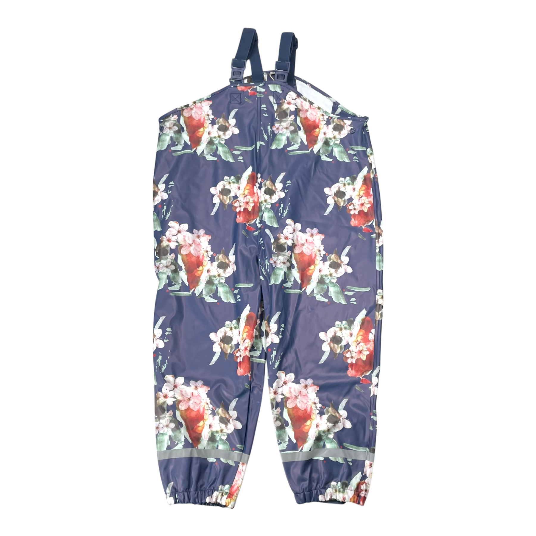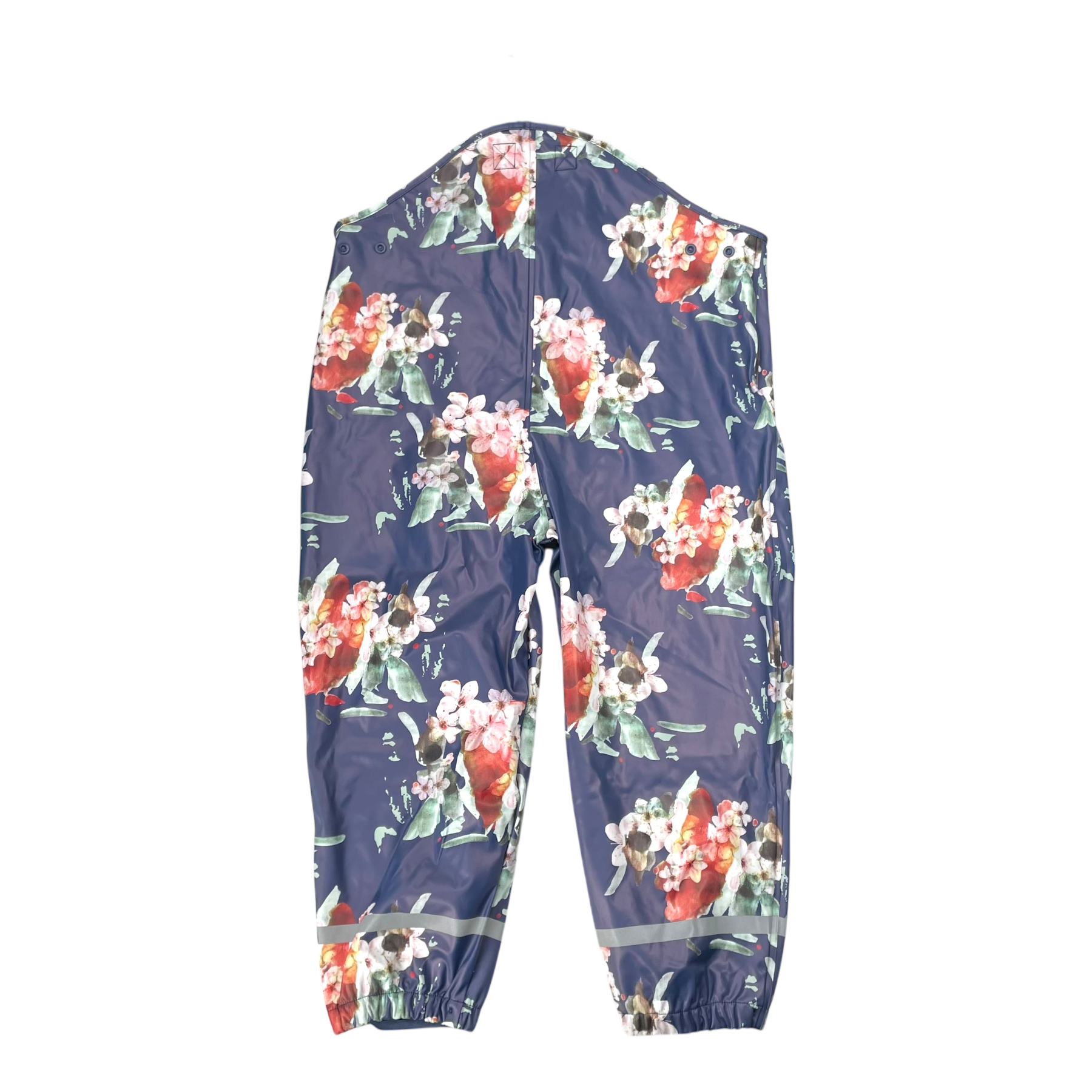 The Rain Overalls feature adjustable suspenders to keep the pants in place, and snap buttons at the side seams to adjust the waist fit. The rain pants also come with adjustable and removable foot straps. Reflective details on the cuffs enhance visibility. All seams of the pants are taped, making them fully waterproof. The print is the Kaiko classic, Blue Blossom.