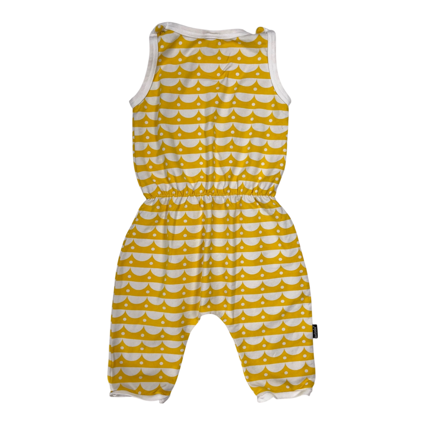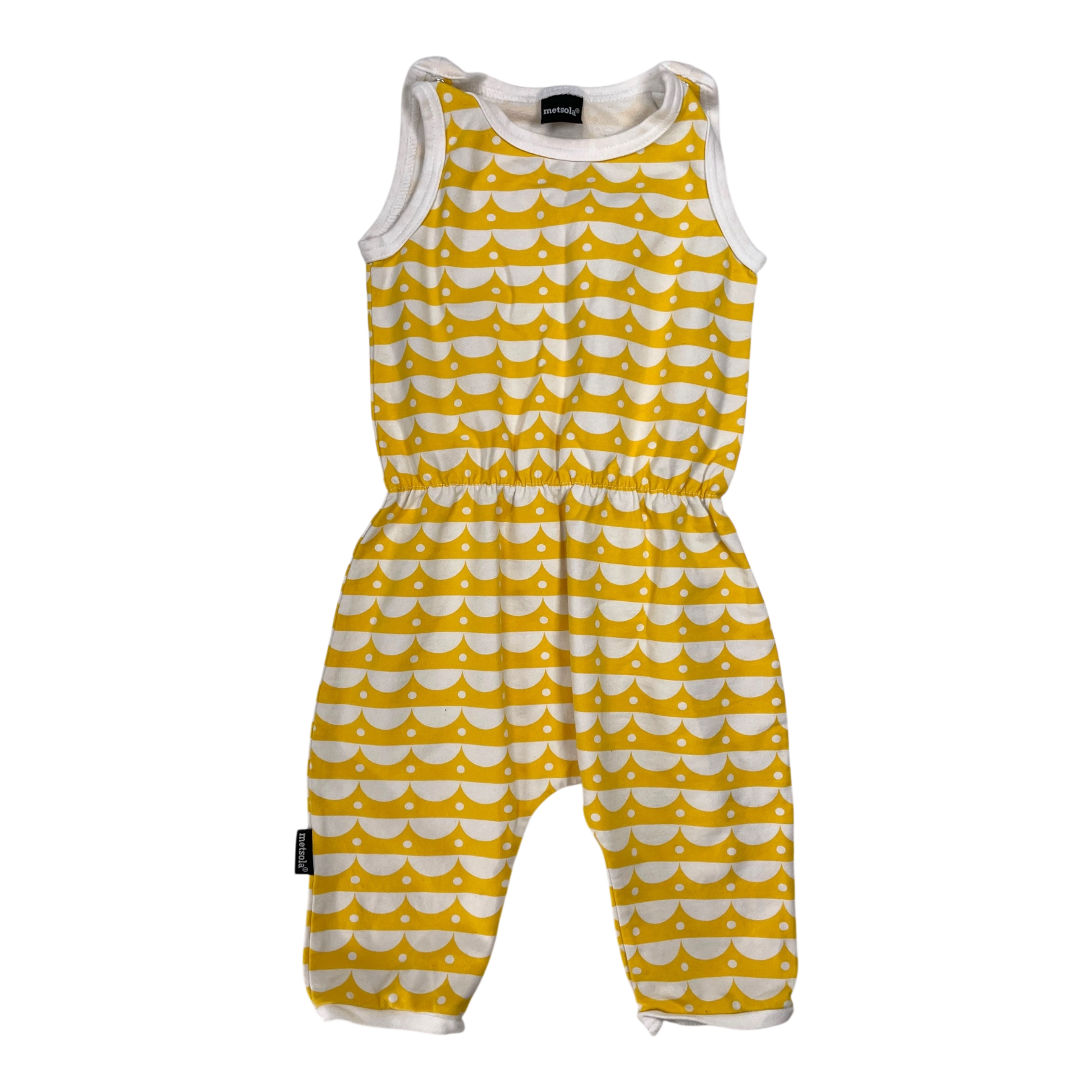 Metsola jumpsuit in yellow and white print. Snap buttons on shoulders.