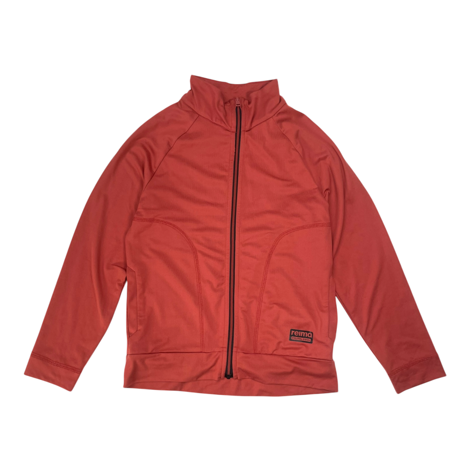 Reima Harkat zip sweater with pockets on the sides. The sweater is made from xylitol cool material that stretches four ways and is finished in a cooling treatment. The finishing treatment in reima's xylitol cool material creates a cooling sensation against skin. It also makes the skin surface temperature drop by 1 to 3 degrees!