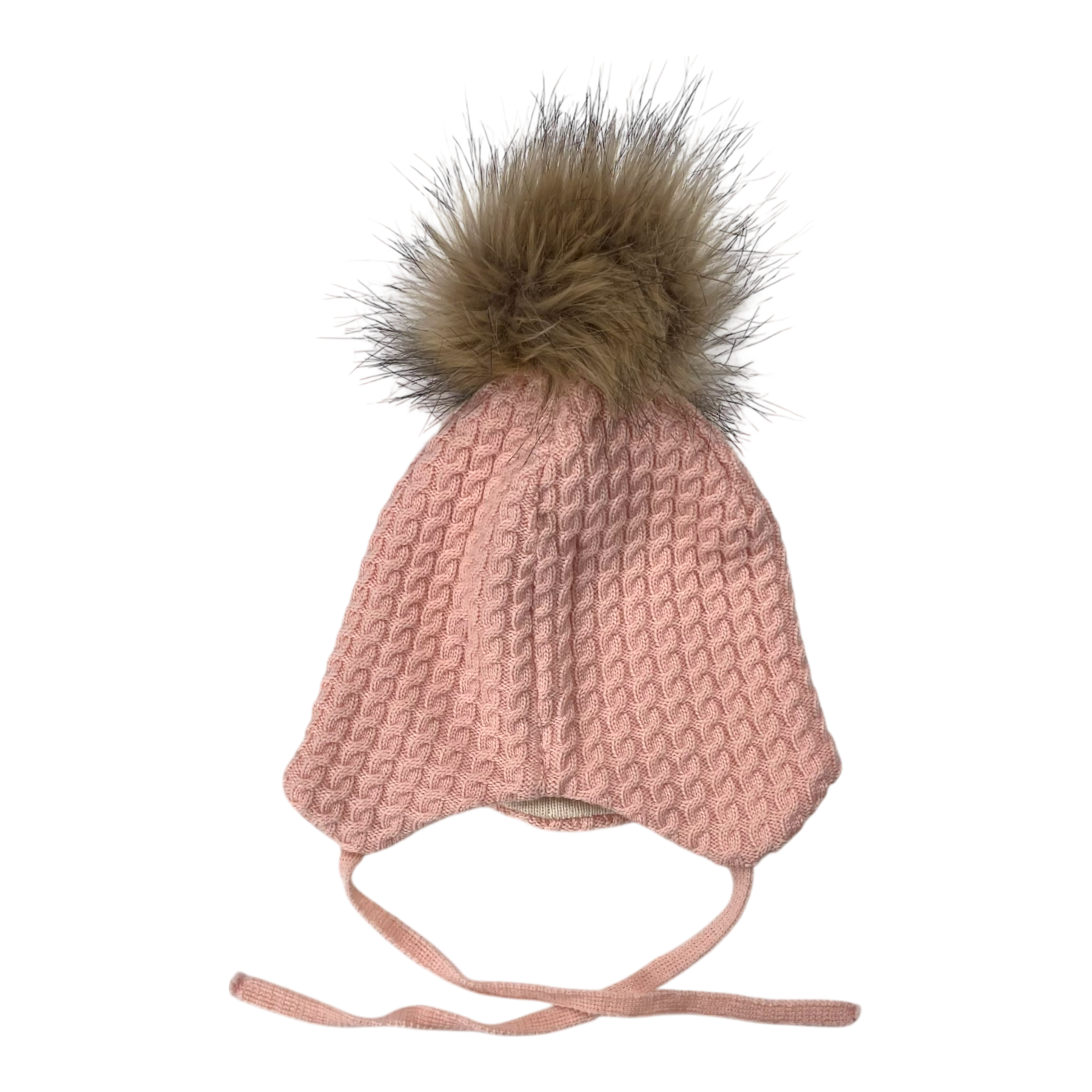 Gugguu merino wool beanie fake fur pom and a sting to tie under the chin.