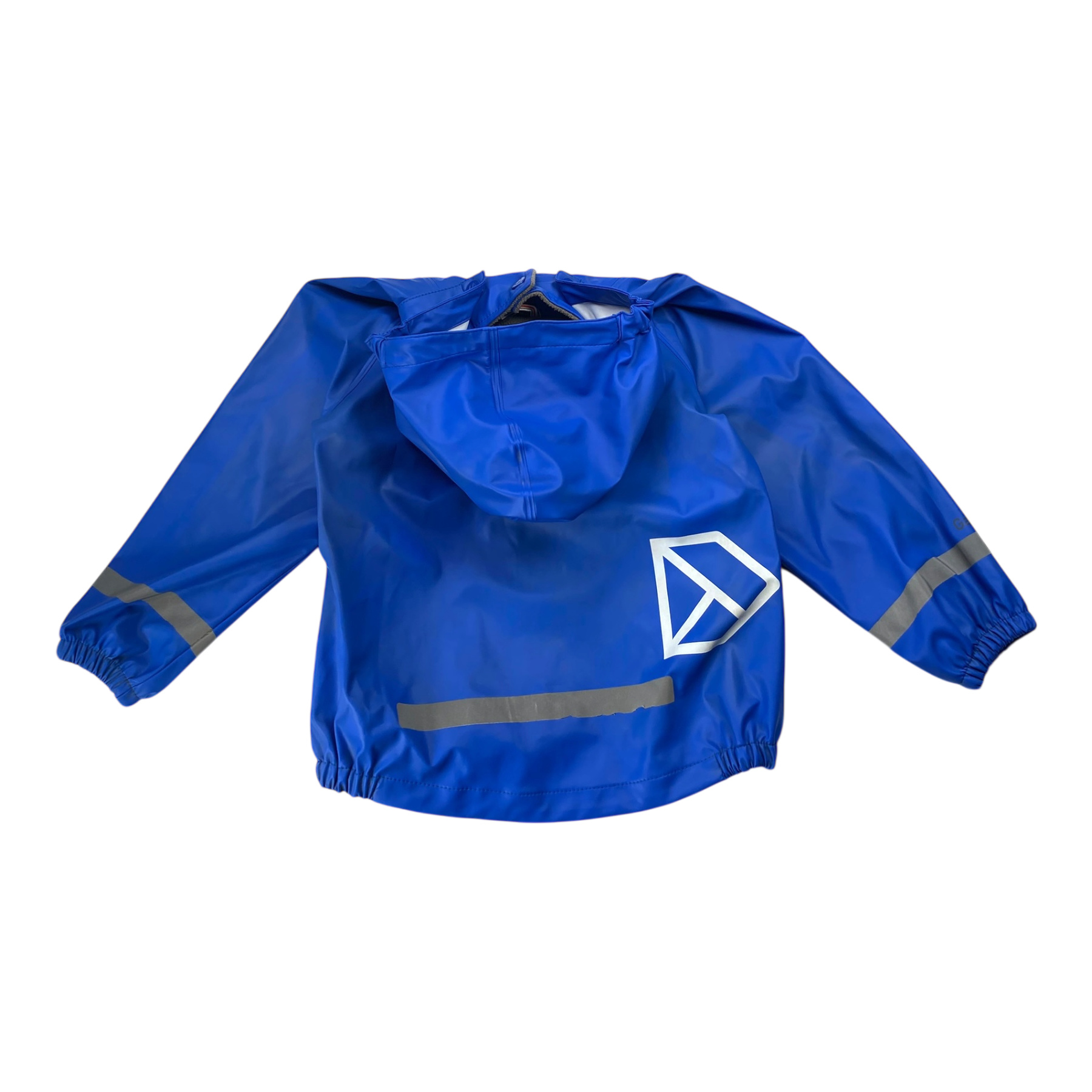 Didriksons kids rain jacket with snap buttons and a removable hood.