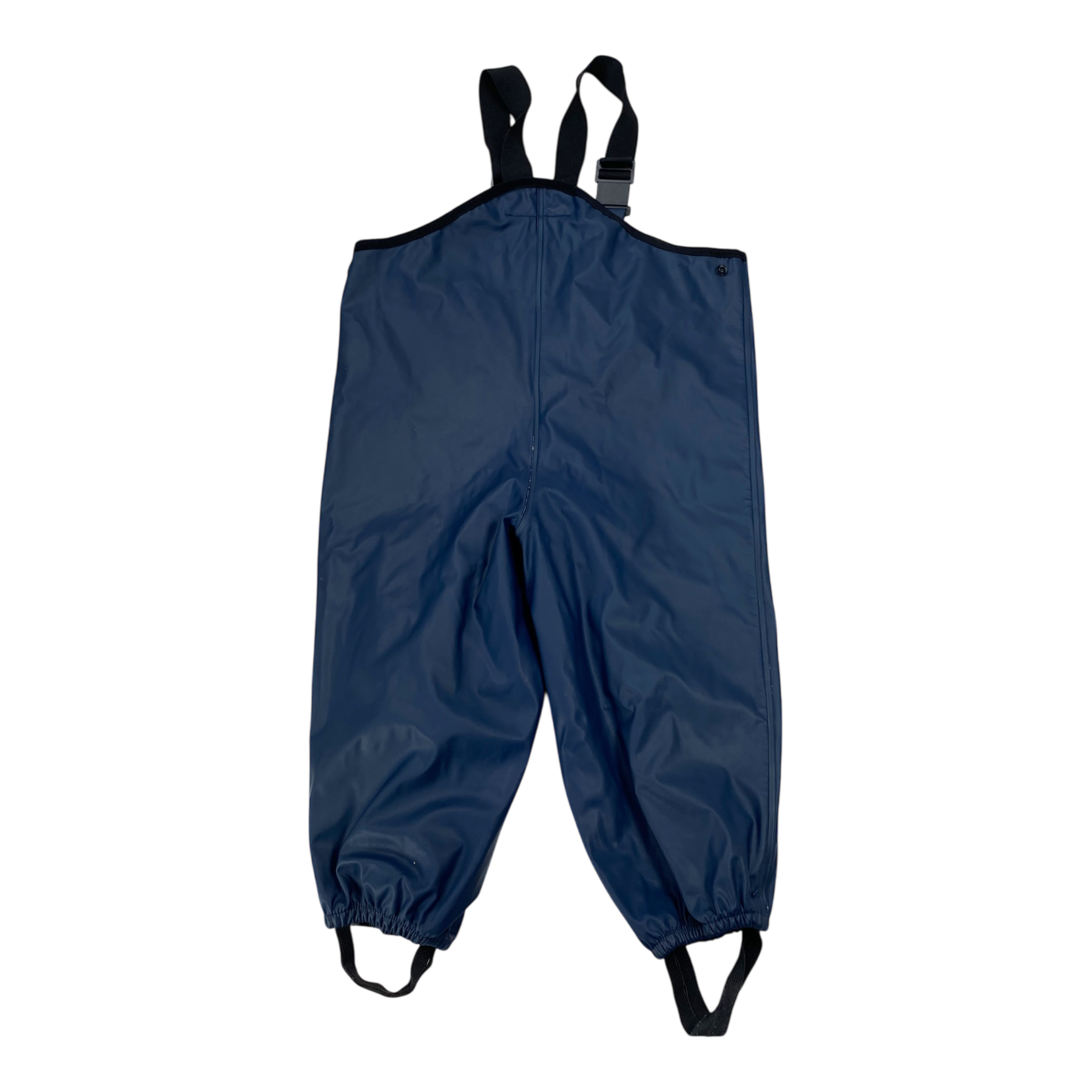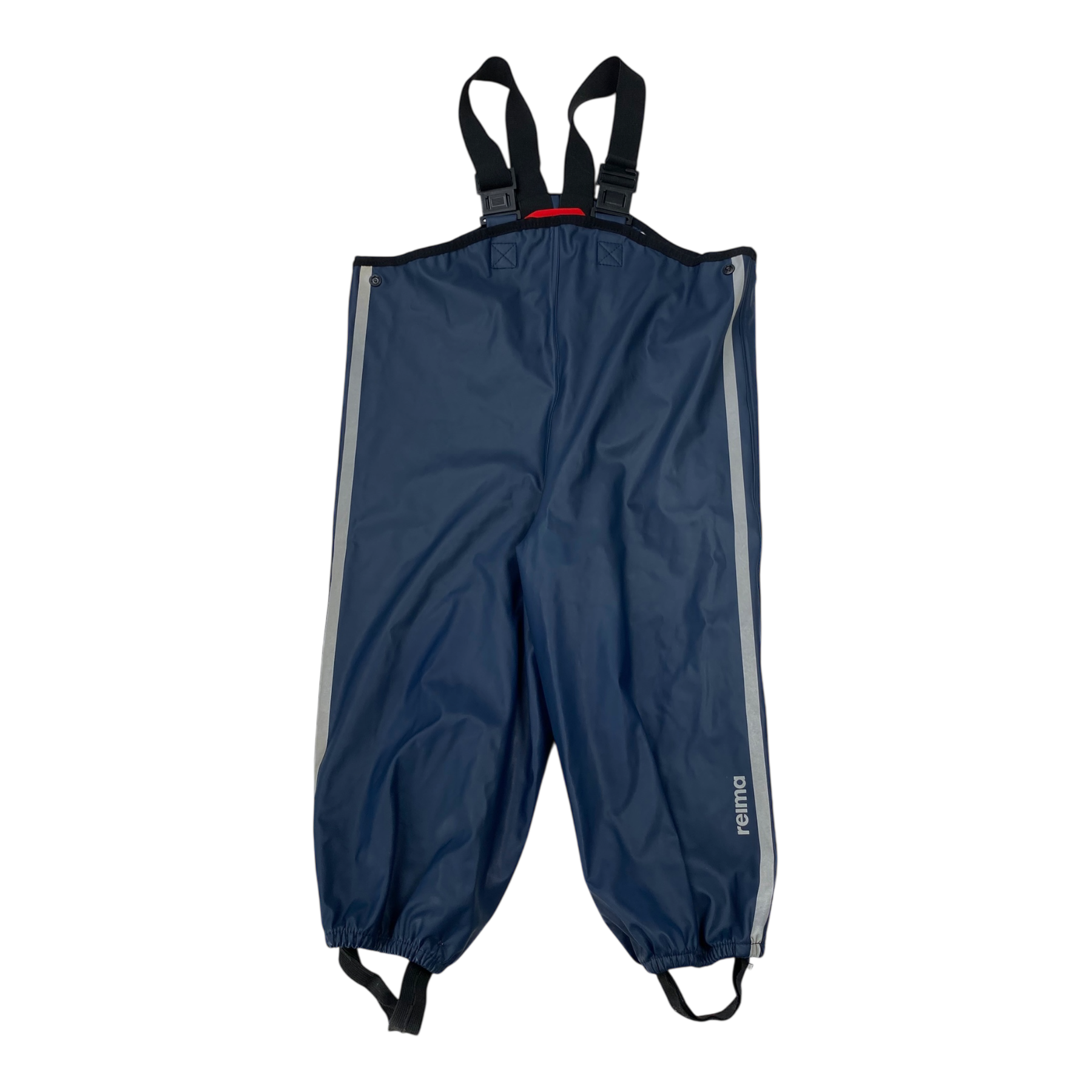 Reima rain pants for muddy activities. The trousers stay up thanks to the elasticated, adjustable suspenders and the removable foot loops are easy to pop under rubber boots or waterproof trainers to keep hems in place.