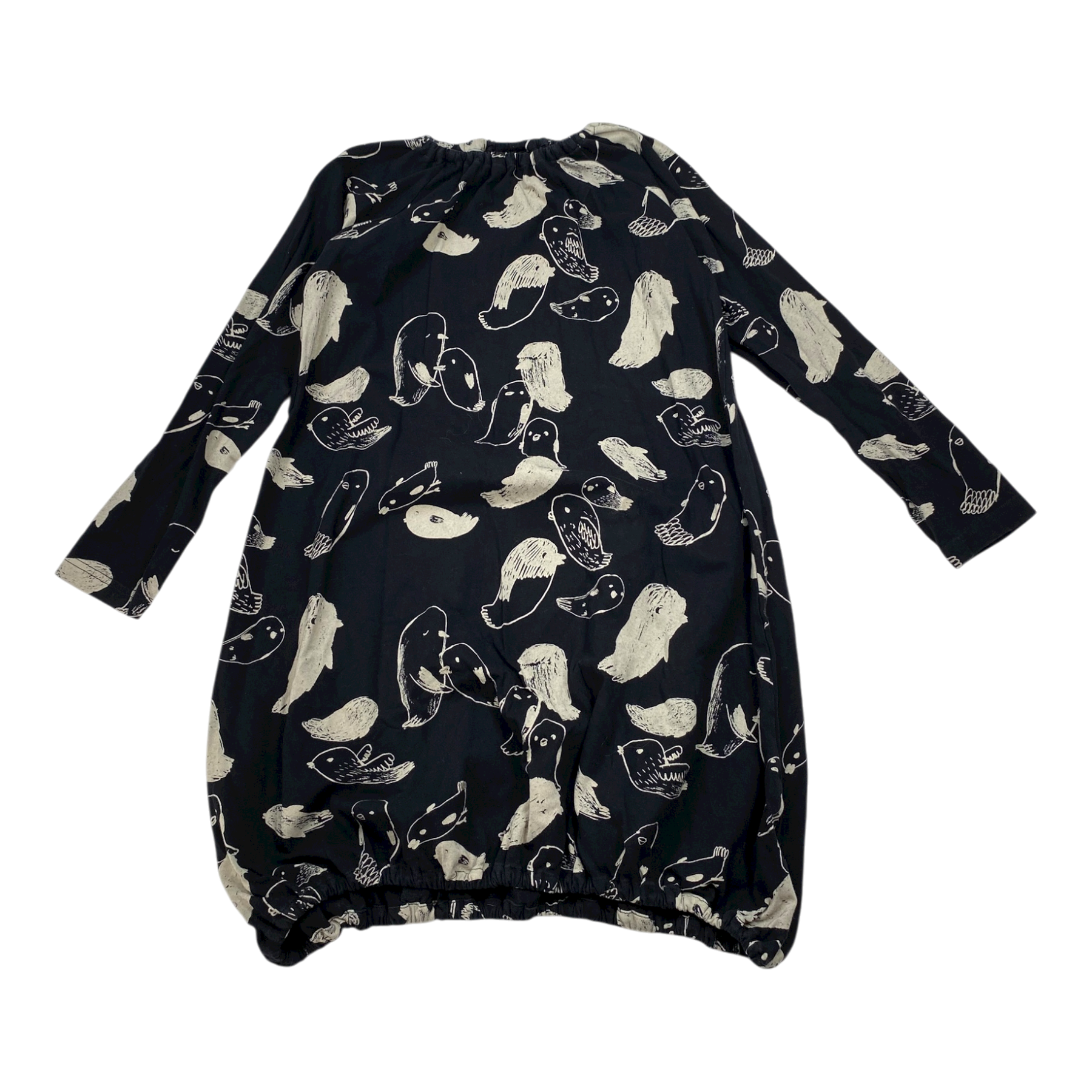Papu tricot long sleeve dress with elastic hem and neckline and black print.