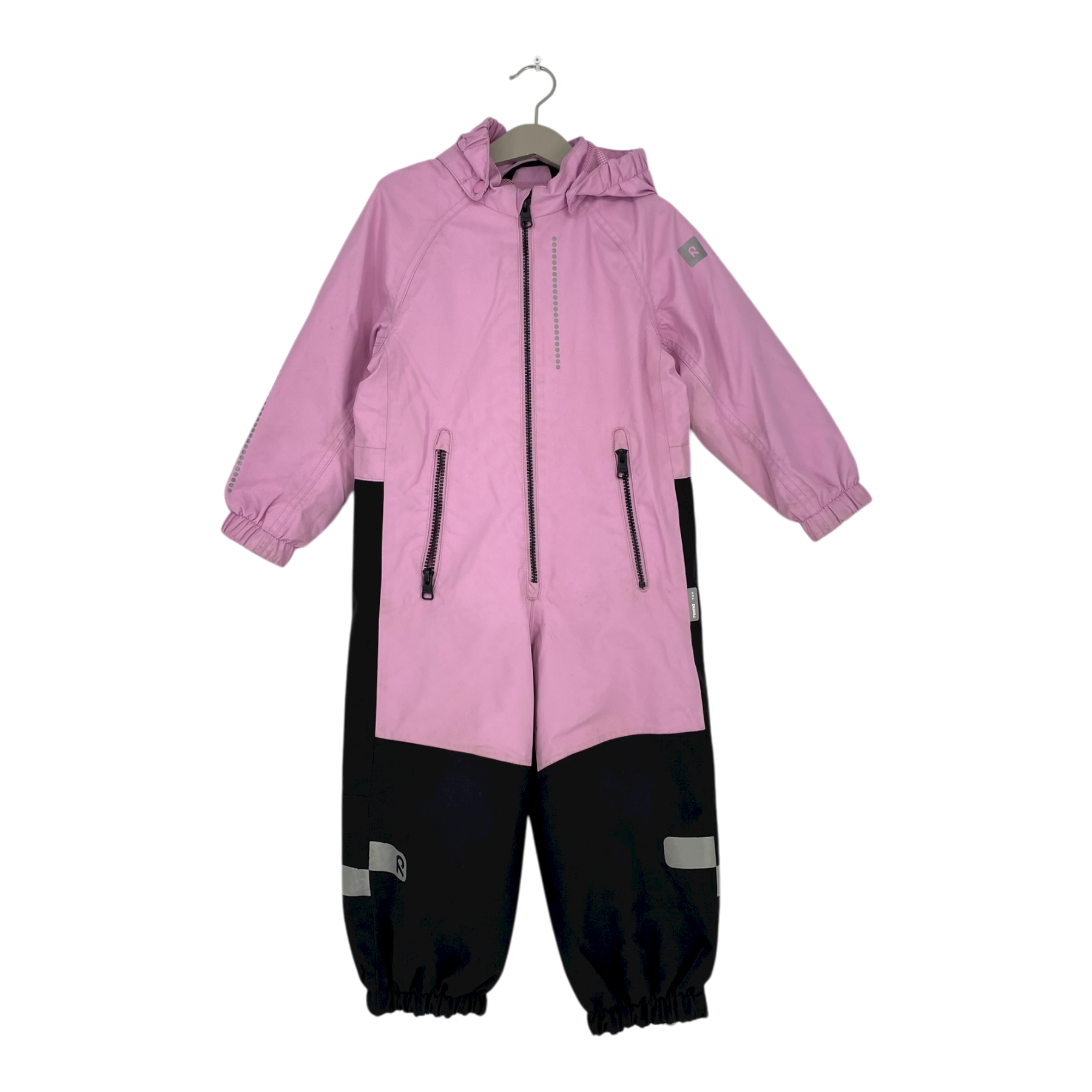 Reima Kapelli midseason overall is originally waterproof up to 10 000mm water column. All seams are sealed waterproof and material is very durable. The overall has zipper pockets, detachable hood and detachable foot loops. The item has some stains.