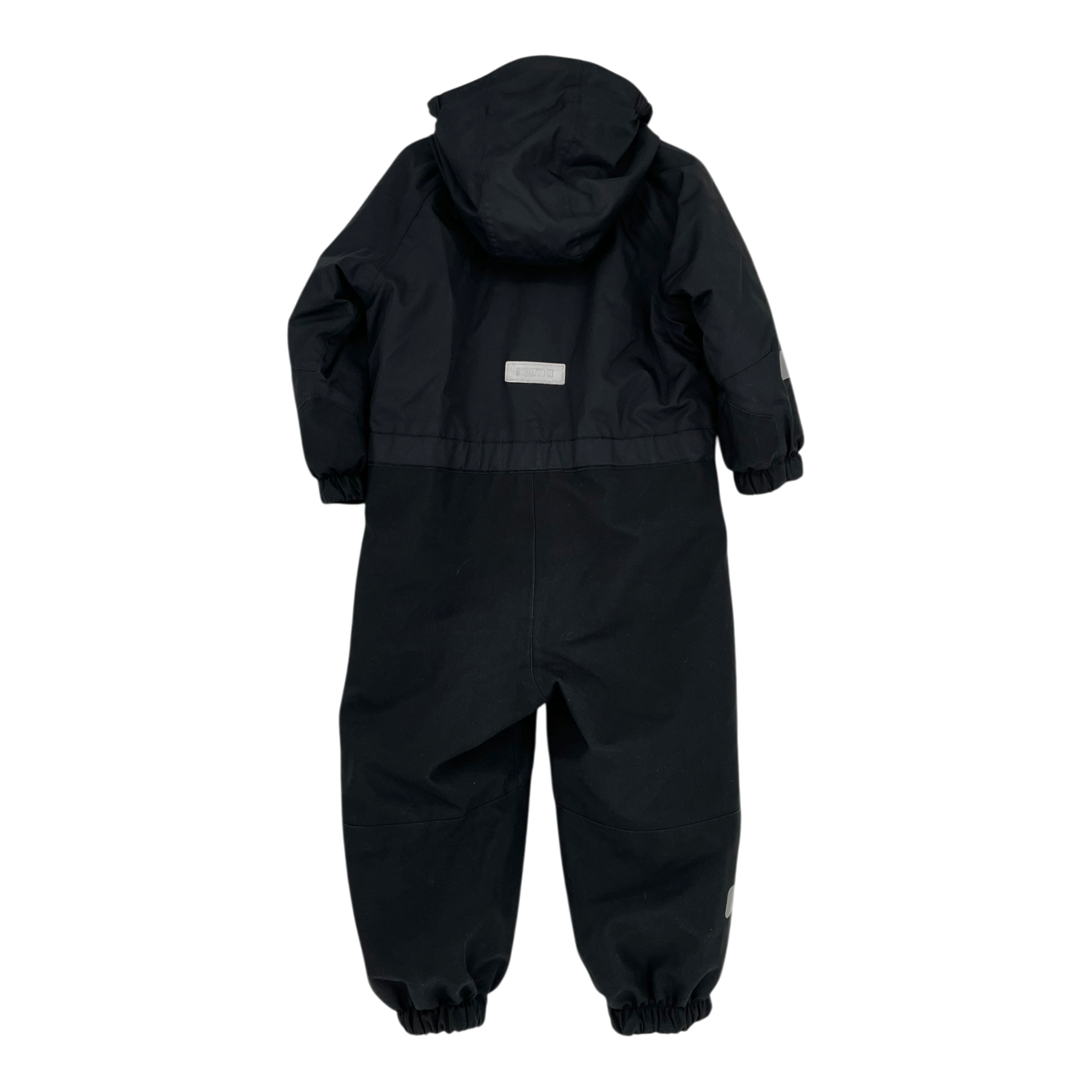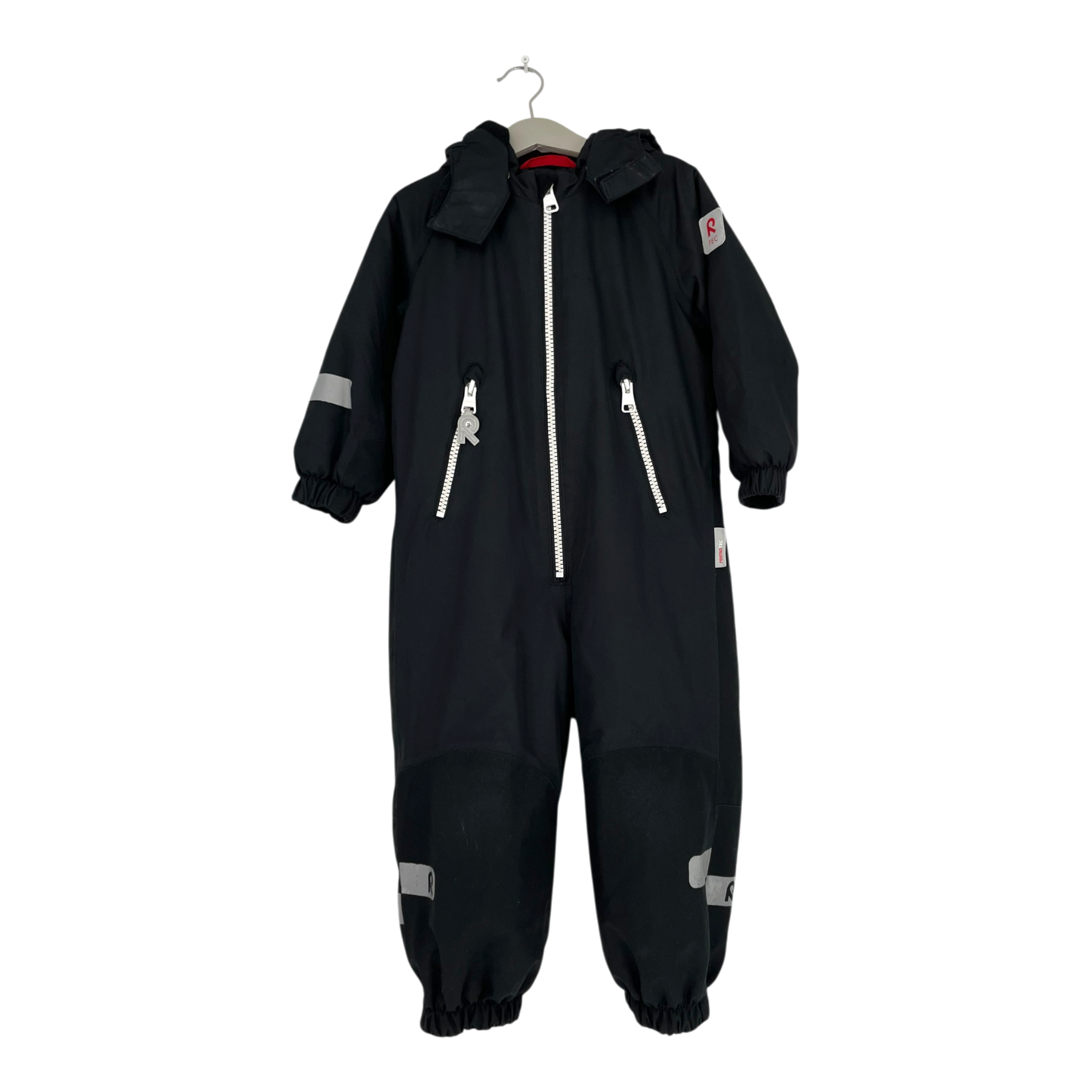 Reima Kiddo winter overall with a detachable hood and zip pockets on the sides. The material is originally waterproof up to 8,000mm water column, windproof, and breathable. All seams have been sealed. The silicone foot loops keep the leg ends in place, no matter how fast your little one's moving.
