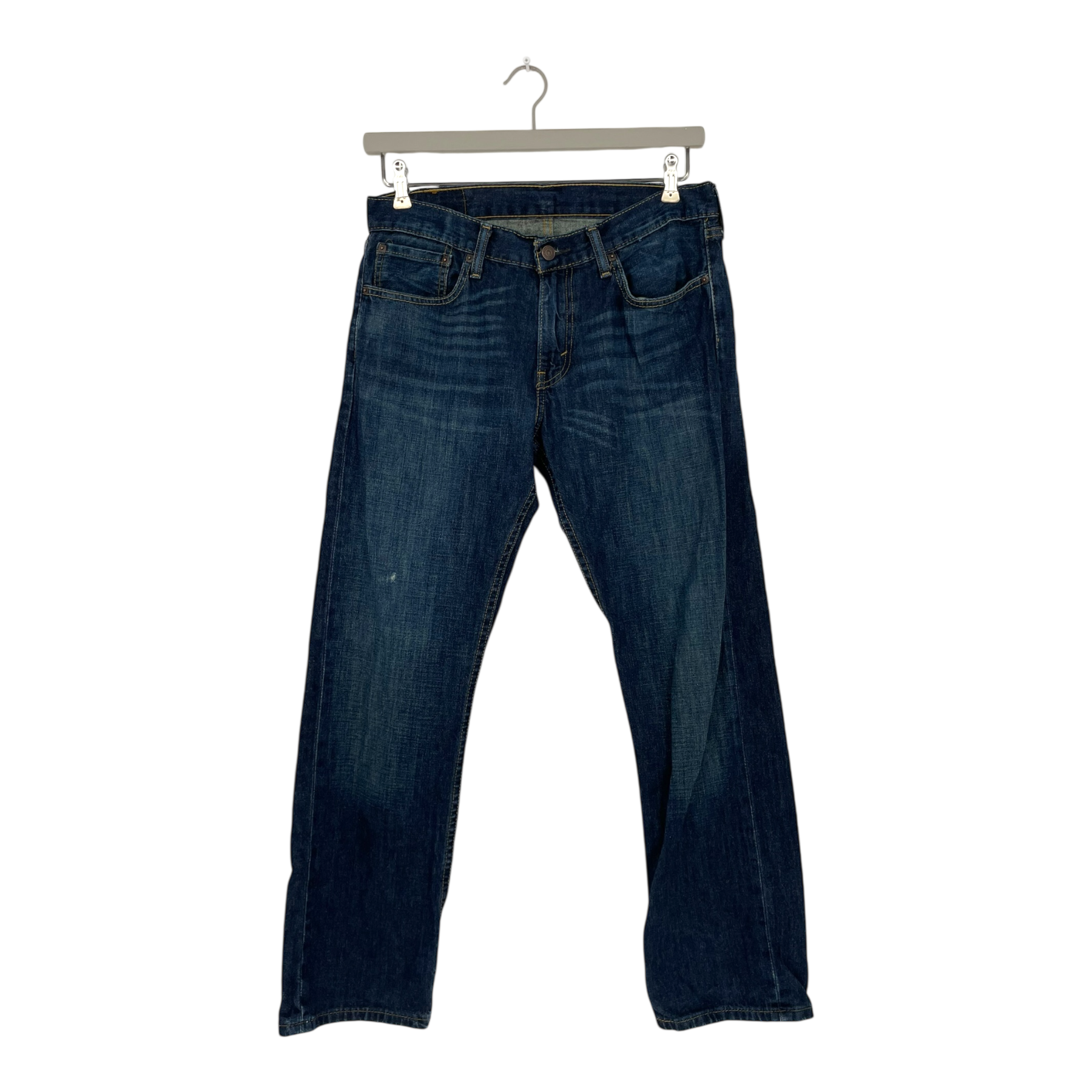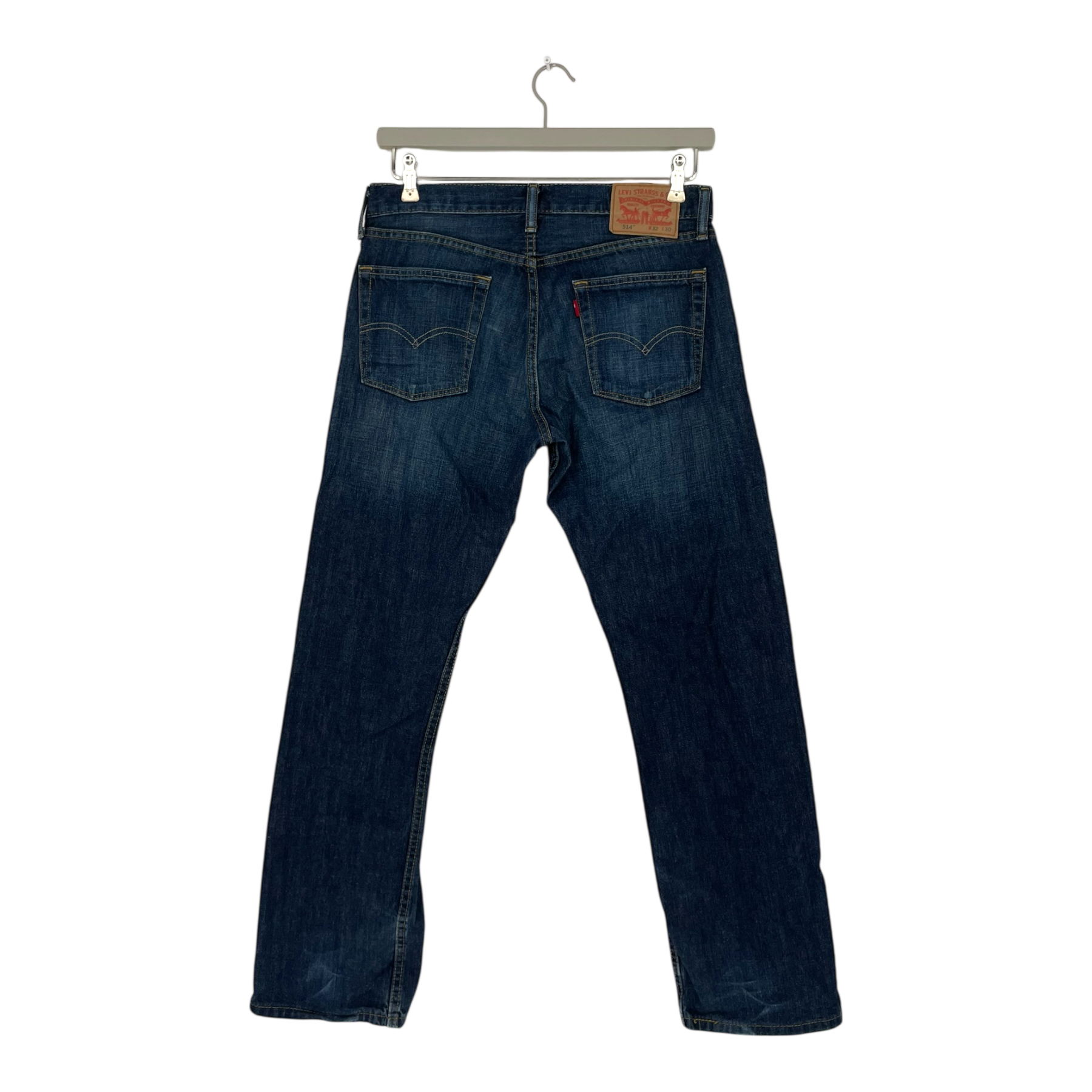 Levi's 514 classic straight jeans in denim blue. The fabric has worn out on the left knee. Zipper fly.
