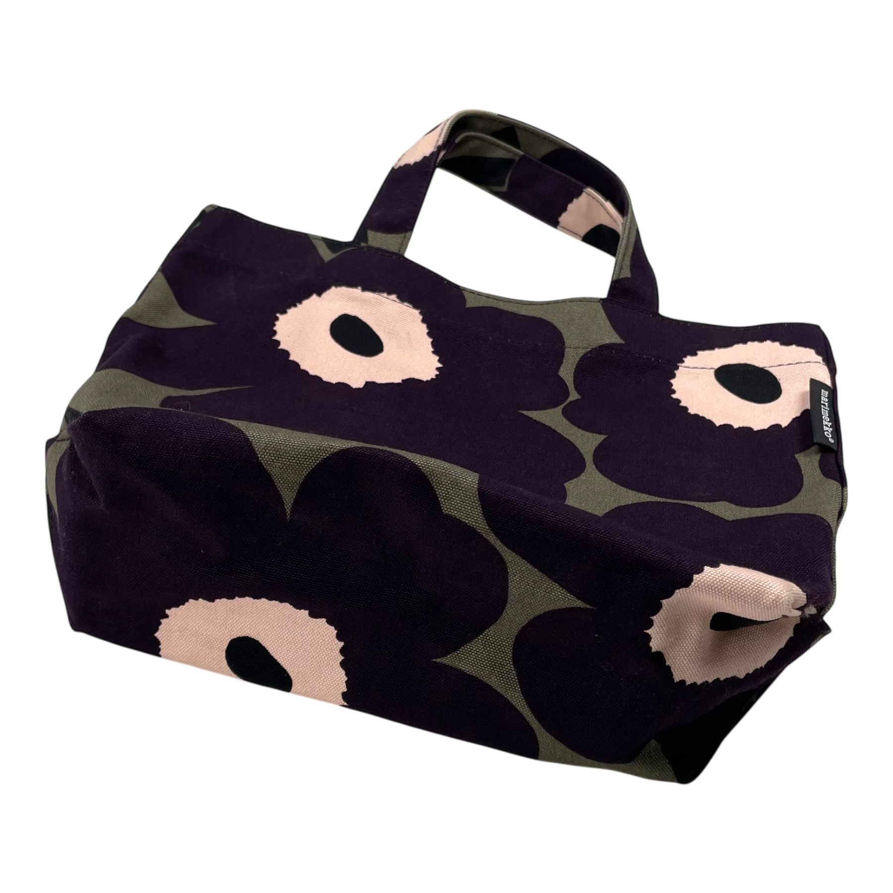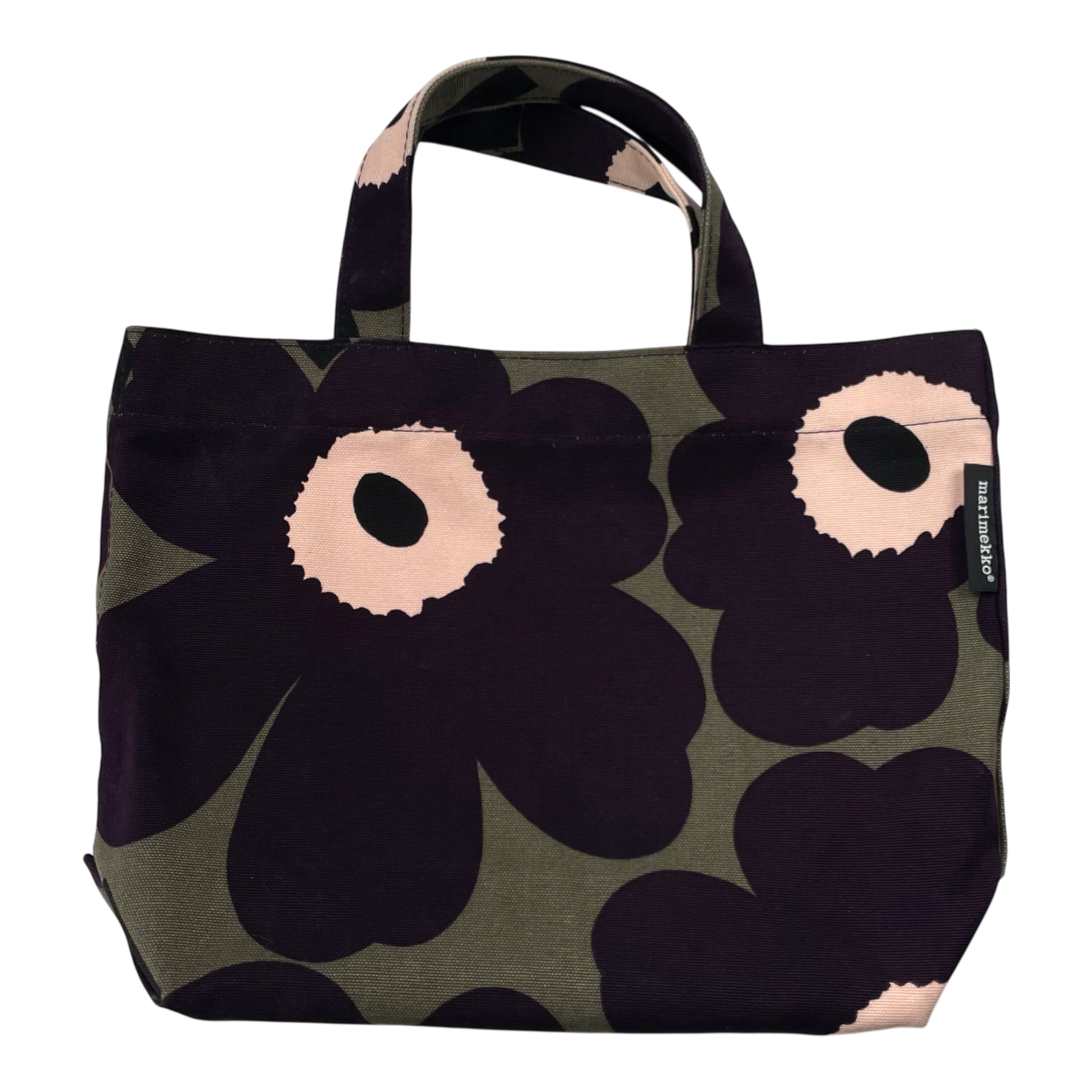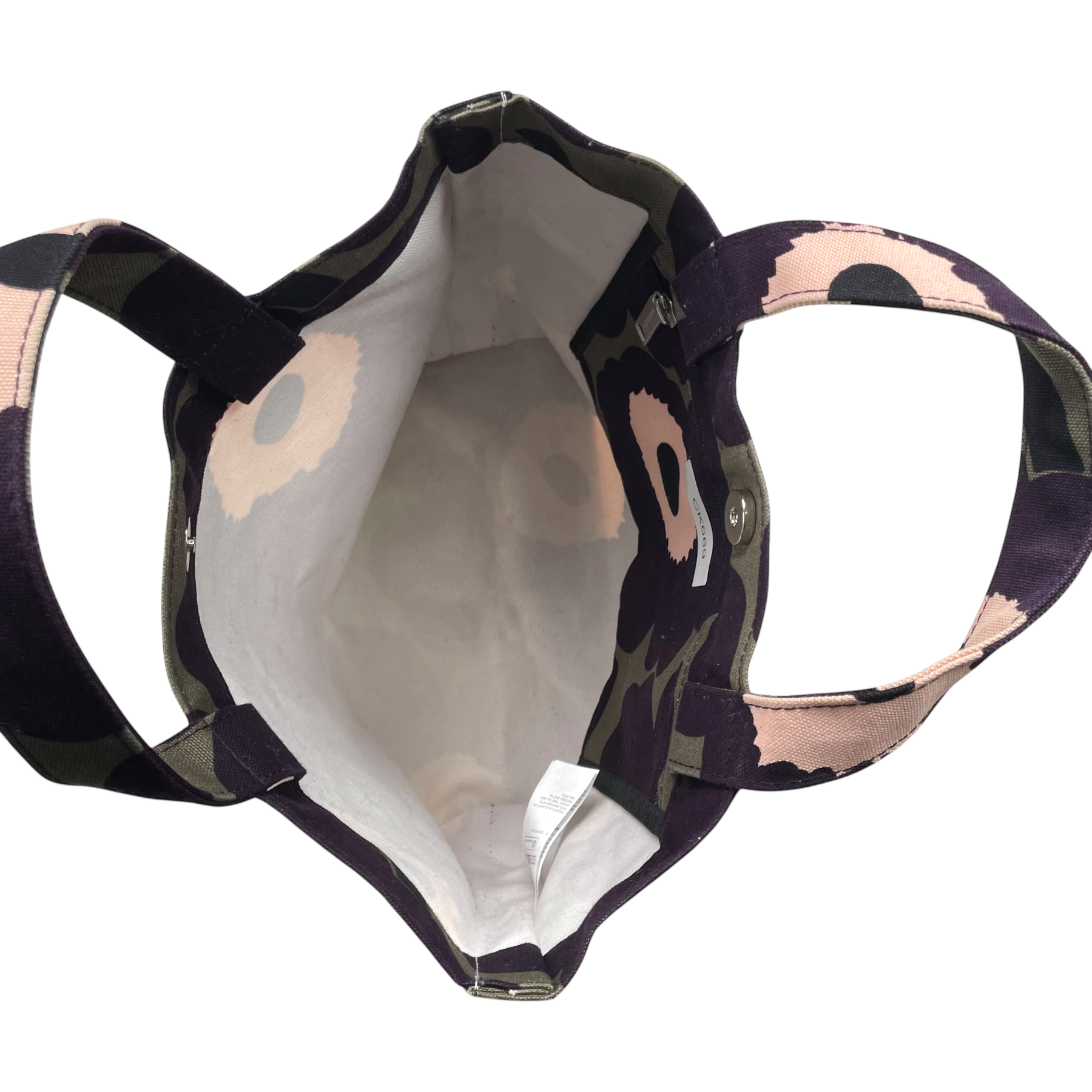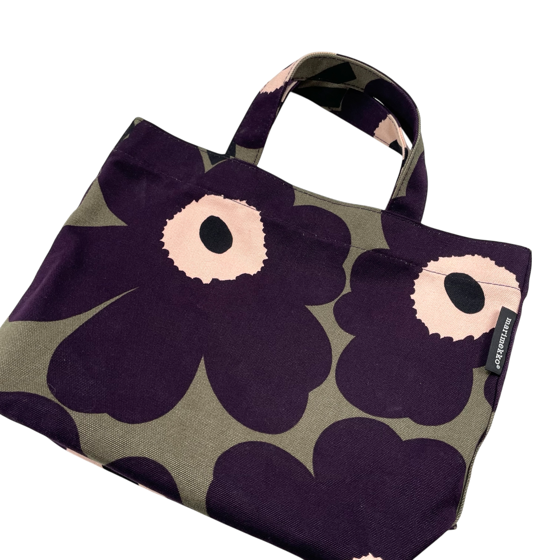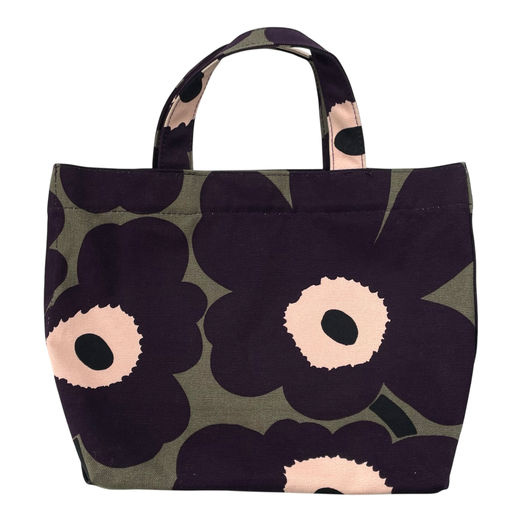 Marimekko Veronika Unikko canvas bag with two short handles. The bag has one magnetic closure and one smaller zipper closure pocket on the inside.
