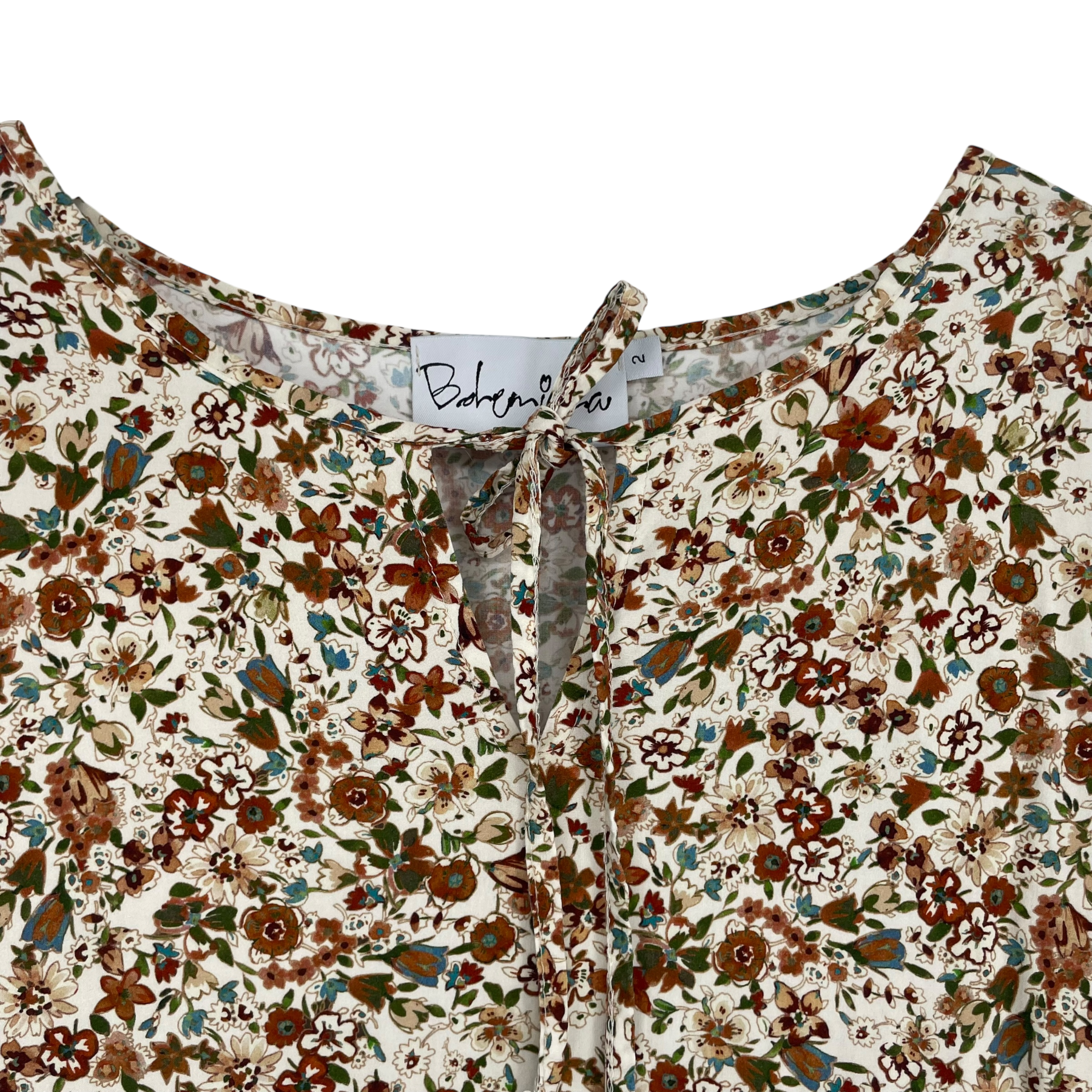 Bypias Bohemiana long sleeve flowy dress in flower print. The sleeves have elasticated cuffs and there is a bow detail in the front. The style is oversized and it is midi/maxi length.
