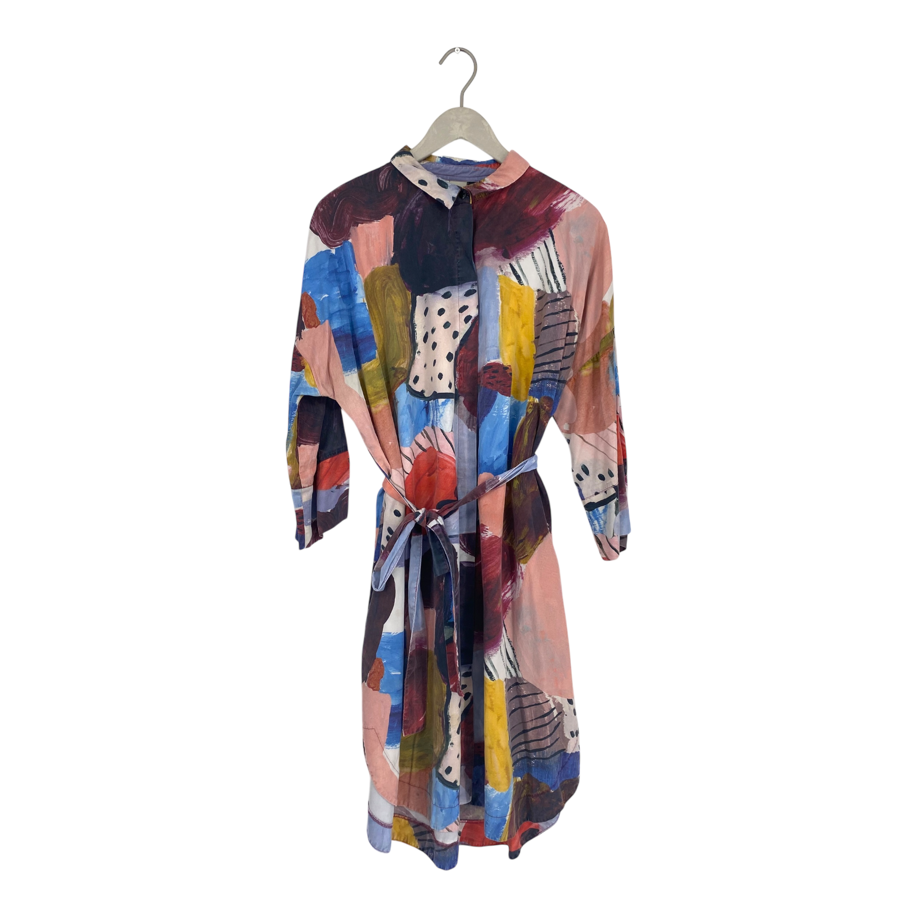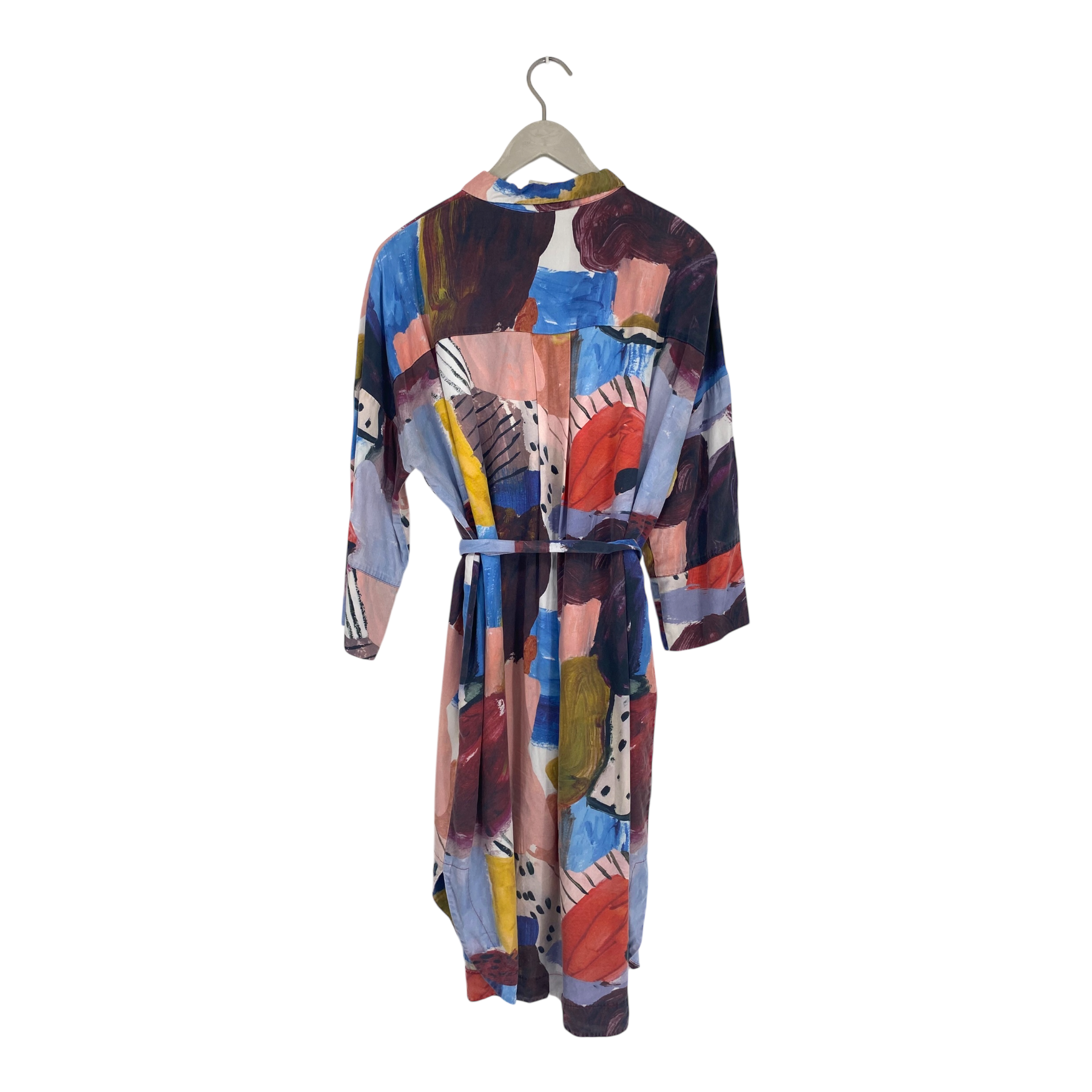 Papu women's woven lyocell button-up dress with collar. Hidden buttons down the front, separate fabric belt. Uneven hem is longer from the back. 3/4 sleeves.