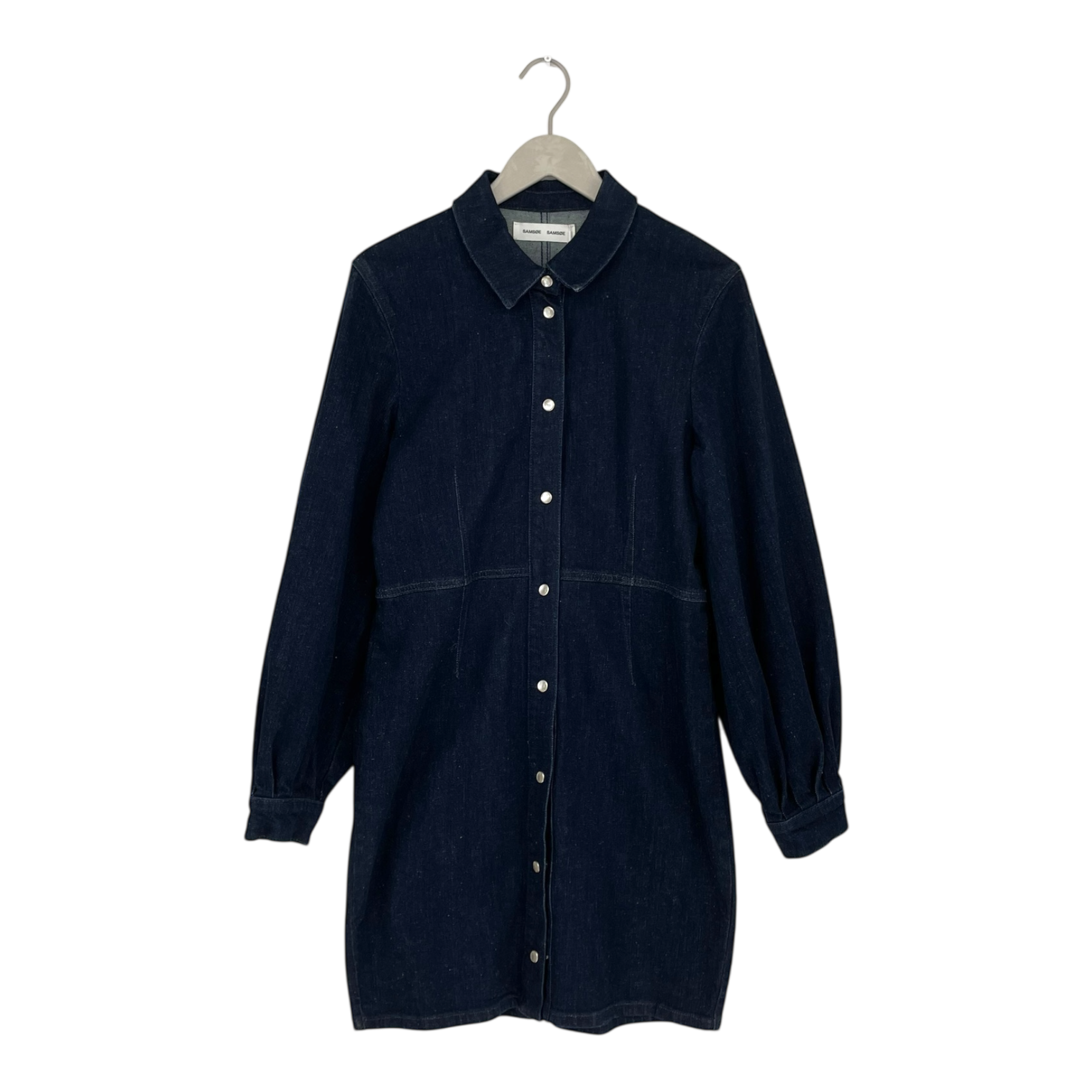 The Samsøe Samsøe Berthe dress features weighted buttons down the front, a classic collar, and beautifully voluminous puff sleeves. The silhouette is slim-fit.