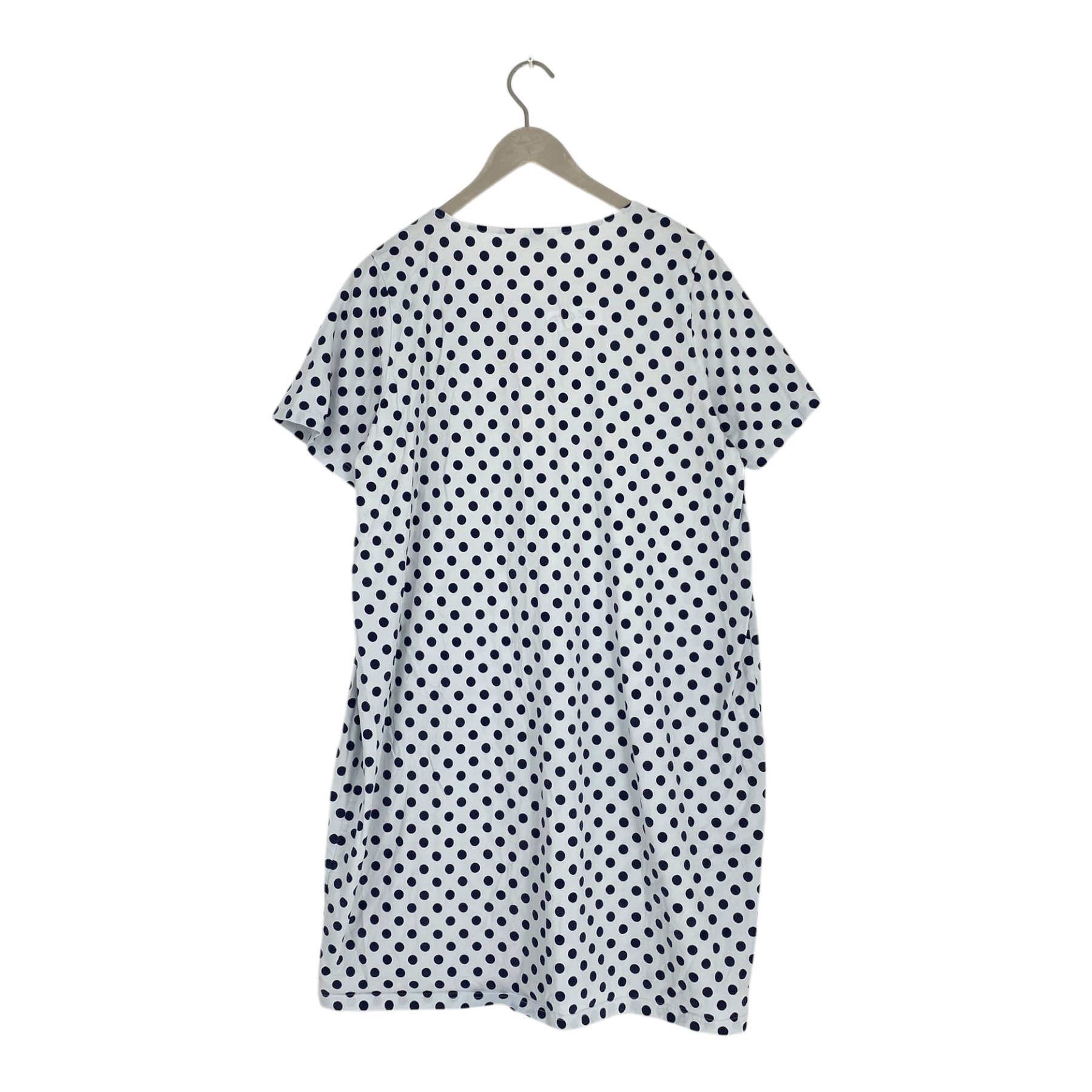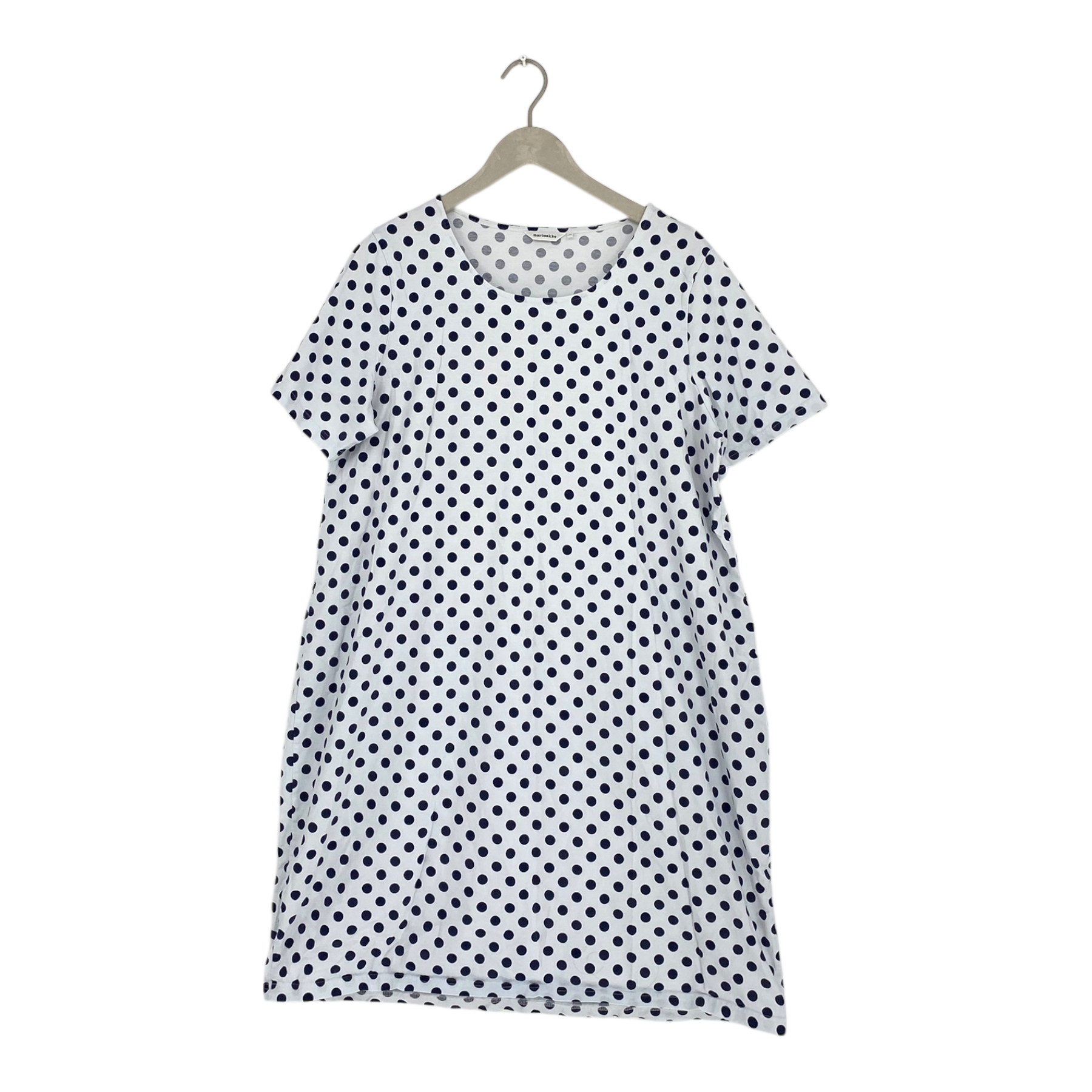Marimekko keskiyö dress with Pallo print short sleeves. The dress’s colors have blended slightly, so the white base color is not completely bright.