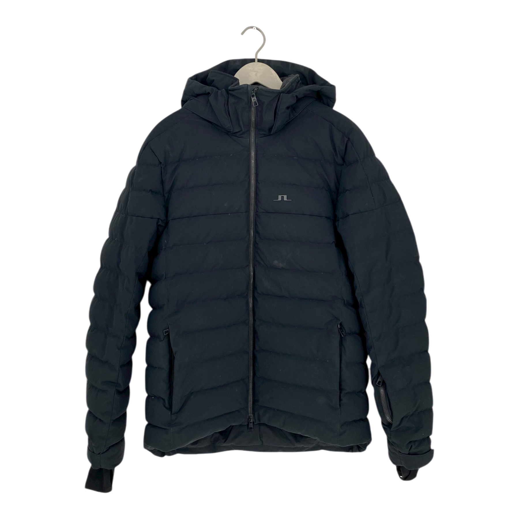 J.Lindeberg down outdoor jacket with a detachable hood, adjustable hem, and snow cuffs at the wrists. Overall in excellent condition, with only a few small marks that may be removable.