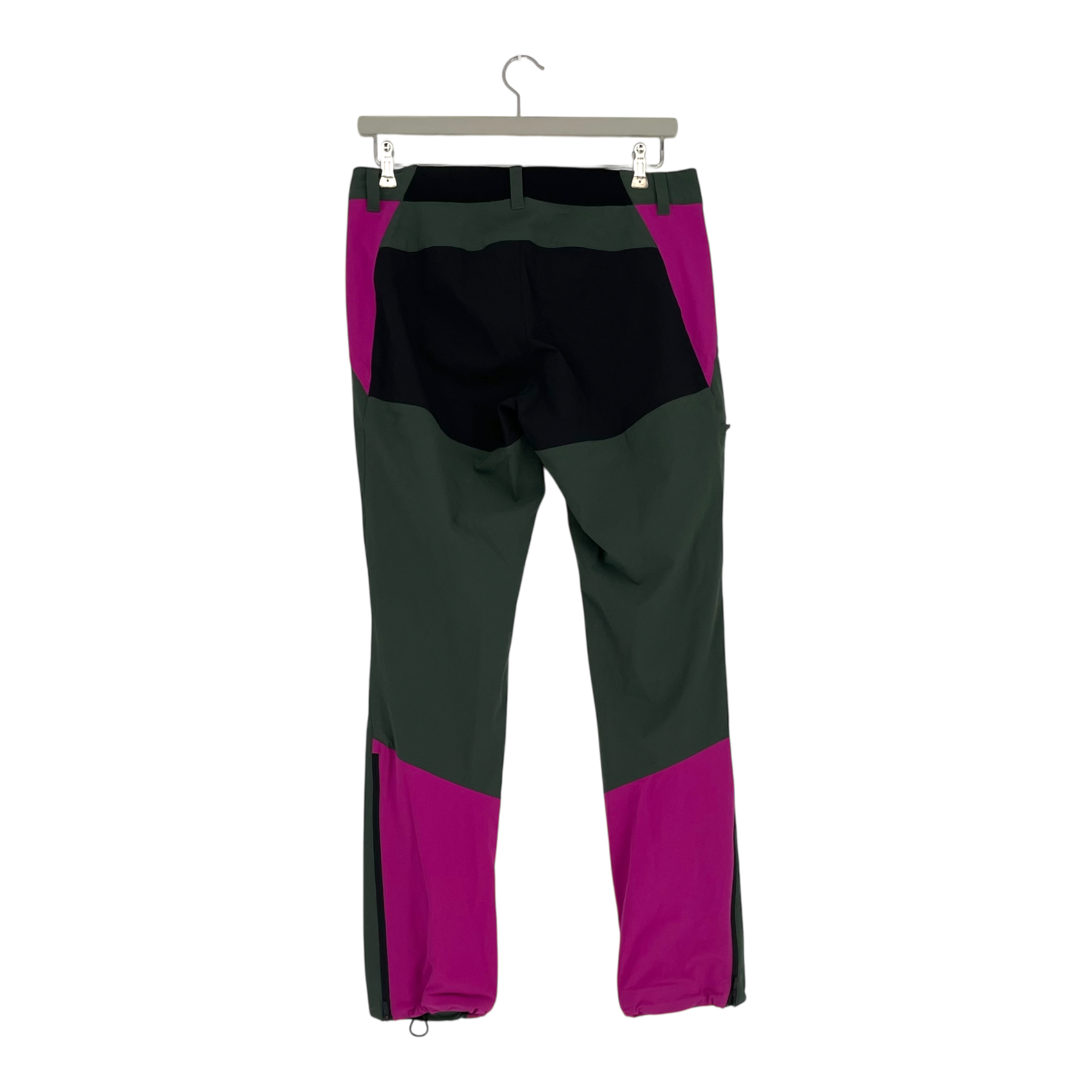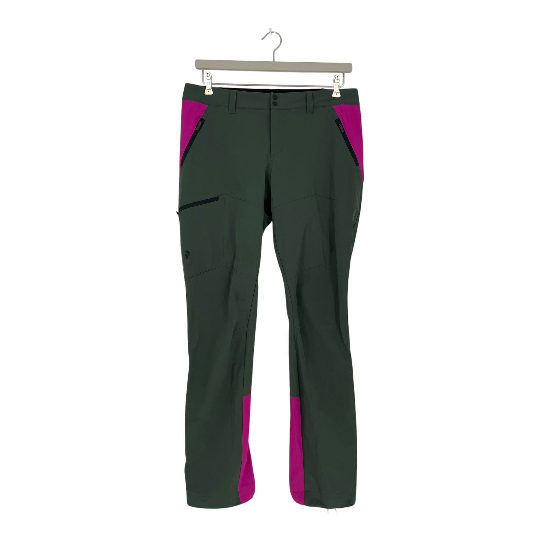 Peak Performance Scarb light softshell pants with side pockets, zip closure, elastic waistband, and one zip pocket. Adjustable elastic in the cuffs and long zipper on the back of legs.