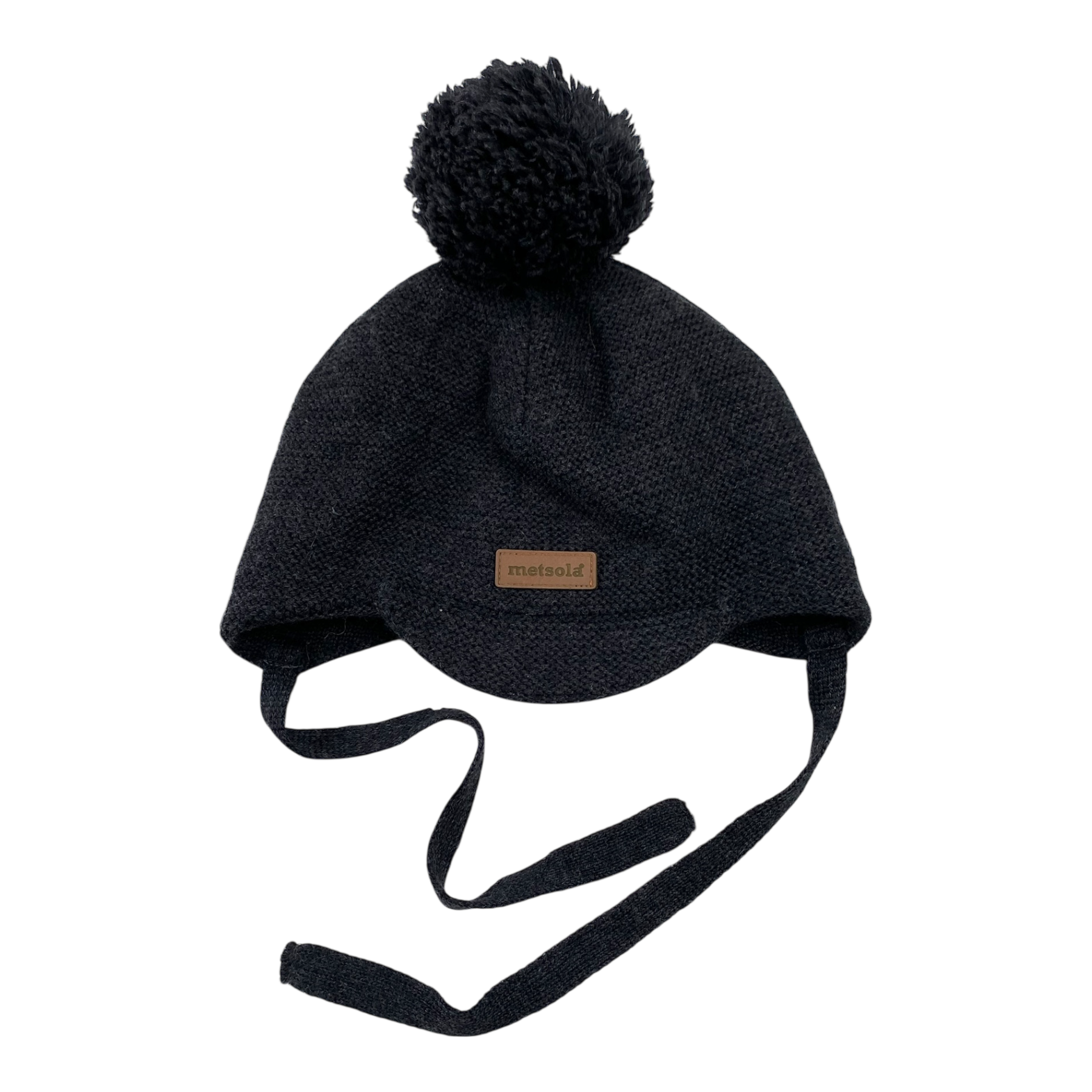 Metsola knitted merino beanie with a pompom, a small cap and strings to tie with. The material has fluffed in use.