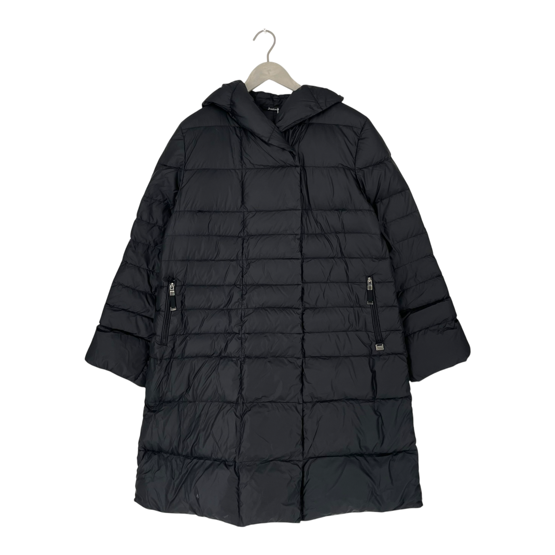 Joutsen Wilja jacket is a down jacket that has a horizontal stitching. There is two side pockets with zippers and a snap button closure in the front. The hood can be worn down or up according to the weather and the sleeves can be rolled up for a better fit.