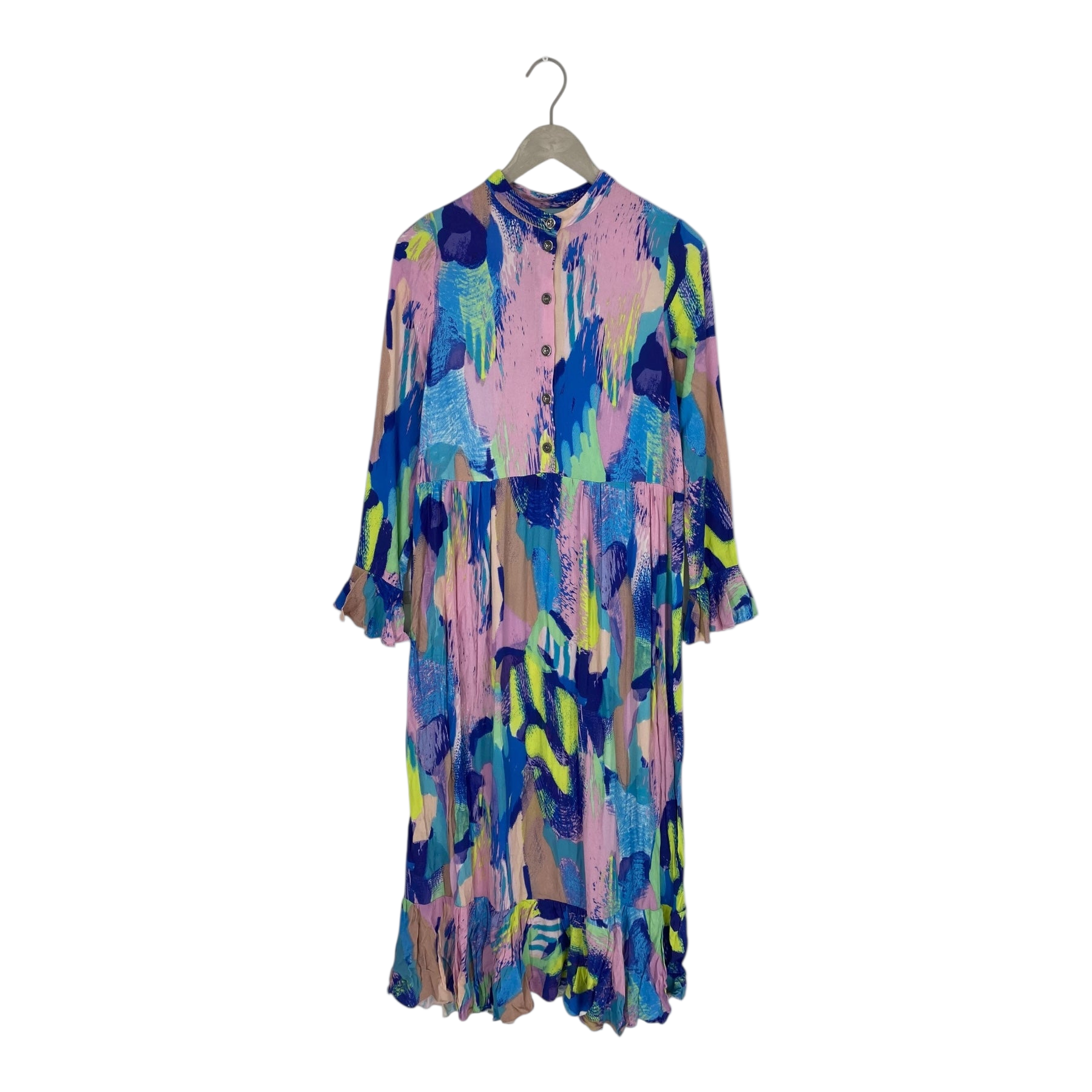 Vimma long sleeve dress with buttons in the front with ruffles on hemline and sleeves. Sizing runs slightly smaller, around the bust measurement is 90 cm.