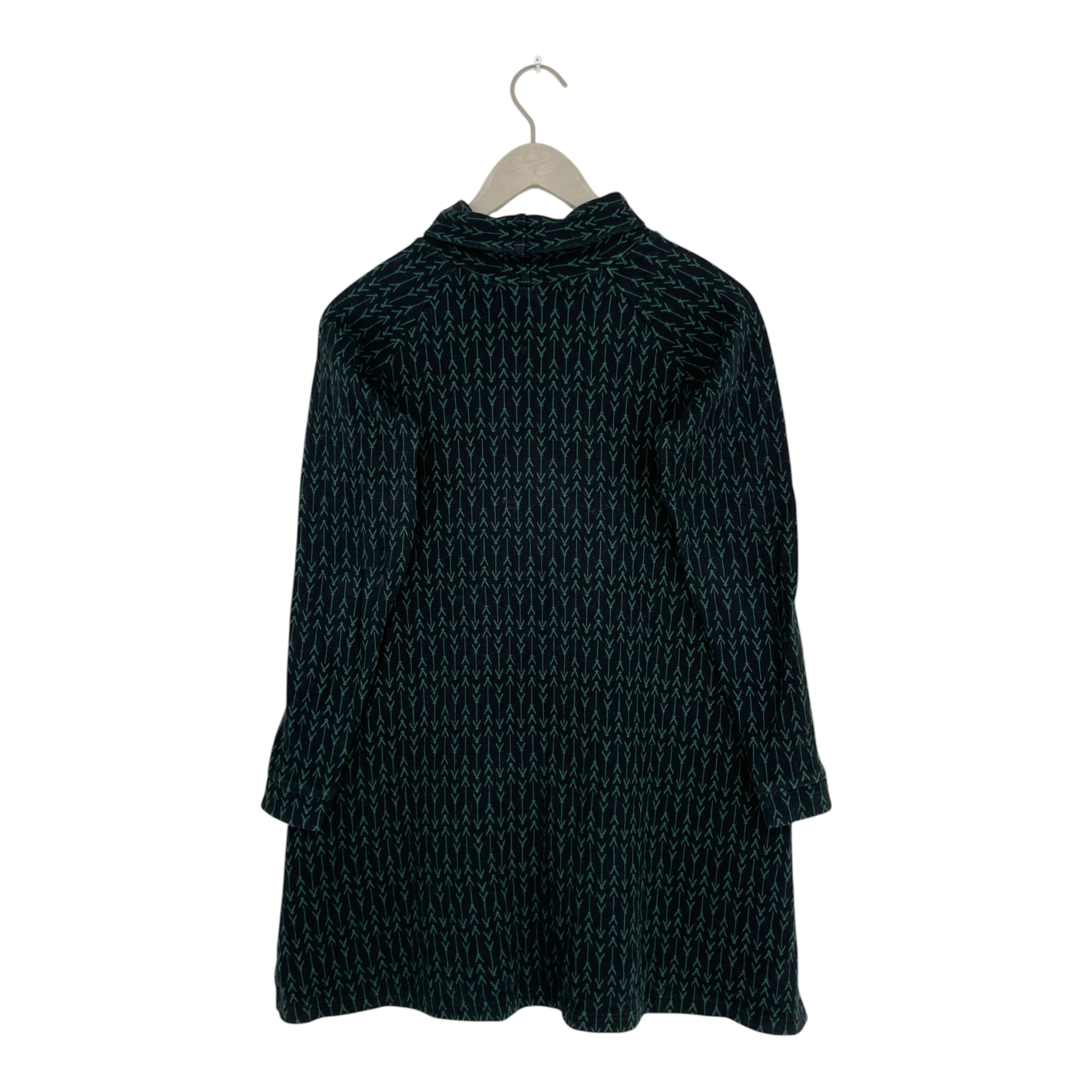 Nouki polo collar tunic with long sleeves and pockets on the front in an abstract, green pattern. Slight fluffing on the surface of the fabric.