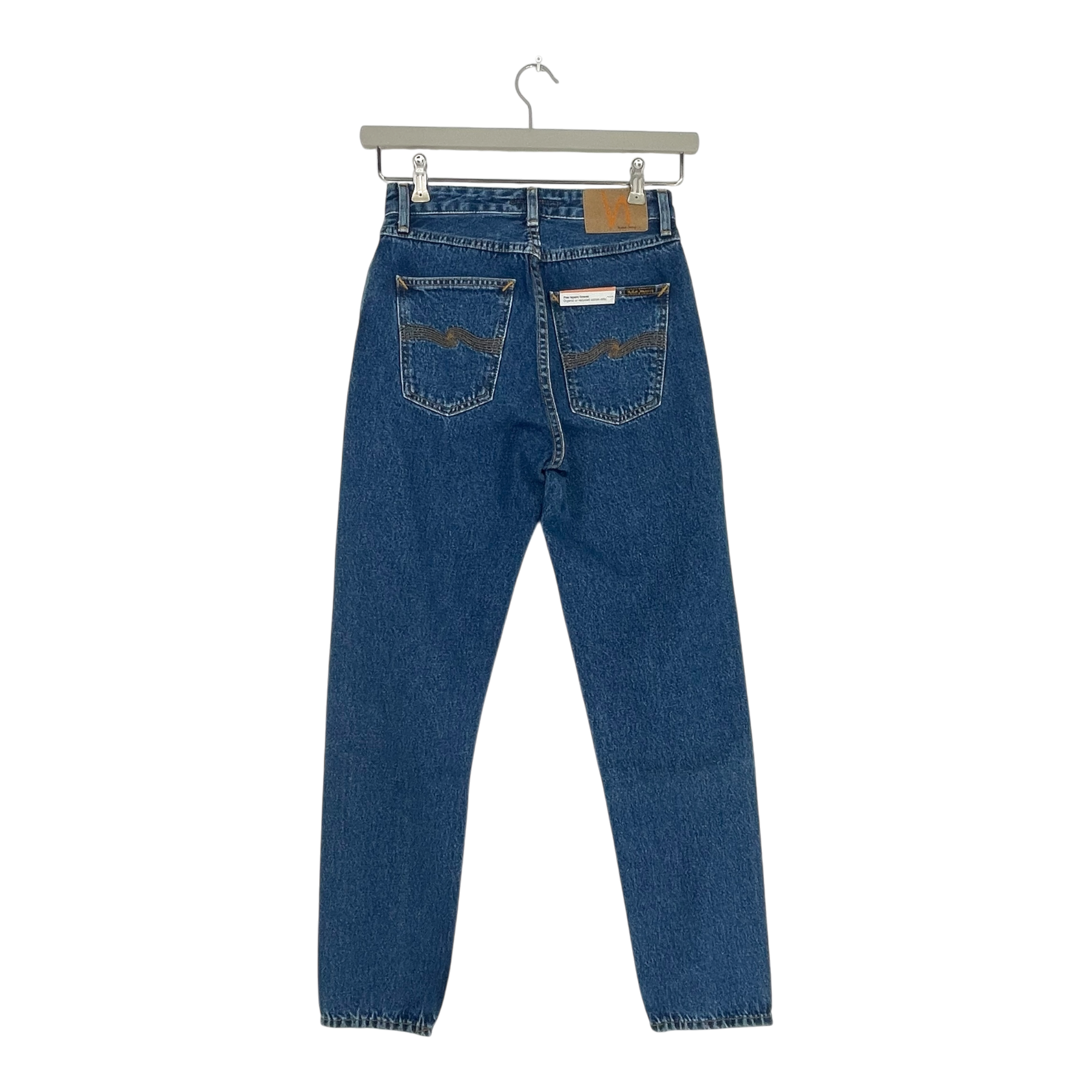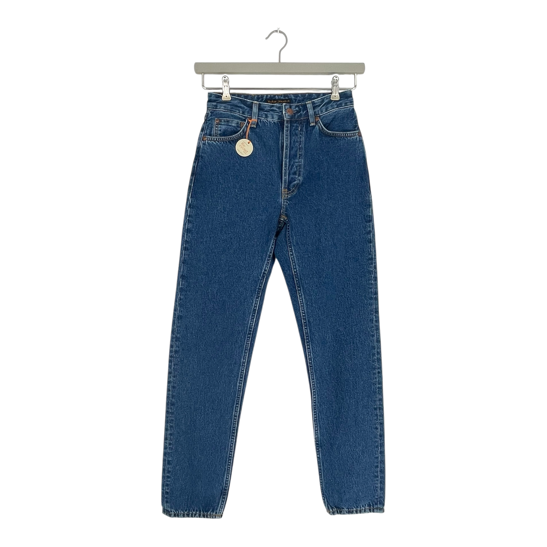 Nudie Jeans high-waisted slim fit jeans with classic five-pocket construction and button fly closure. Features a tapered leg silhouette and mid-blue wash.