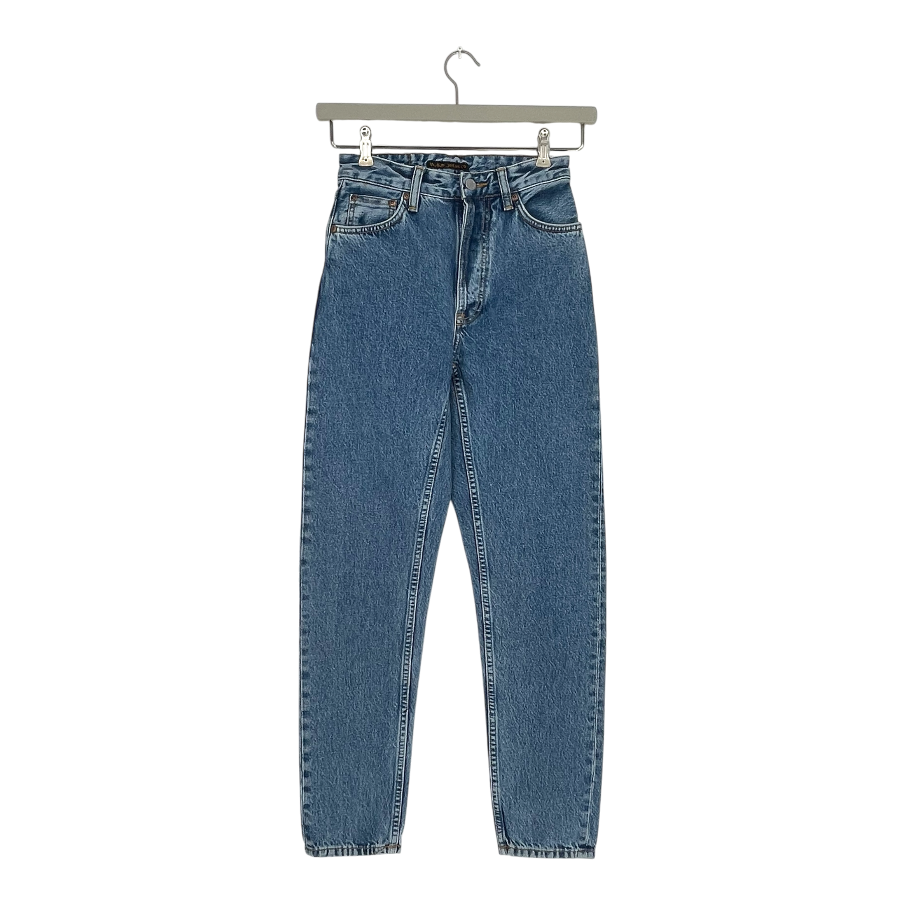 Nudie Jeans high-waisted slim fit jeans with classic five-pocket construction and button fly closure. Features a tapered leg silhouette and mid-blue wash.