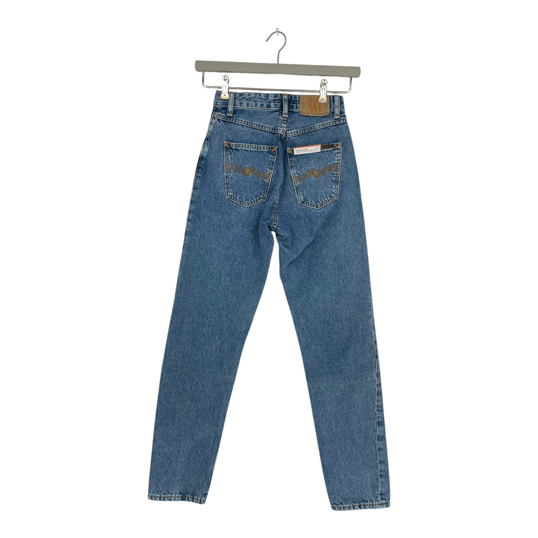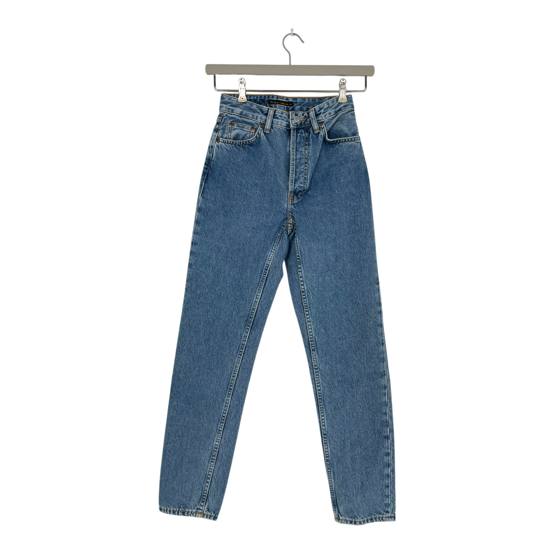 Nudie Jeans high-waisted slim fit jeans with classic five-pocket construction and button fly closure. Features a tapered leg silhouette and mid-blue wash.