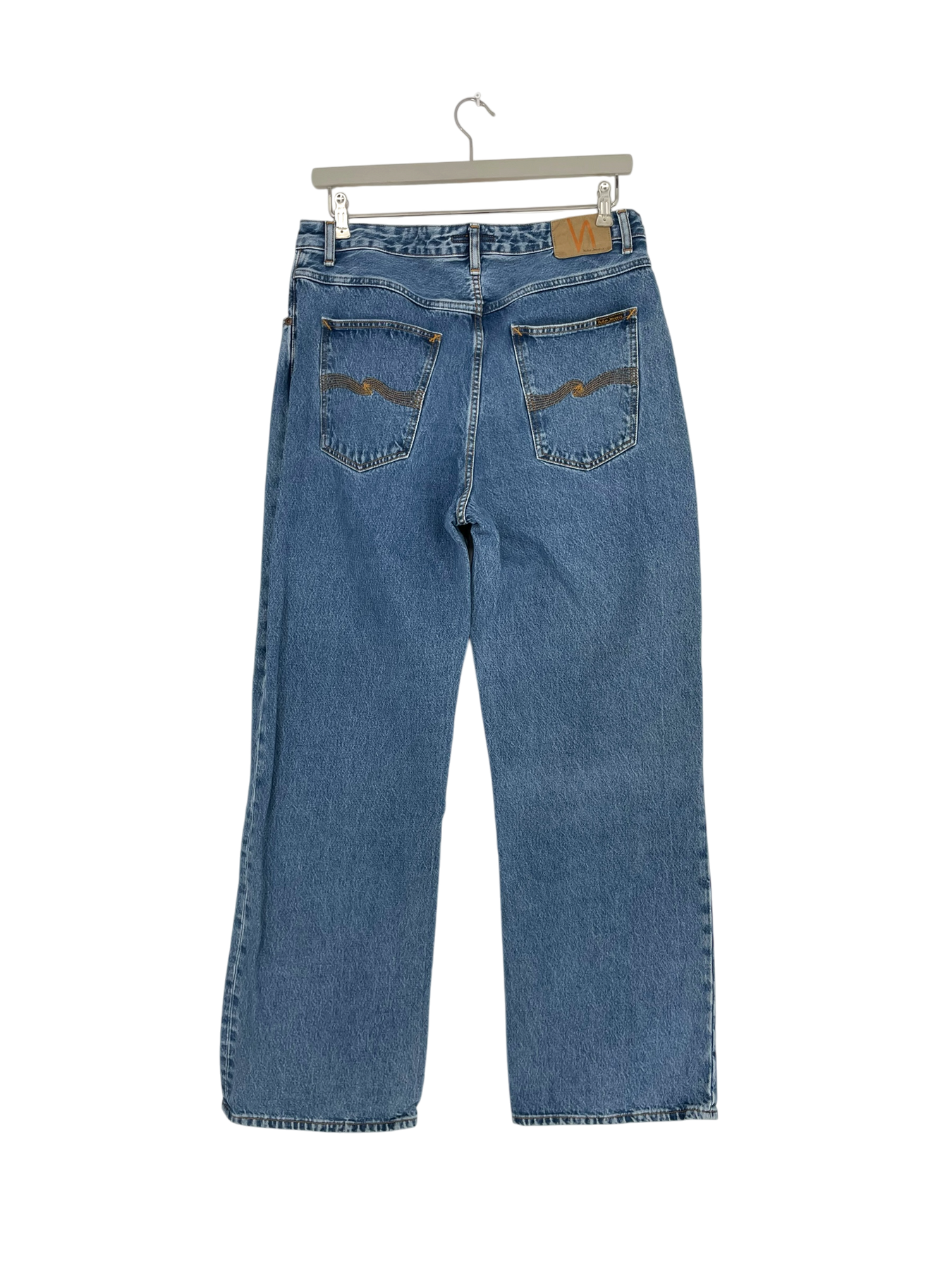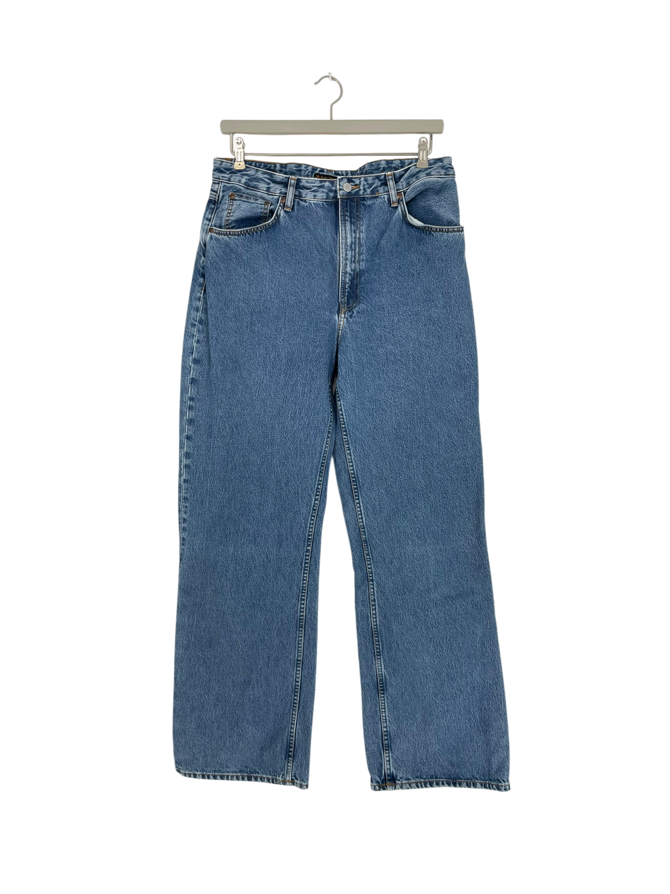 Nudie Jeans women's Clean Eileen casual blue jeans are high waist jeans with wide legs. There is some glue on the laundry tag.