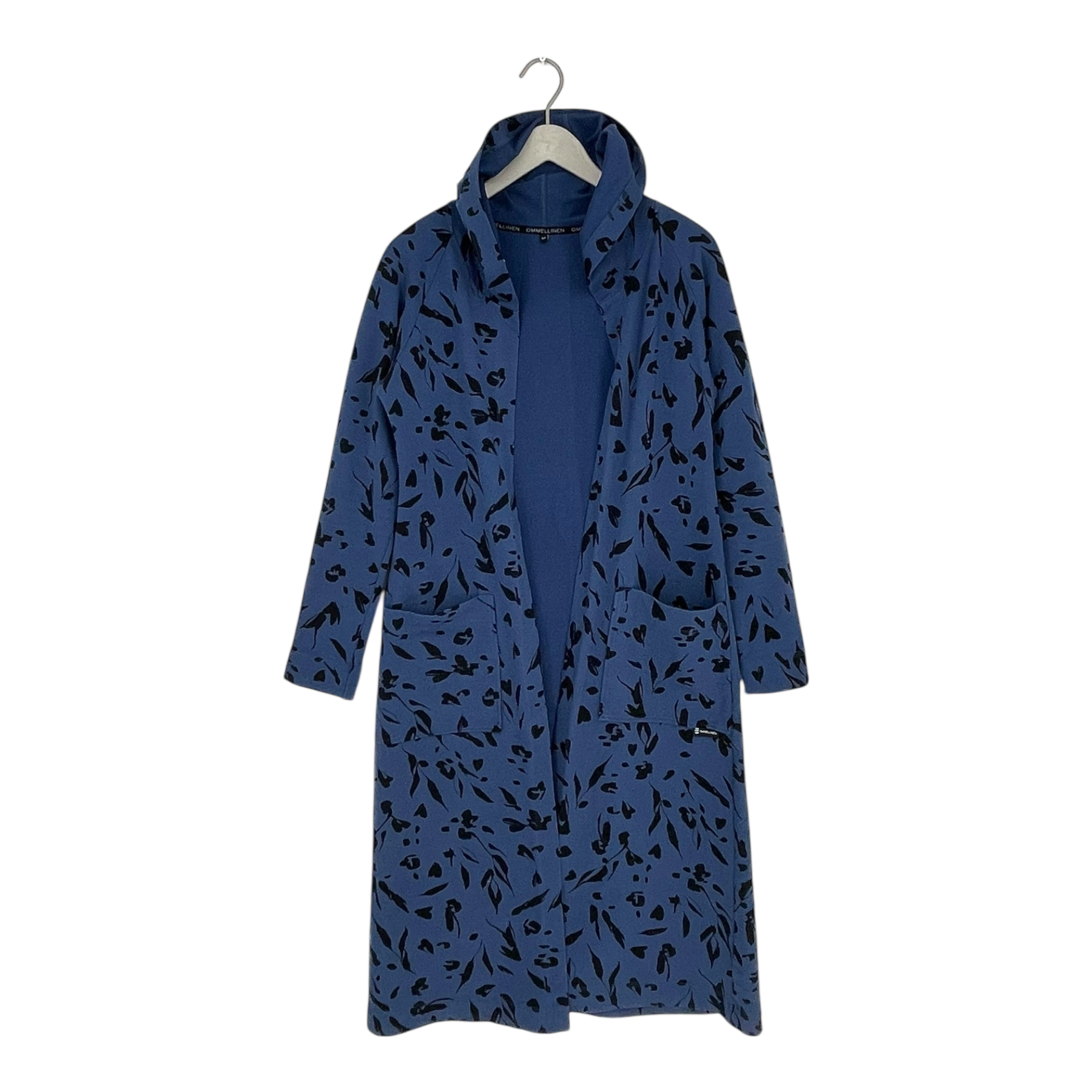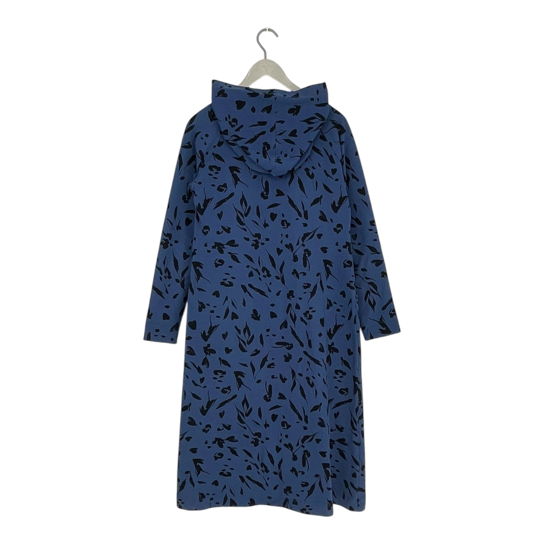Ommellinen hoodie coat without a front closure. The coat is long, reaching about knee-length, and features a hood. There are two pockets at the front. The silhouette is A-line with a relaxed fit.