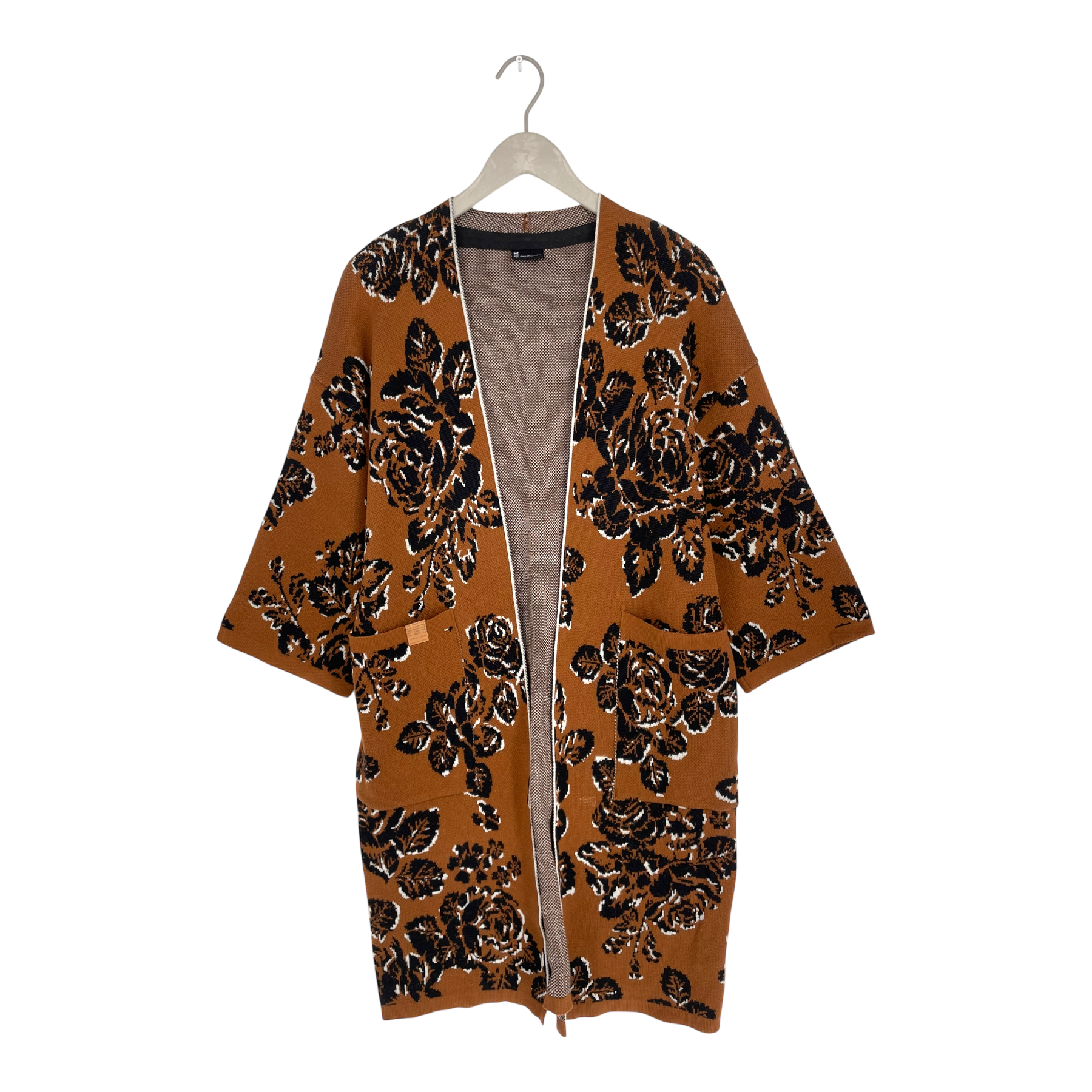 Ommellinen merino wool cardigan in rose print. Cardigan has 1/2 long sleeves and pockets on the front.