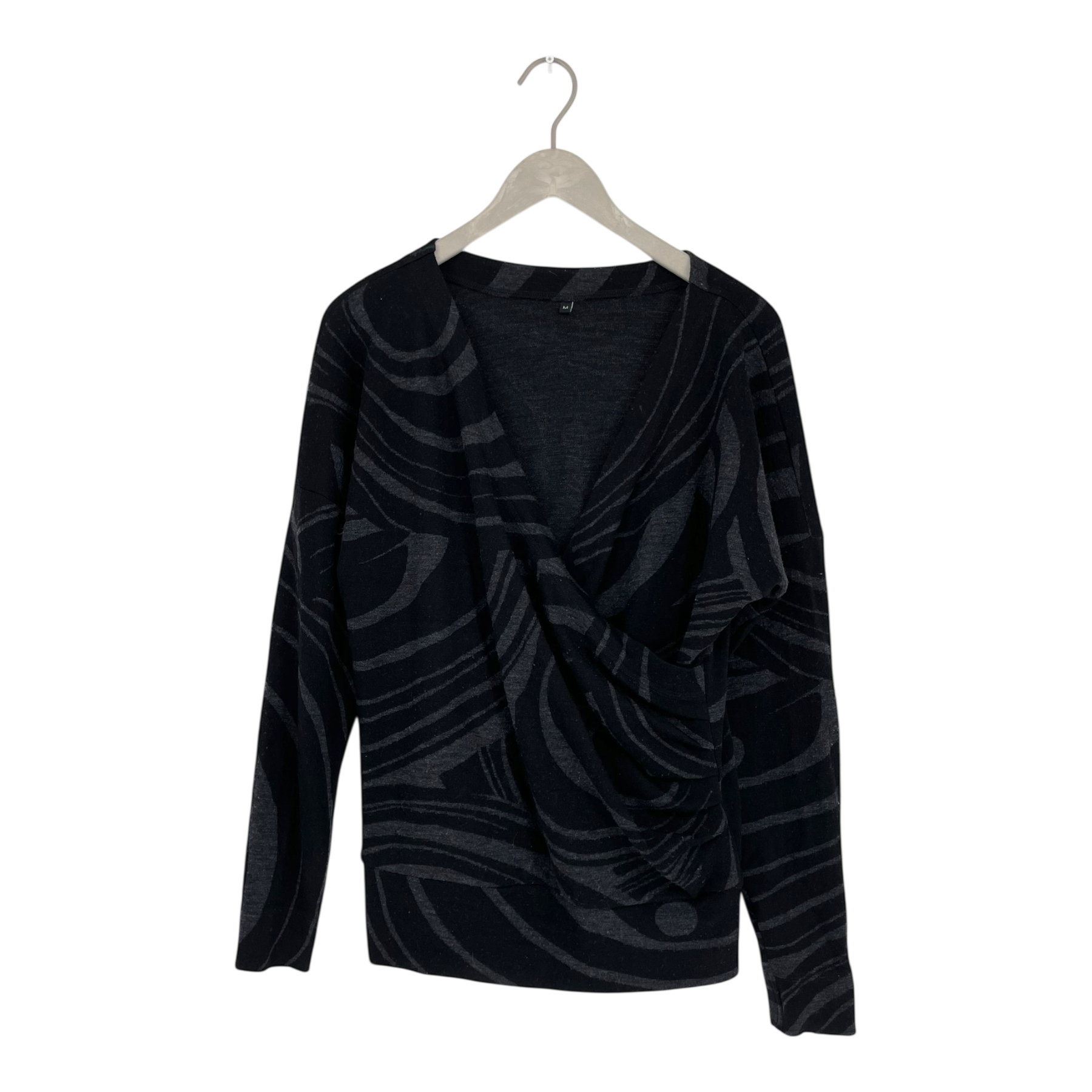 Ommellinen merino wool shirt with a wide wrapped v-neck collar and long sleeves in an abstract pattern.