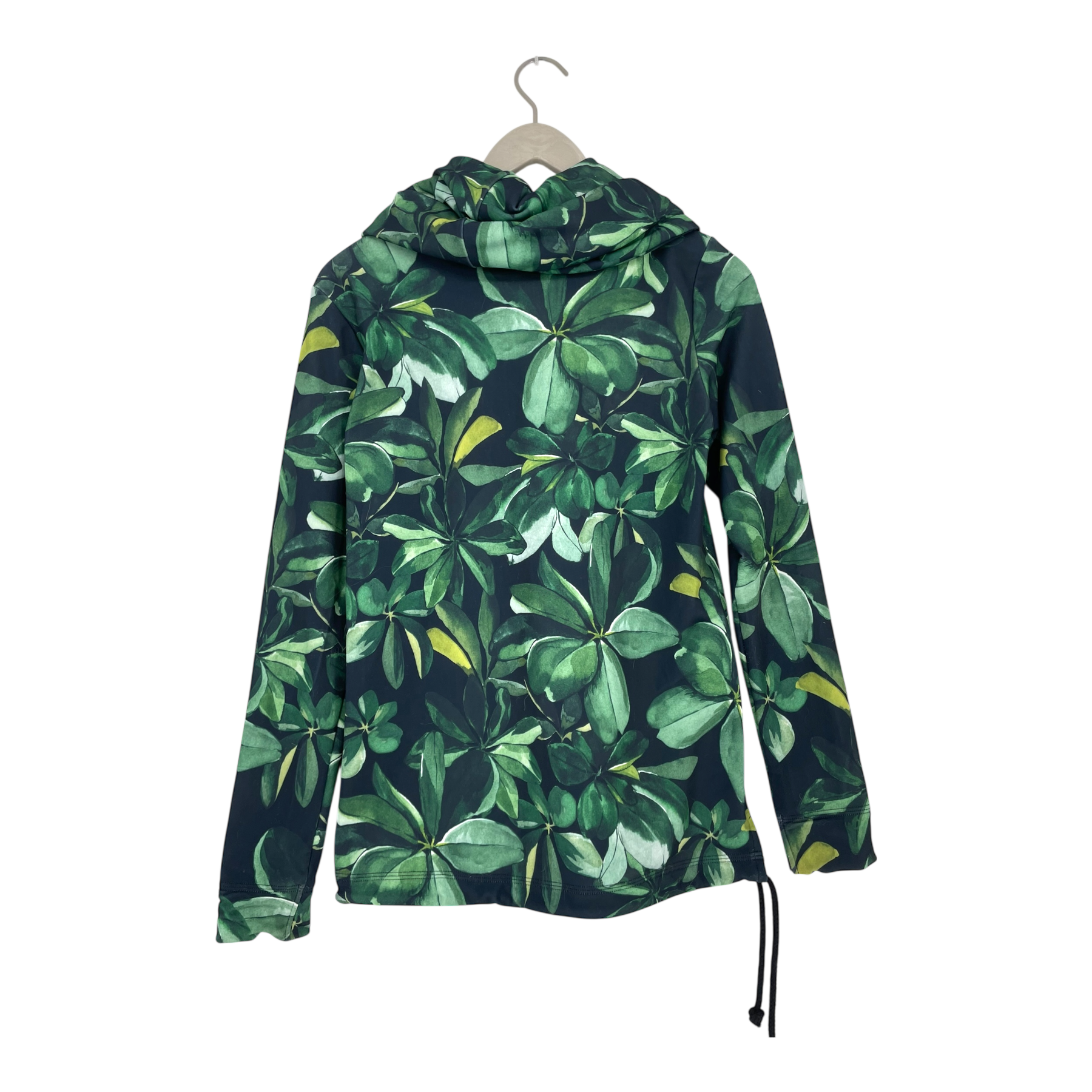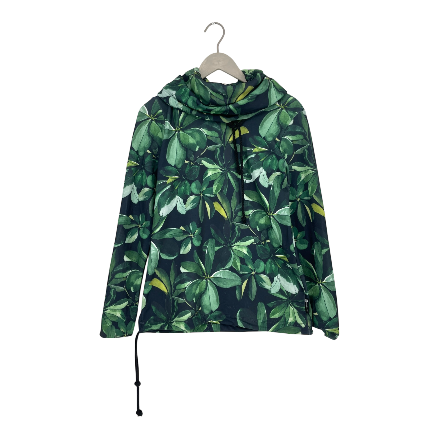 Ommellinen turtle neck shirt in green leaves print. The shirt has a high and wide collar, straight sleeves with adjustable string on the bottom side of the shirt and also on the collar.