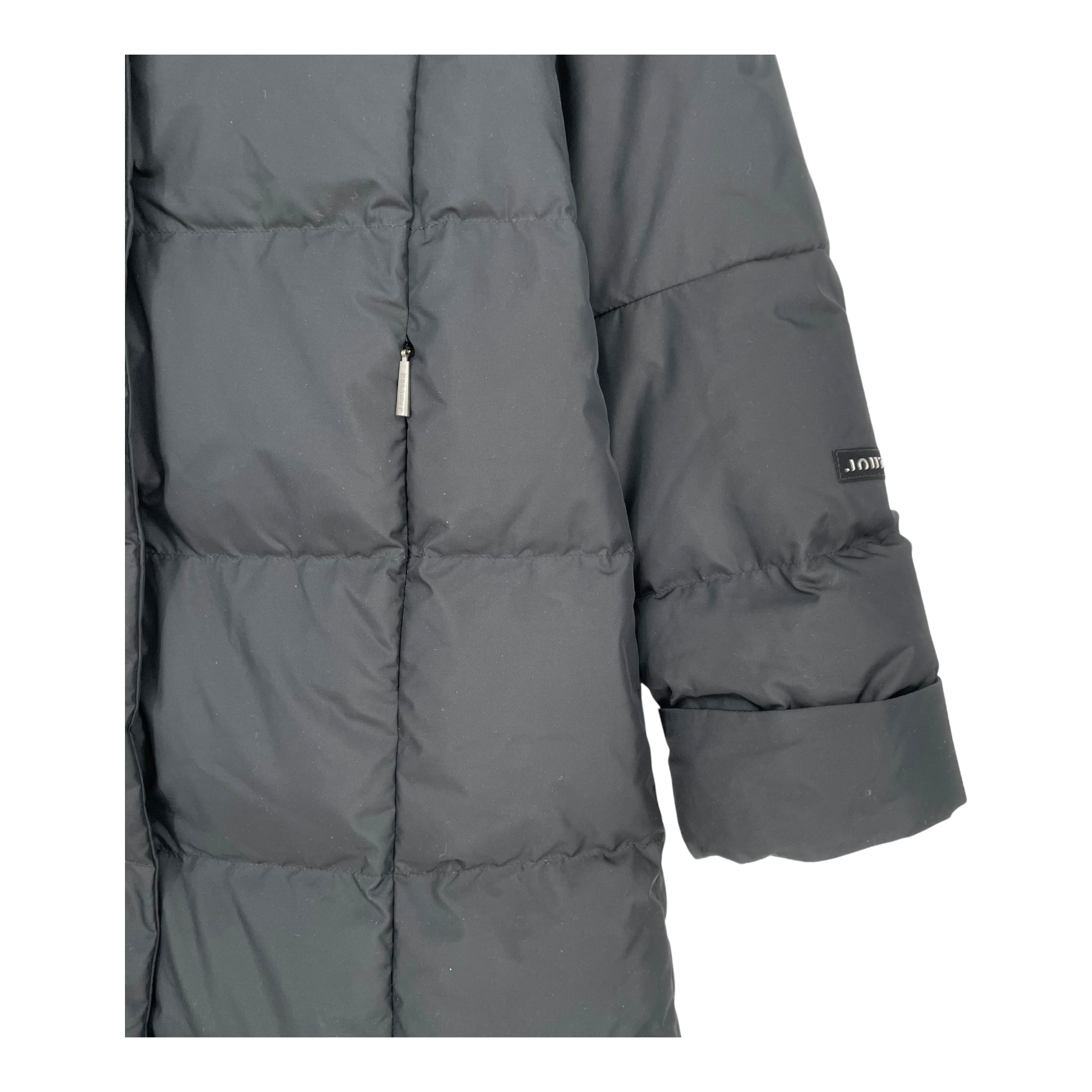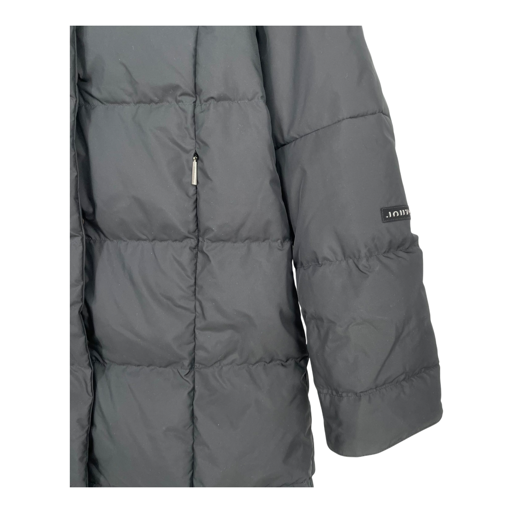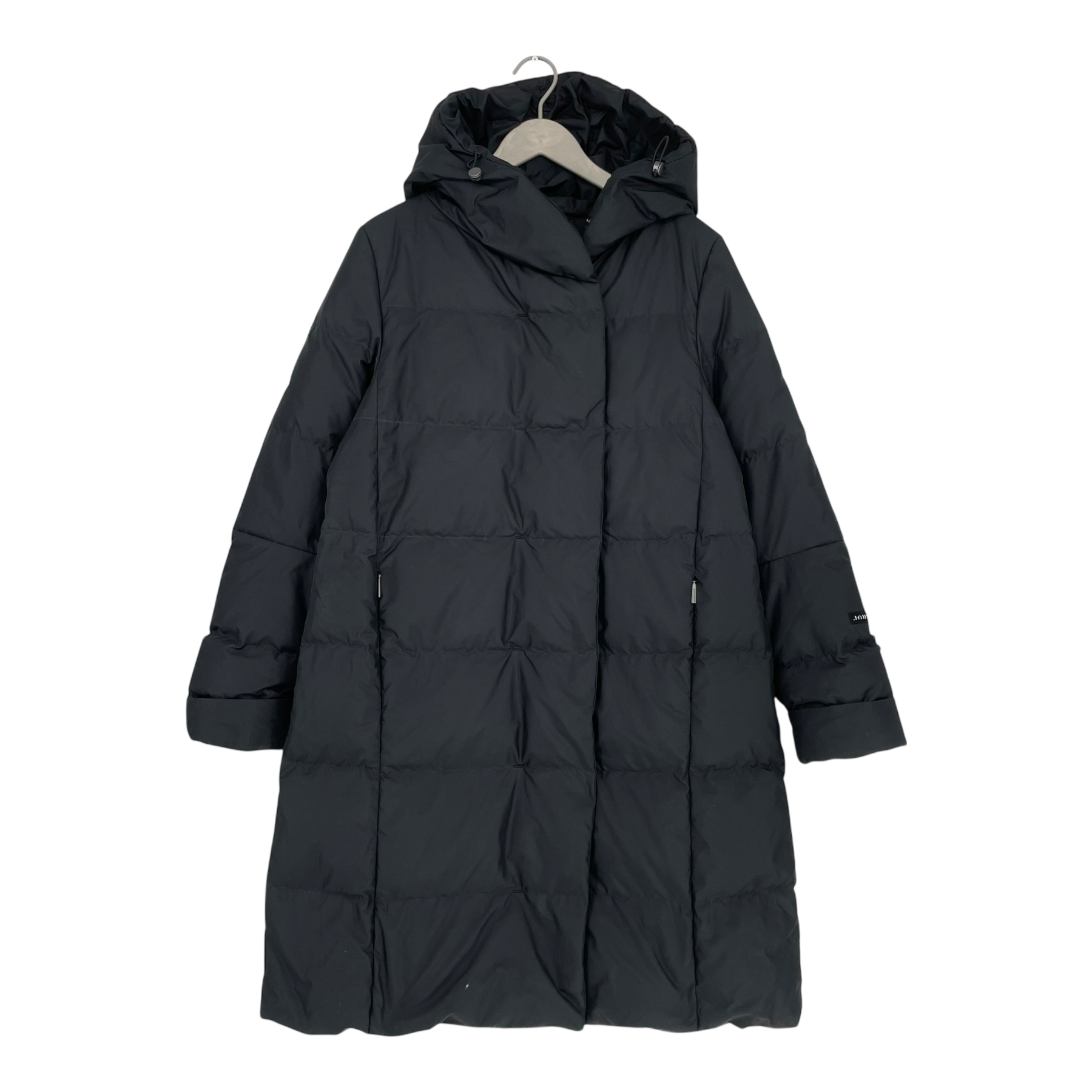 Joutsen Tuuli jacket is a down jacket perfect for the colder weathers. There a large horizontal stitching and two front pockets with zippers. The snap buttons and the double-slider fastening zipper adds comfortability and daily functionality in the front. There is a large warm hood that can be worn up or down according to weather and an adjustable elastic. The sleeves can be rolled up for a better fit.