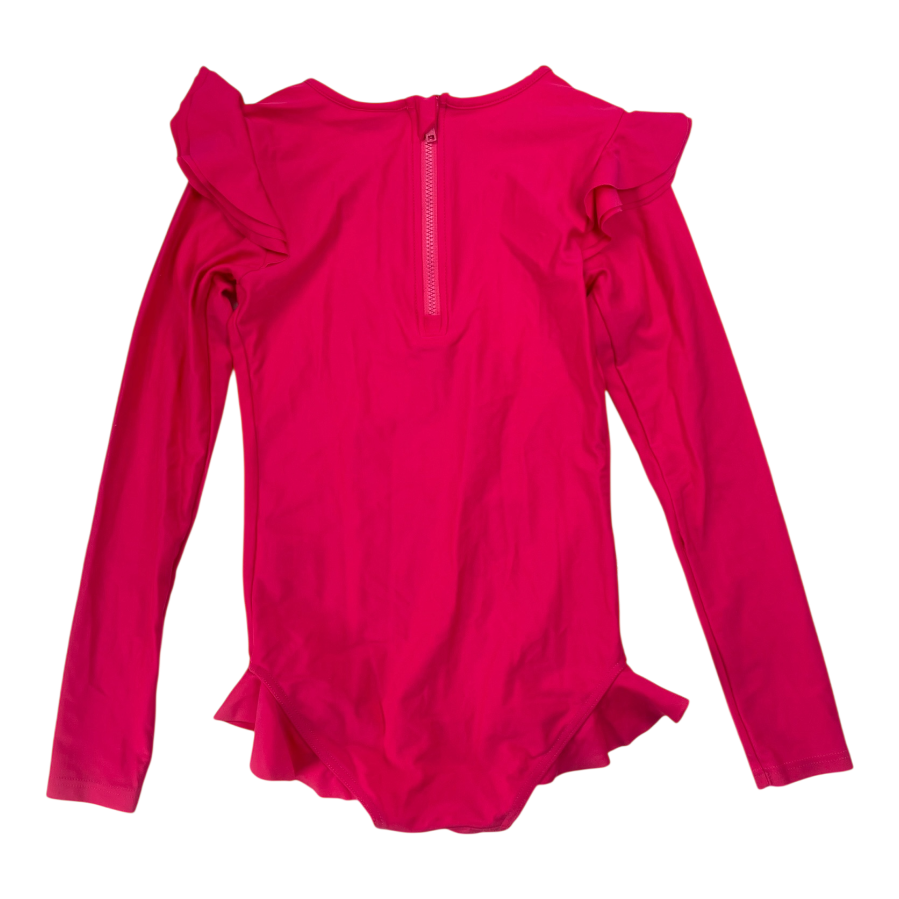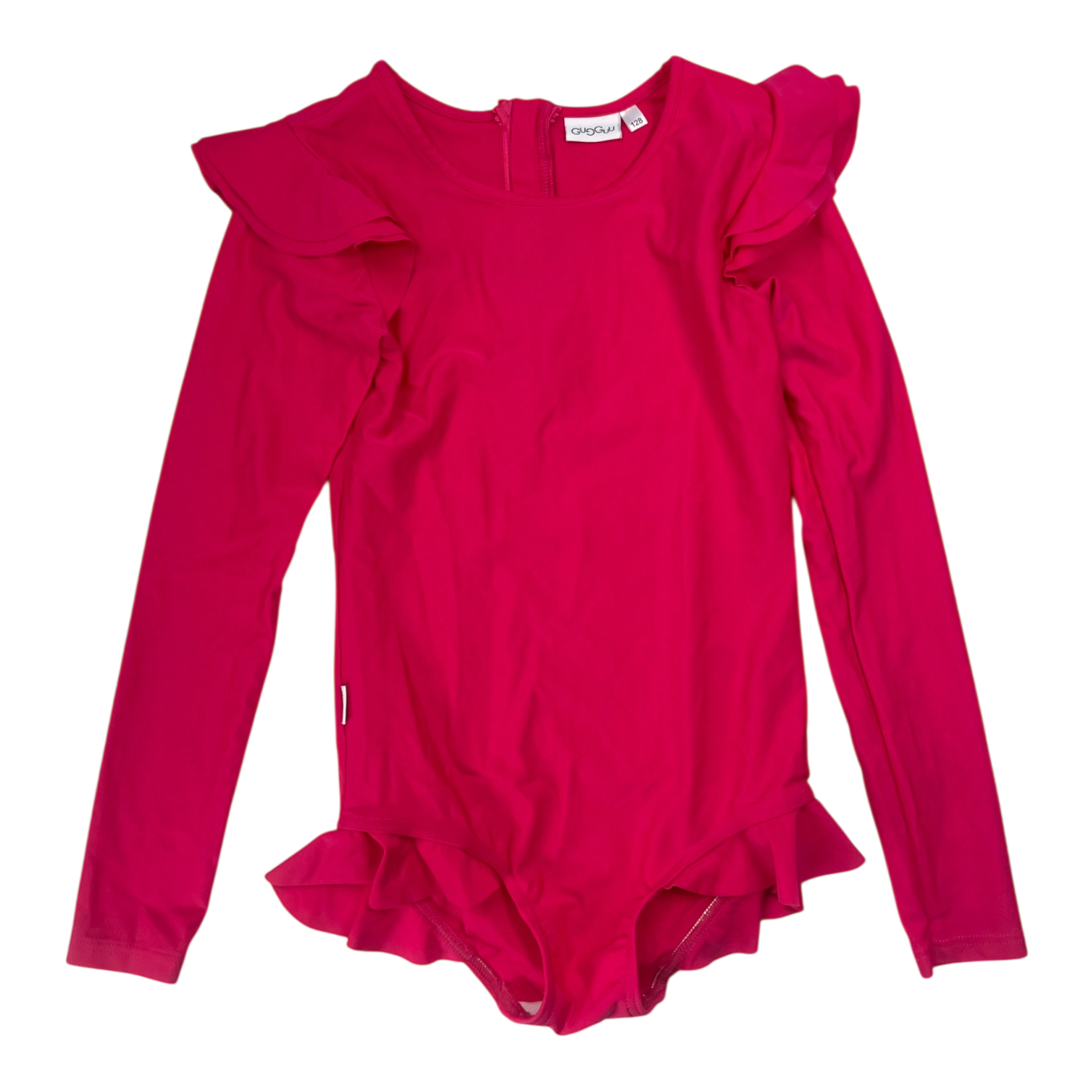 Gugguu swimsuit with frill details, zipper on the back. There is a spot on the sleeve where the threads have loosened a bit but there is no hole.