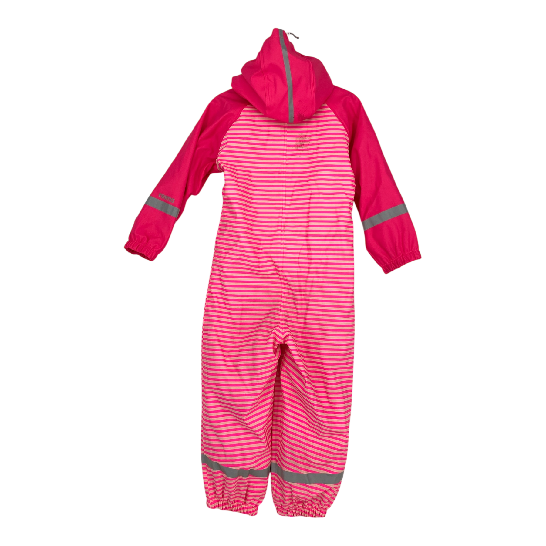 Reima Roiske rain overall with lining. Detachable hood and reflective details. The item has a stain on the back.