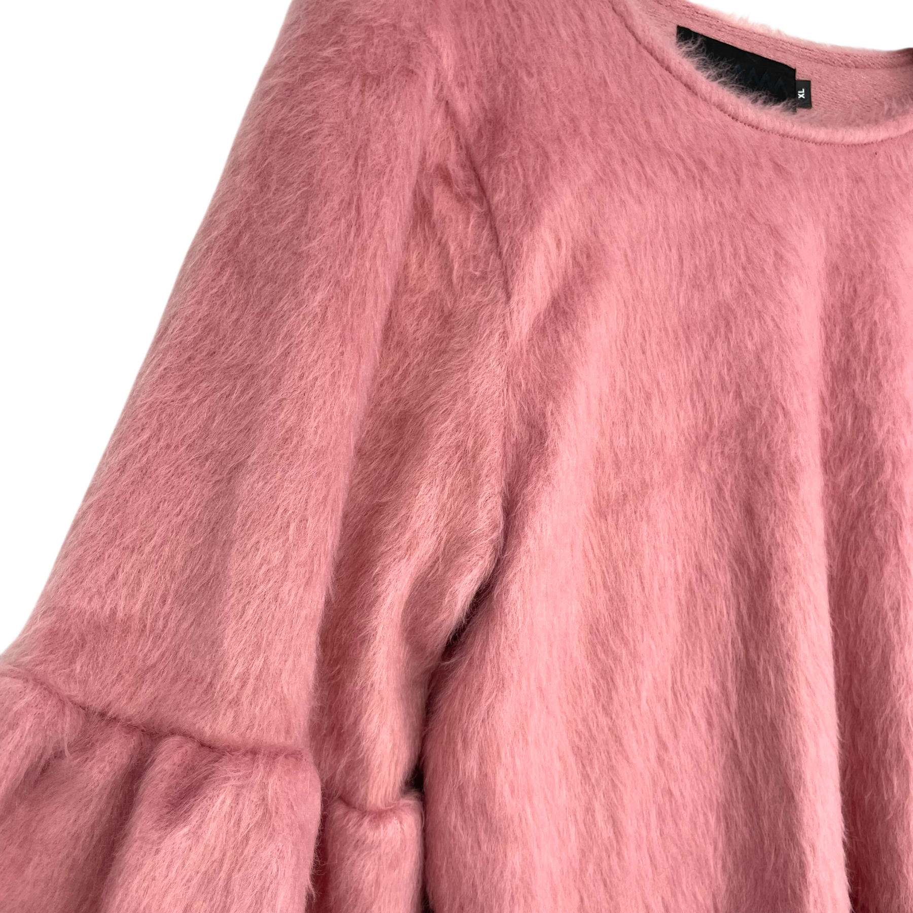Vimma Kukka dress in a pink, fuzzy textured material. The dress features a round neckline, a dropped waistline, and flared bell sleeves.