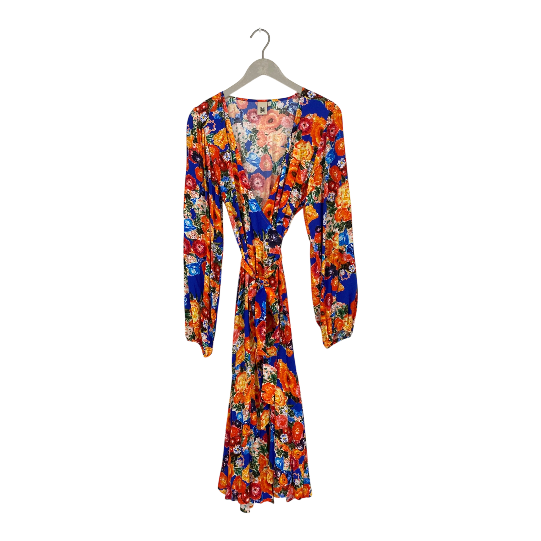 The stylish and feminine Kaiko Wrap Dress is made from beautifully draping woven crepe fabric. The dress features a flattering wrap design, with a waist-defining tie closure that allows you to adjust the fit to your liking. It has loose, full-length sleeves with gathered elastic cuffs, and pleats at the shoulders add beautiful volume to the sleeves. The hem falls at mid-calf length. The dress showcases a striking floral print, Marigold, where a rich blue background is adorned with layers of orange-hued flowers.