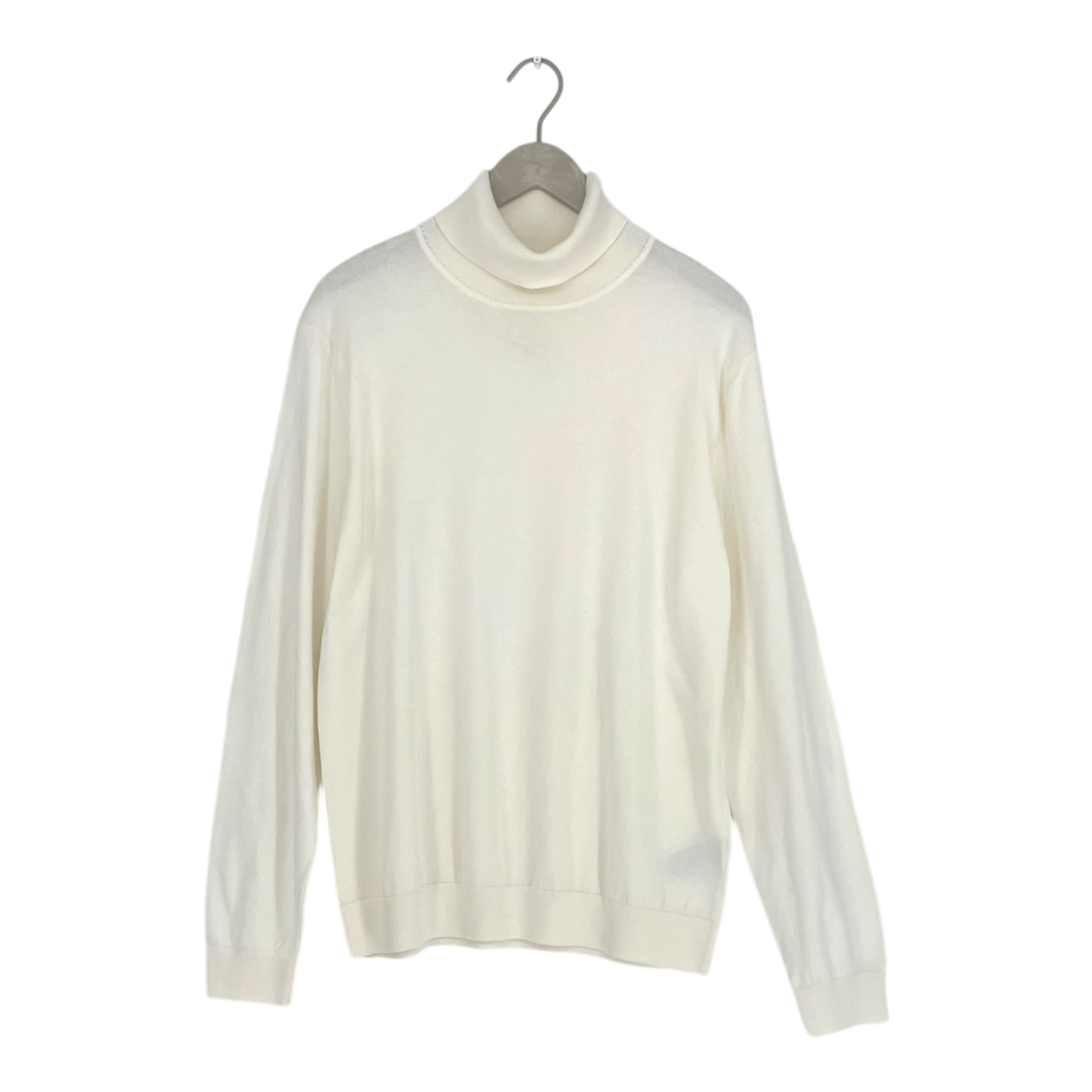 Armedangels long-sleeve turtleneck sweater in cream. Features a classic ribbed turtleneck collar and relaxed fit. Made from organic cotton.