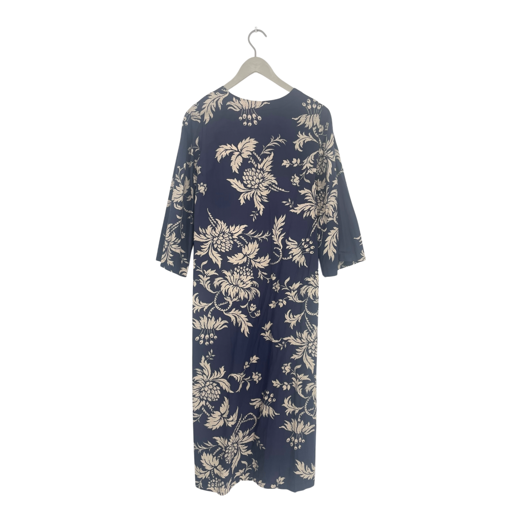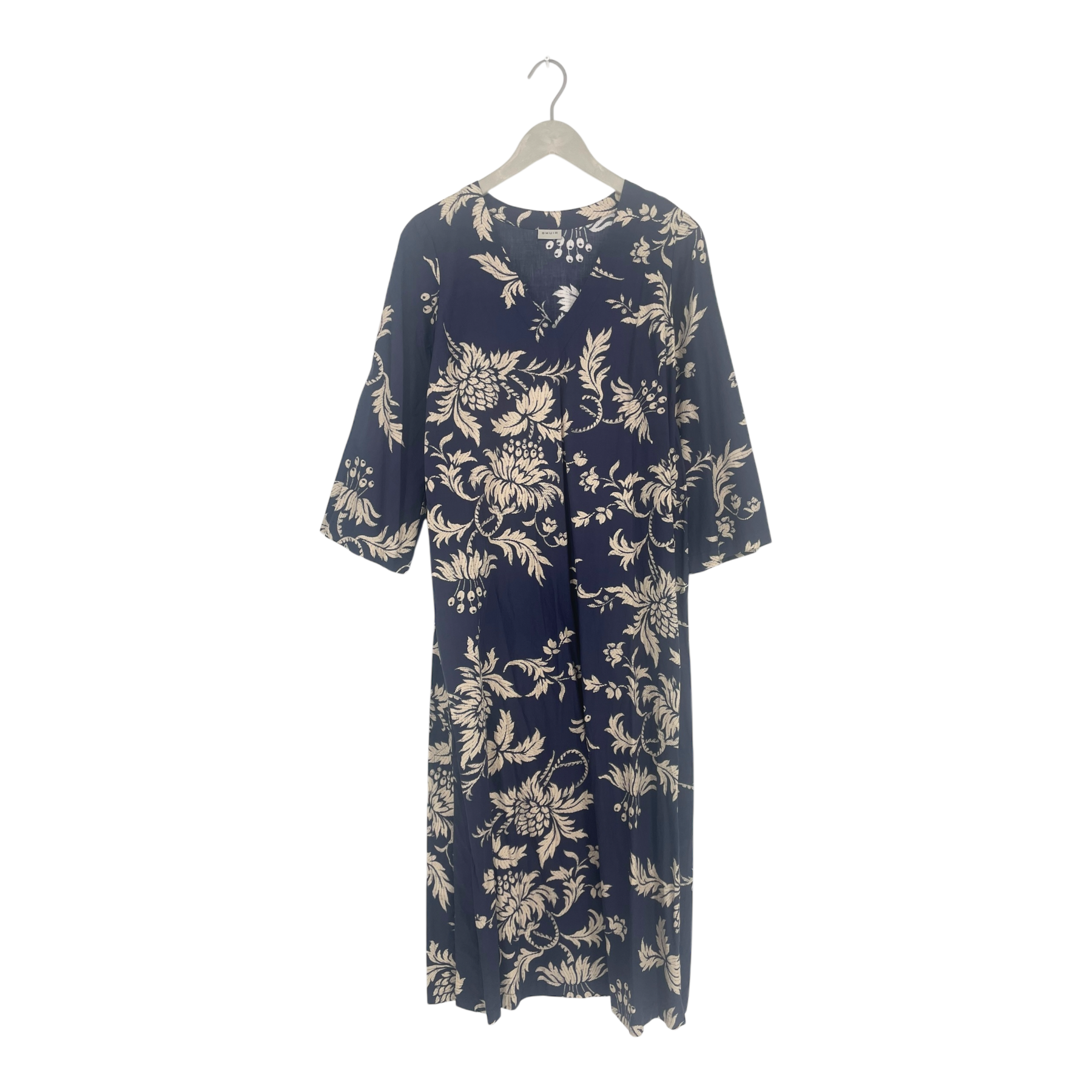 Balmuir long cotton dress with V-neck, 3/4 long sleeves, and high slits on both sides.