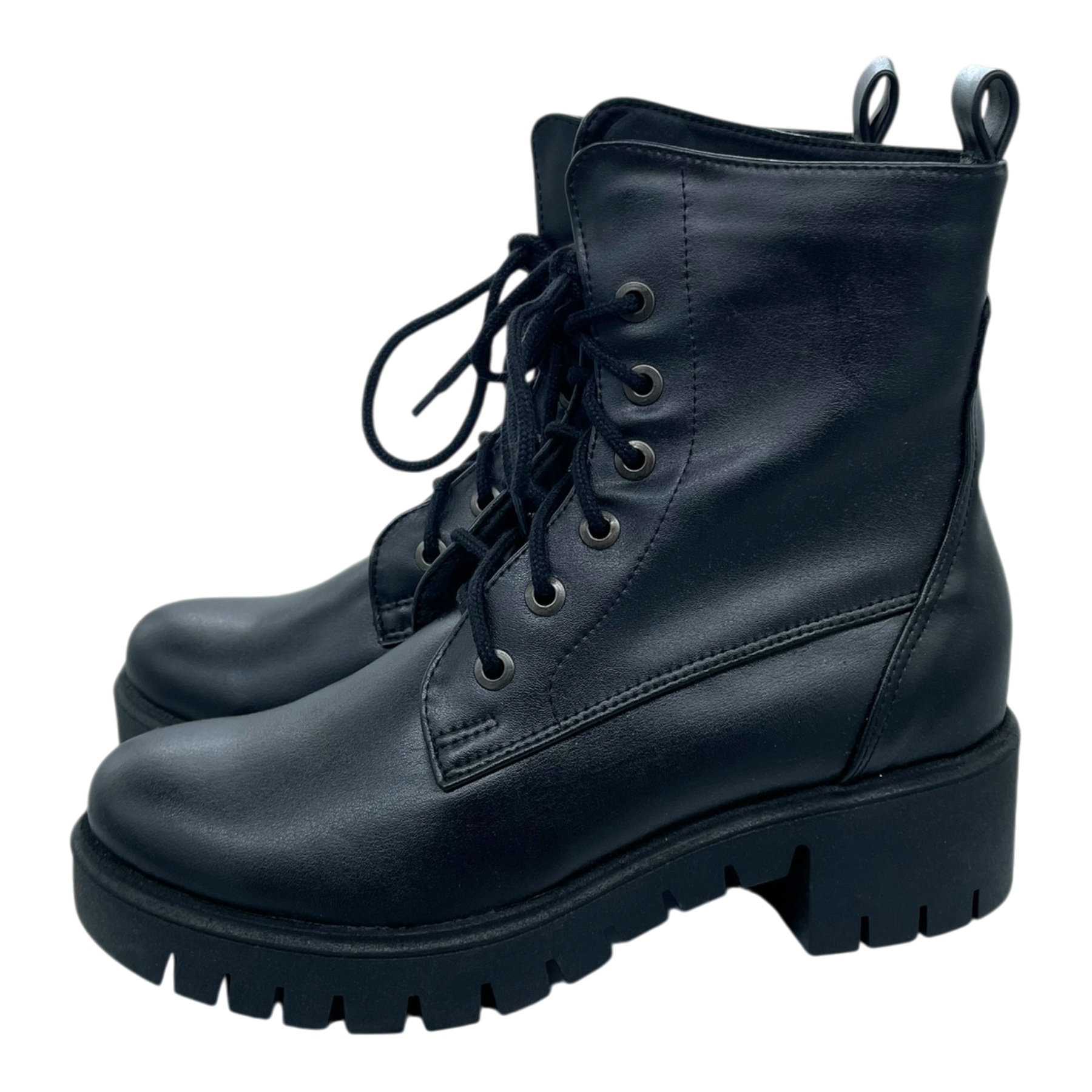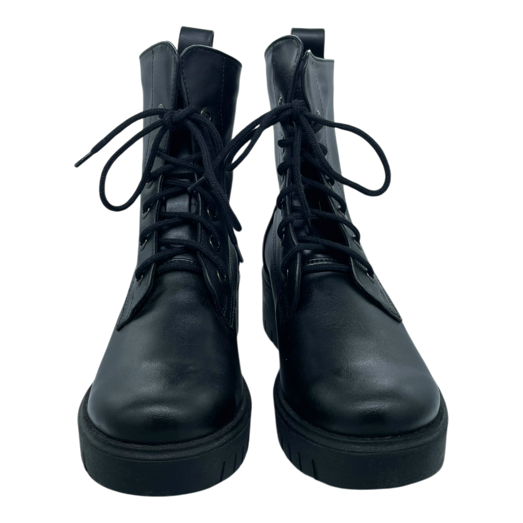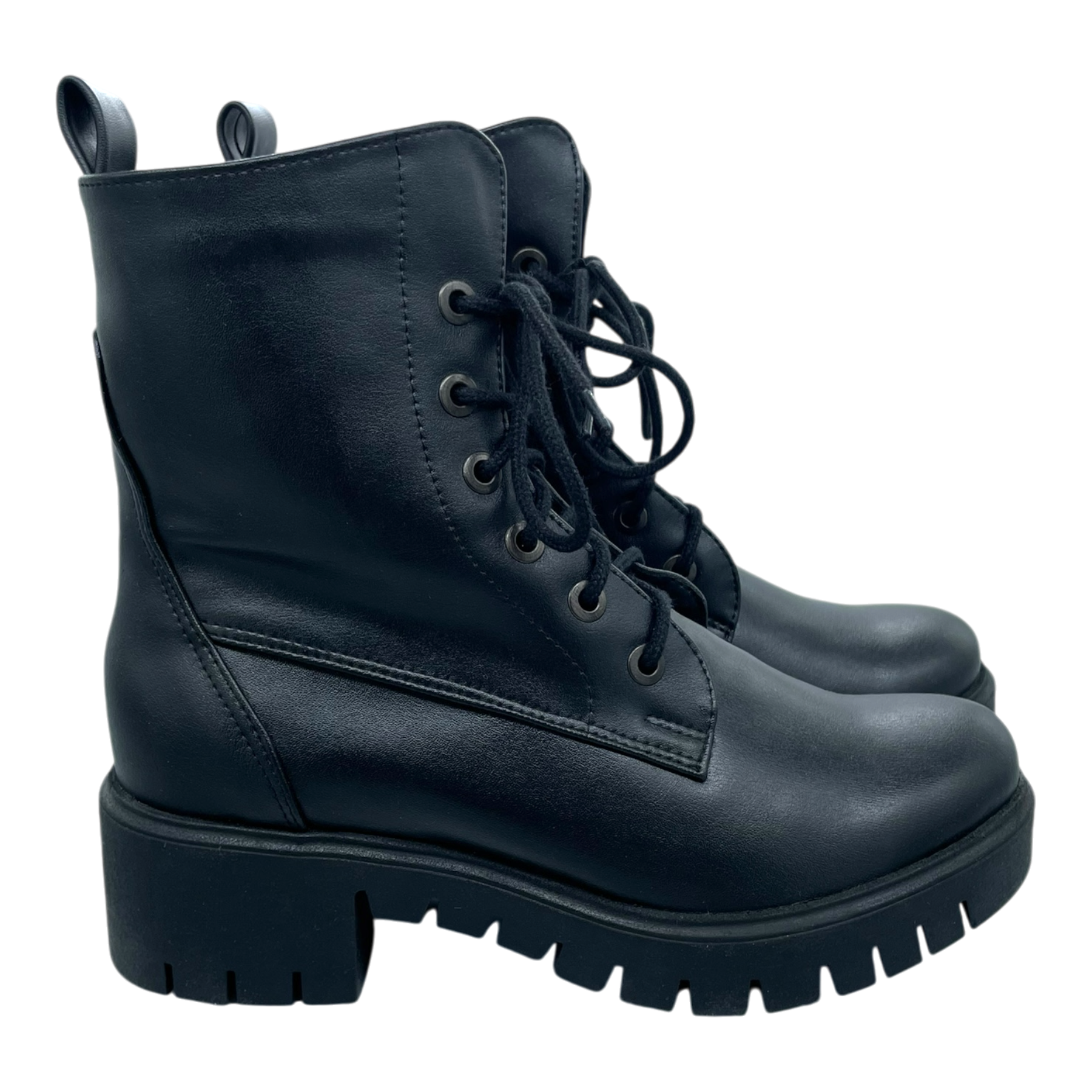 Bohema black combat boots featuring lace-up closure with metal eyelets, chunky platform sole with deep tread pattern, and pull tabs at heel. Mid-calf height with structured silhouette and durable construction.