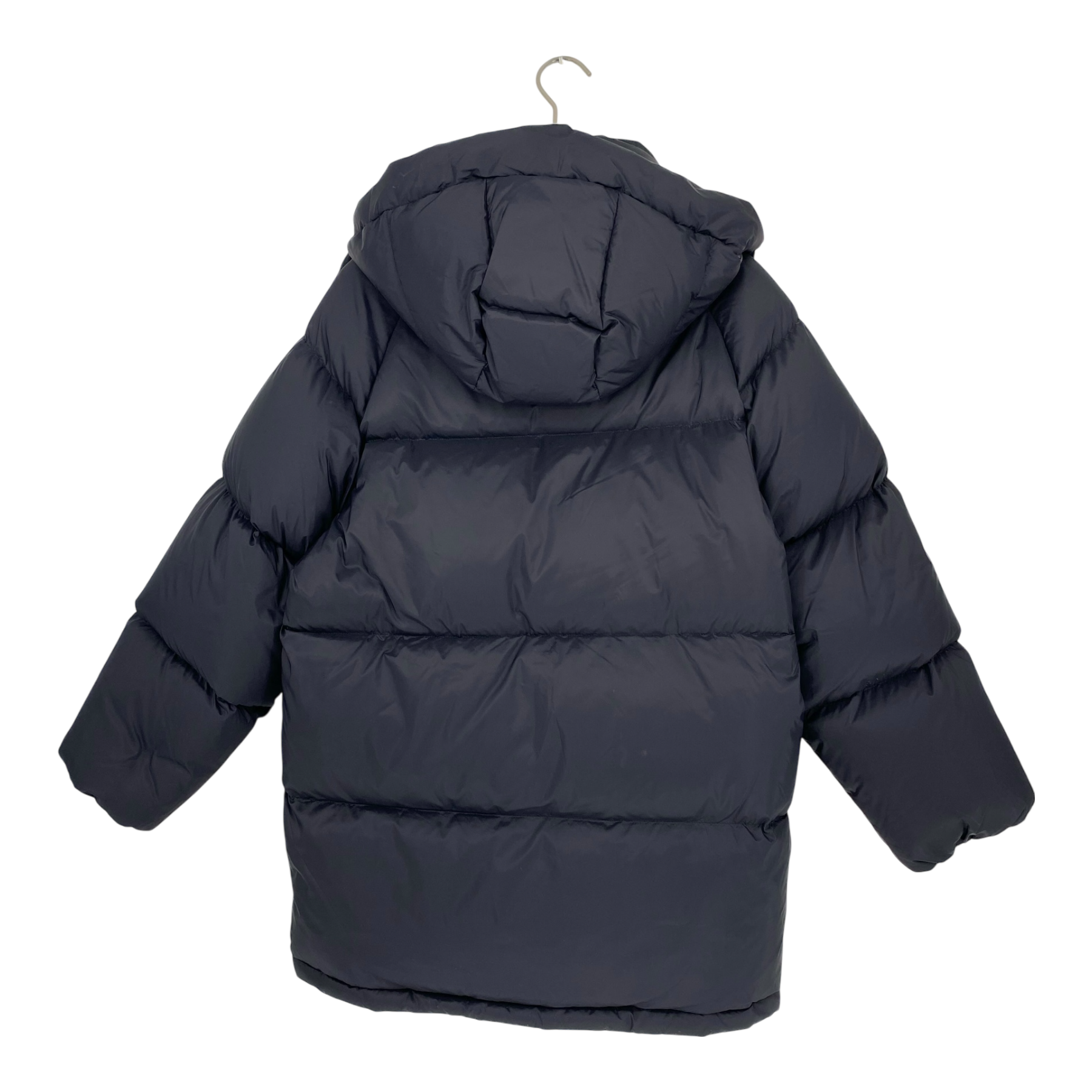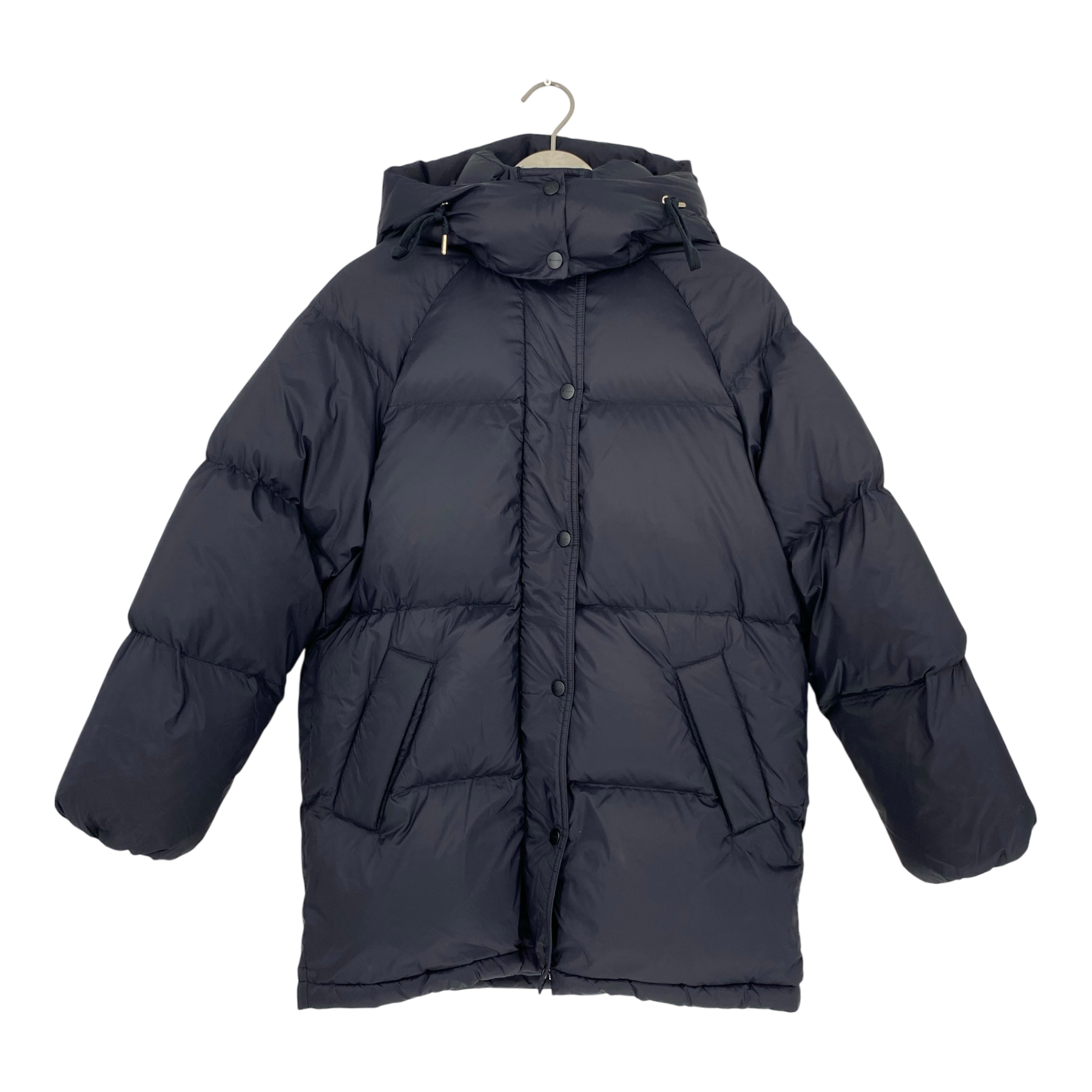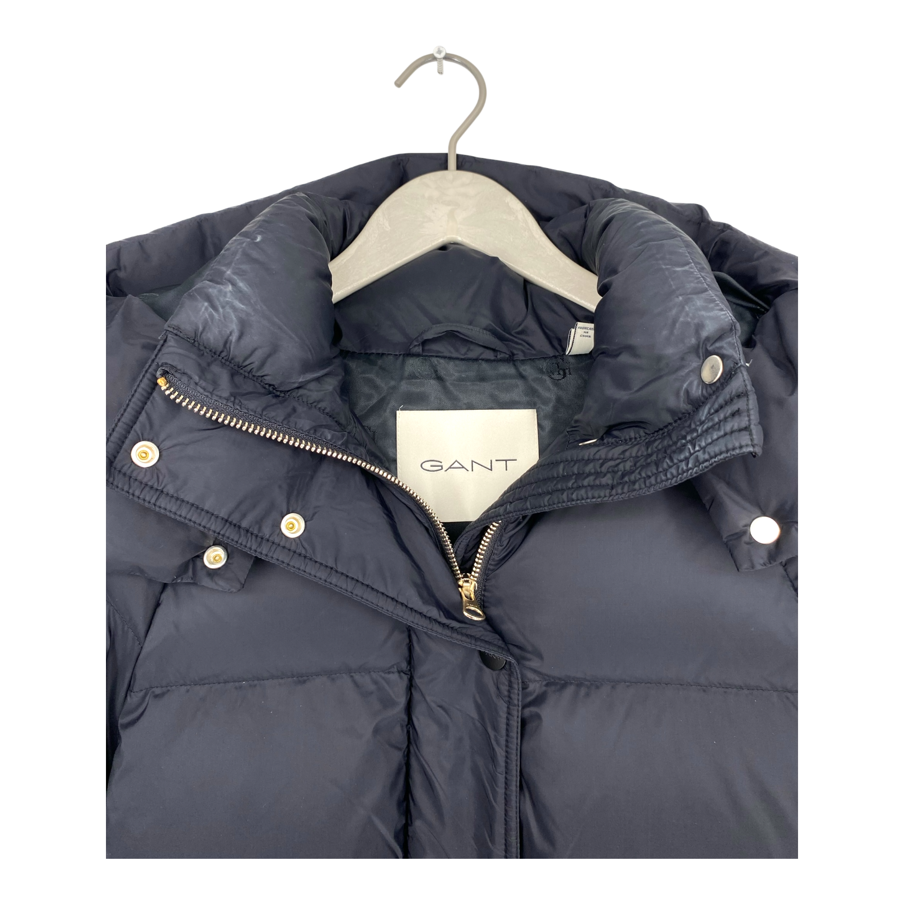Gant mid length down jacket in a dark blue color. This quilted jacket features a hood with adjustable drawstrings, a snap button front closure, and two front pockets. There are some makeup stains in the collar as shown in the picture.
