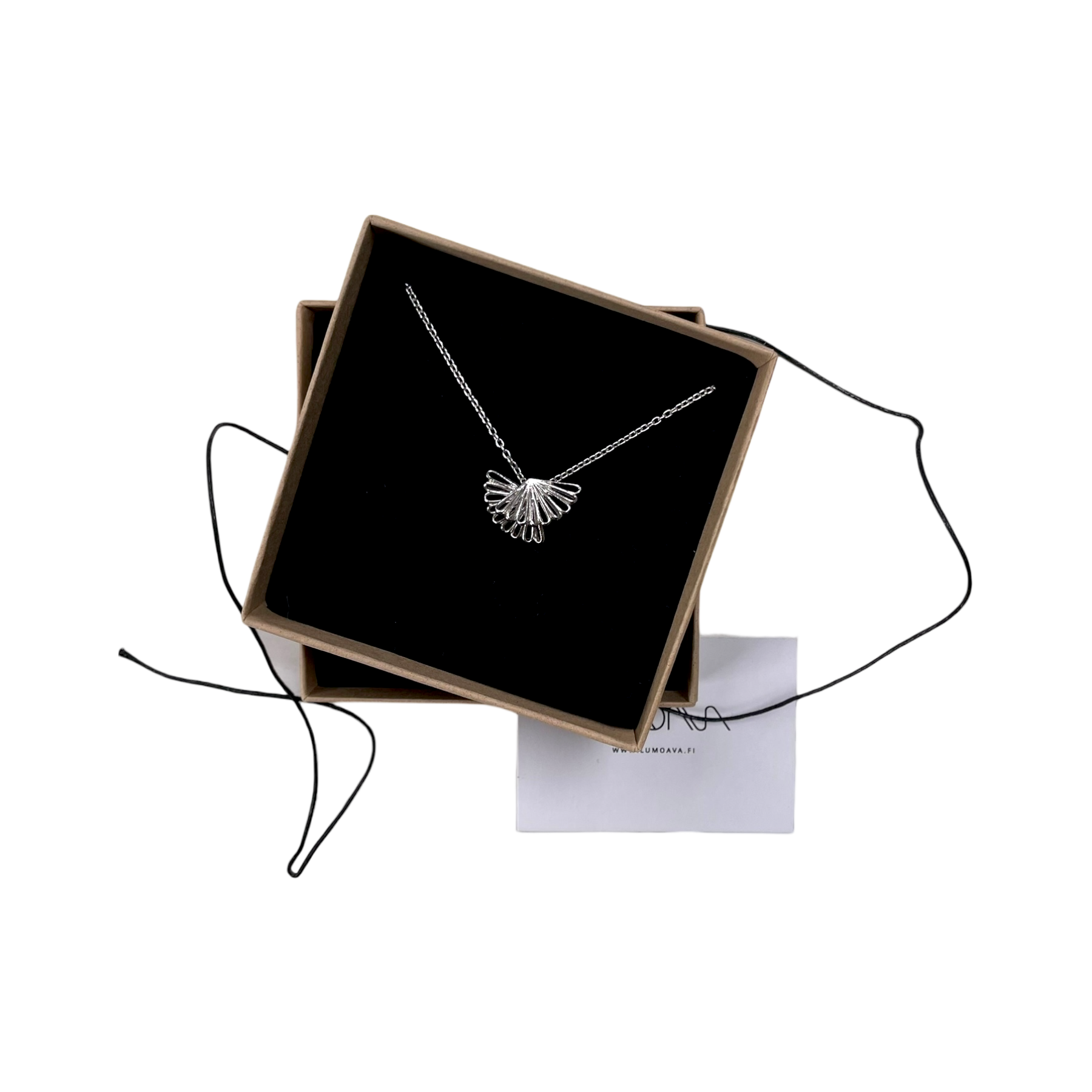 Lumoava Sinisiipi pendant with chain. The silver stamp 925 is on the chain. The pendant comes in its own packaging.