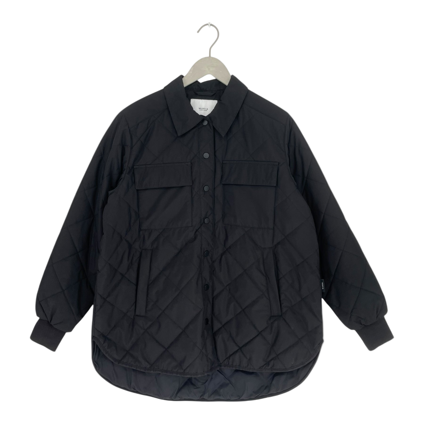 Makia lightweight quilted jacket and snap buttons. There are four pockets on the front of the jacket.