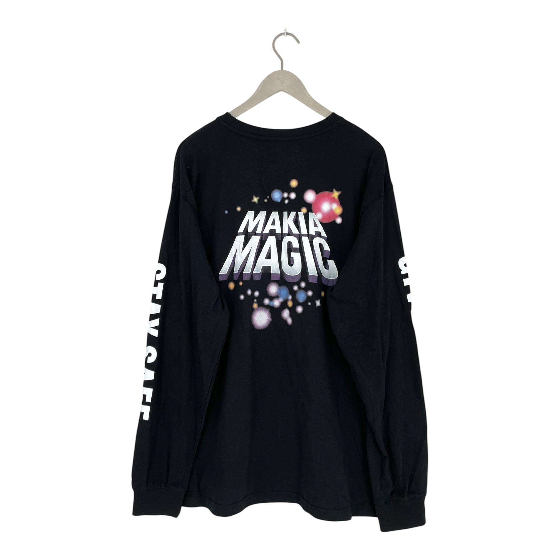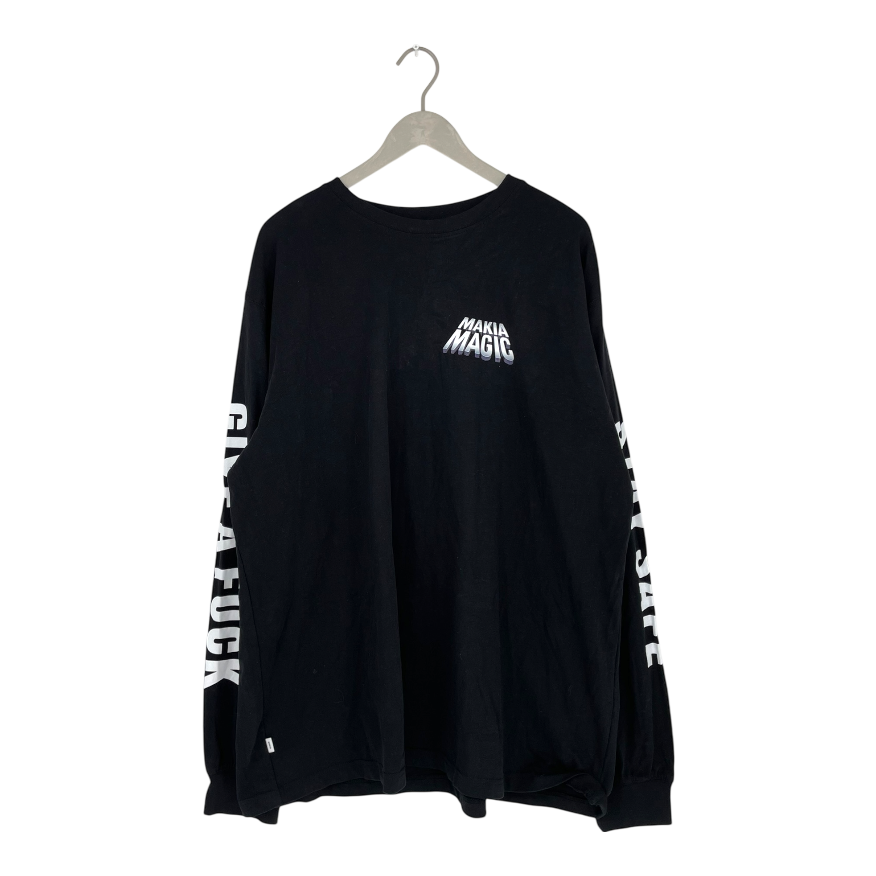 Makia Magic long sleeve shirt with large graphic prints of "Give a fuck" and "Stay safe" on the sleeves and "Makia Magic" on the back.