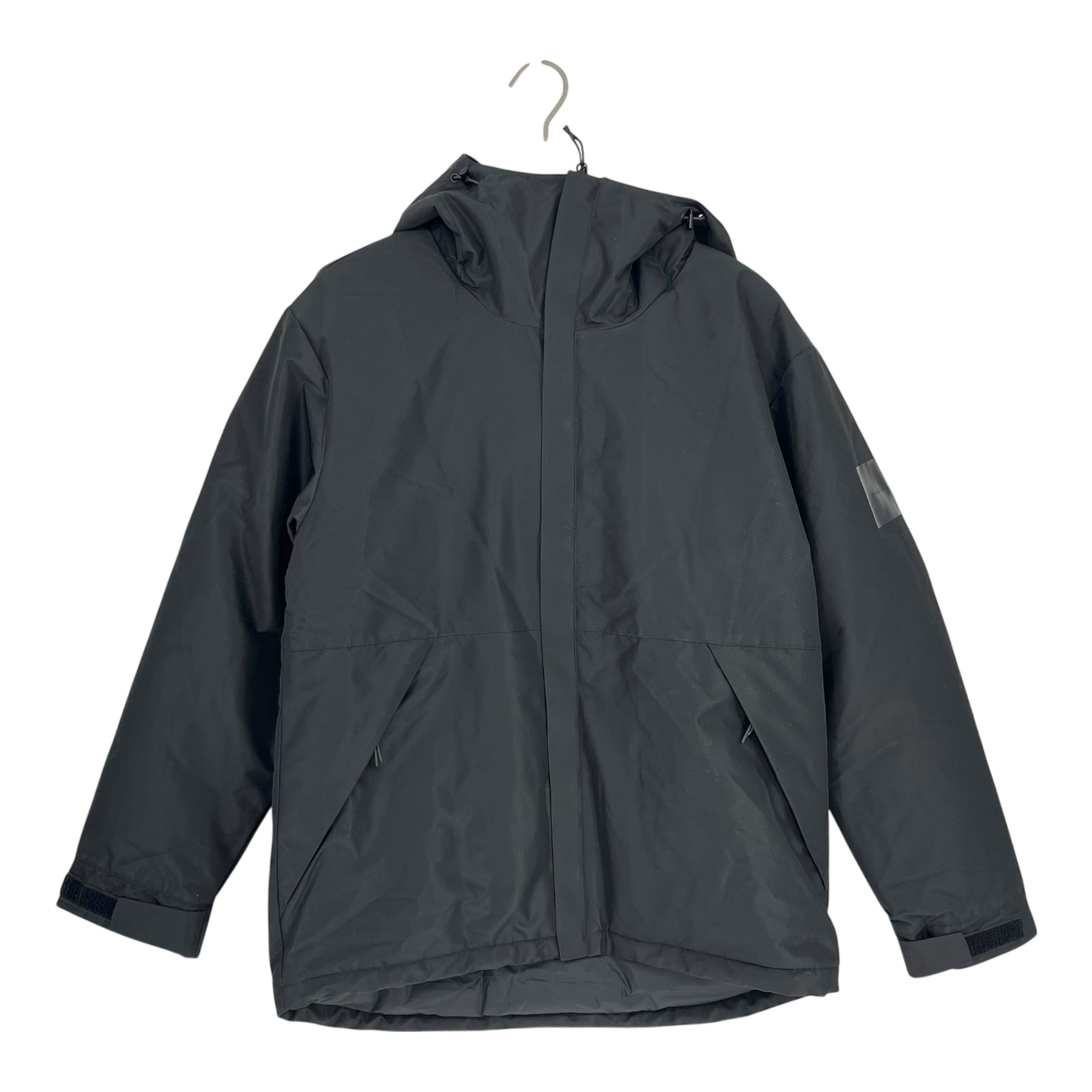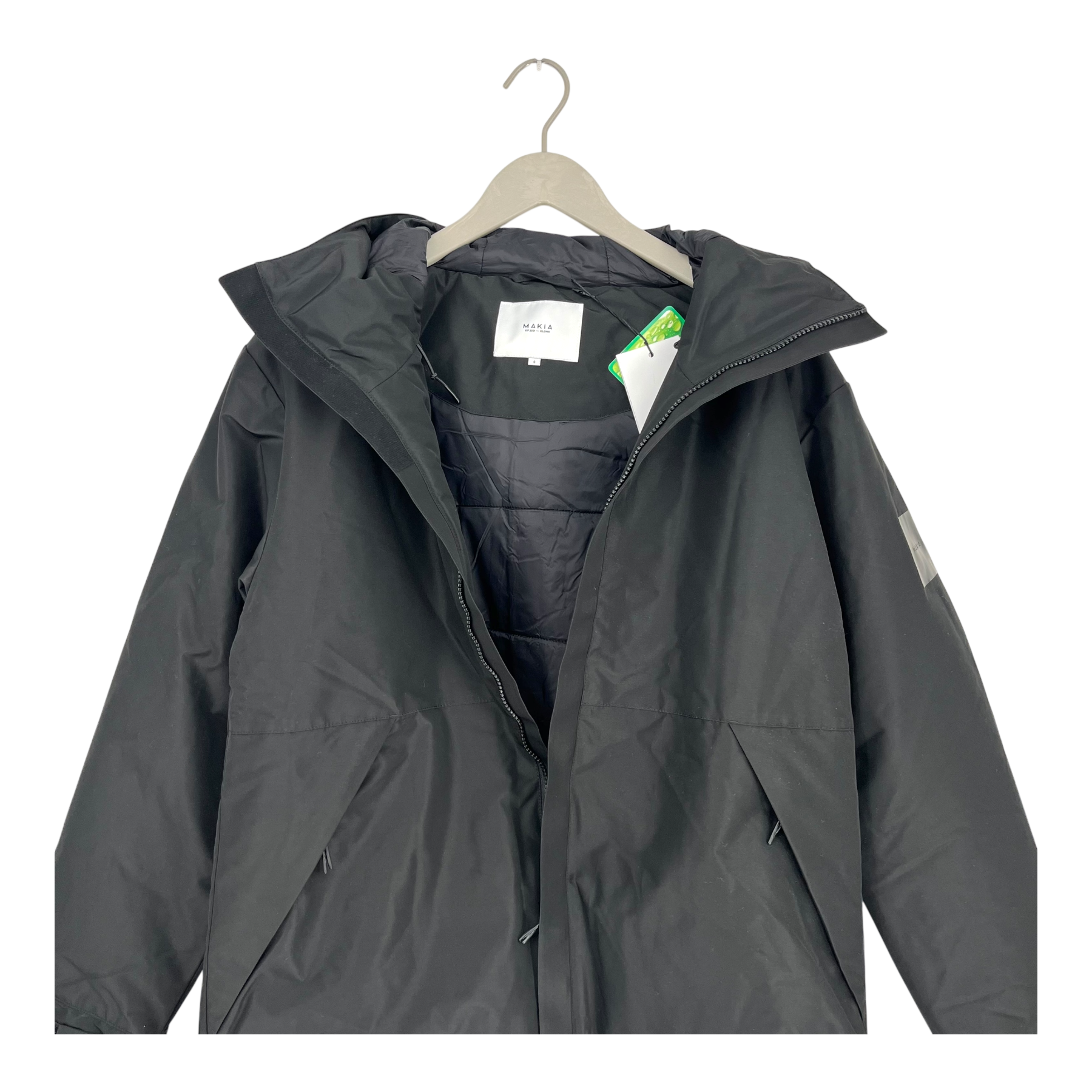 Makia men's Principal jacket designed in harsh Nordic conditions with functionality and toughness in mind. The jacket has a regular fit, elasticated hood adjustment with laminated hem and fastening with two-way zip and snaps. There is front fleece pockets with zipper and inner chest pocket with fleece.