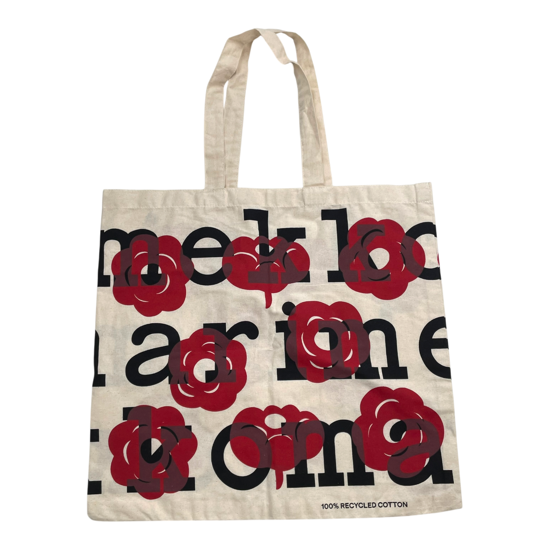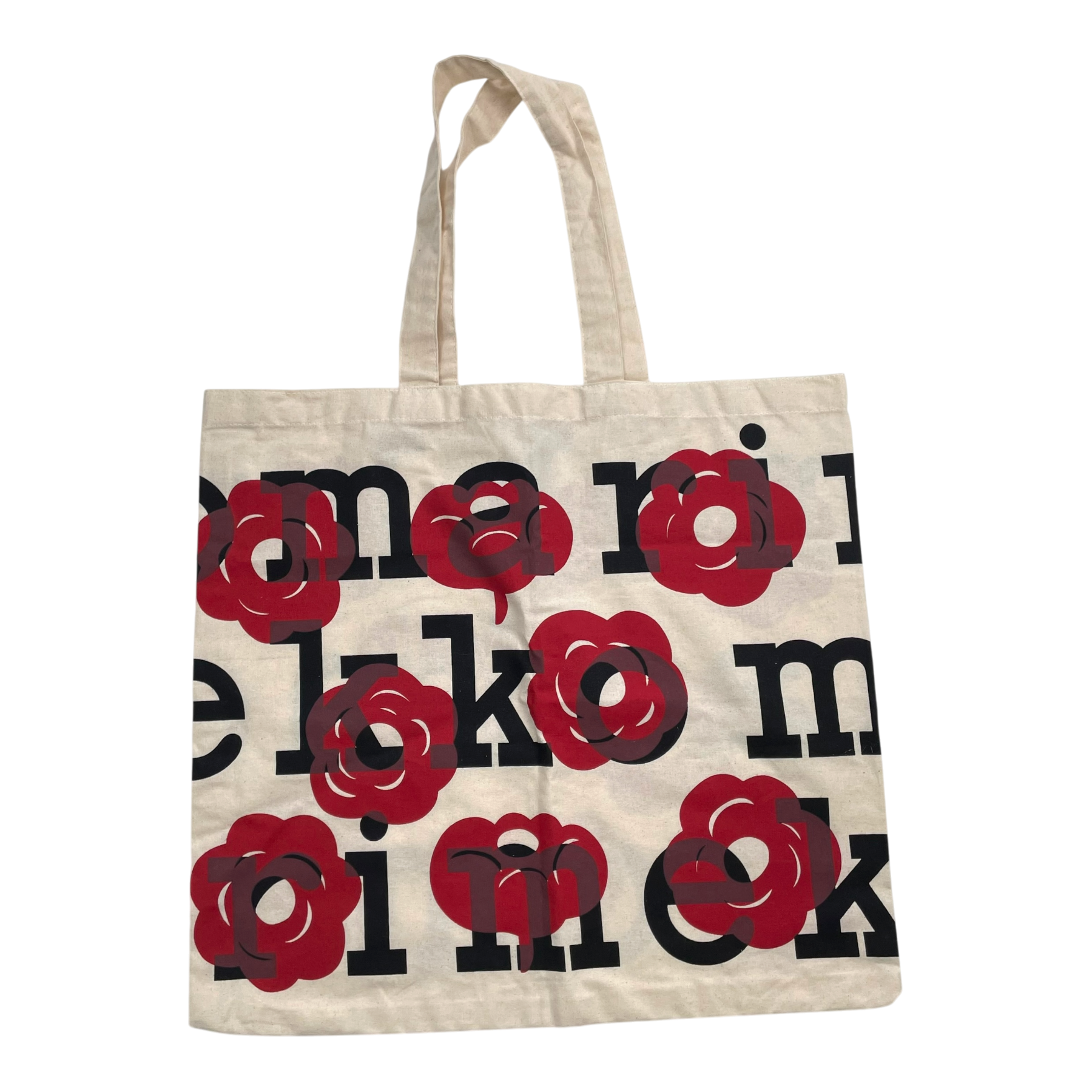 Marimekko tote shopping bag is made of lightweight cotton fabric, which features a logo pattern. The bag has two handles.