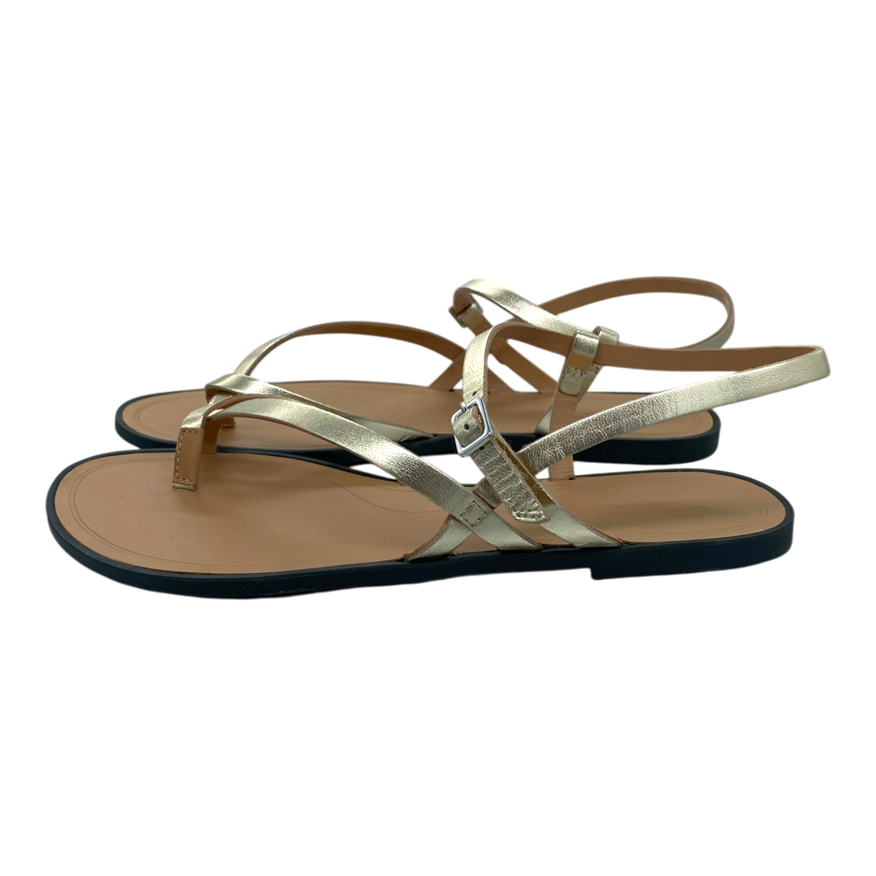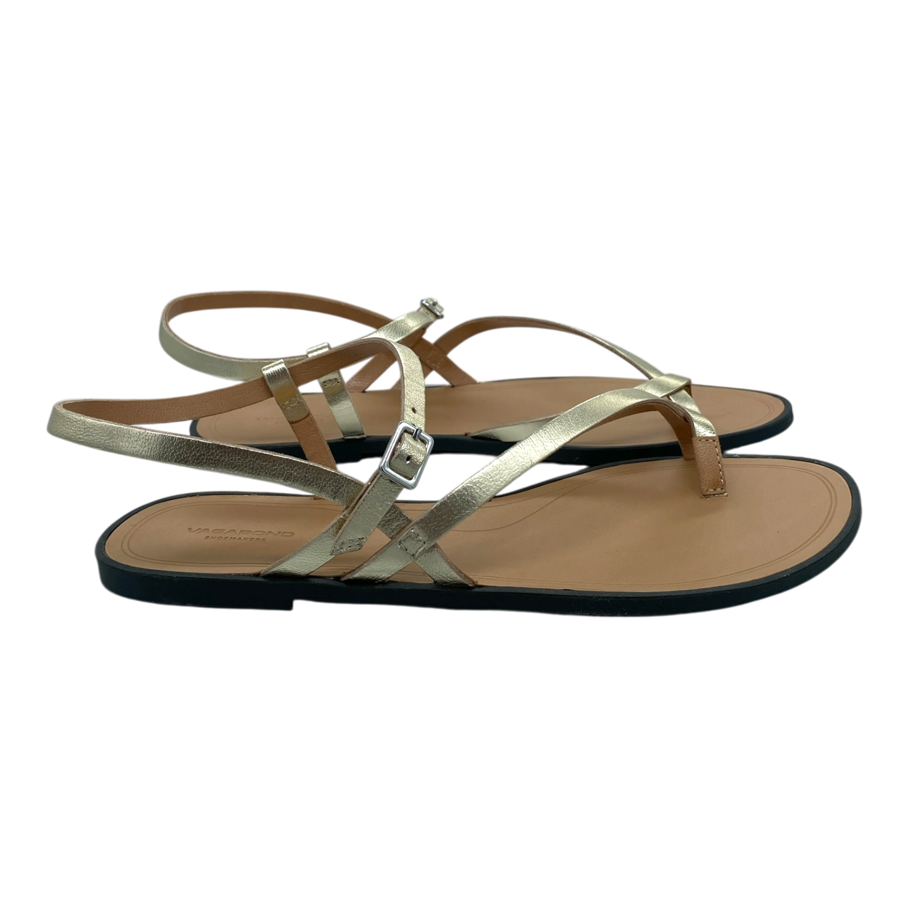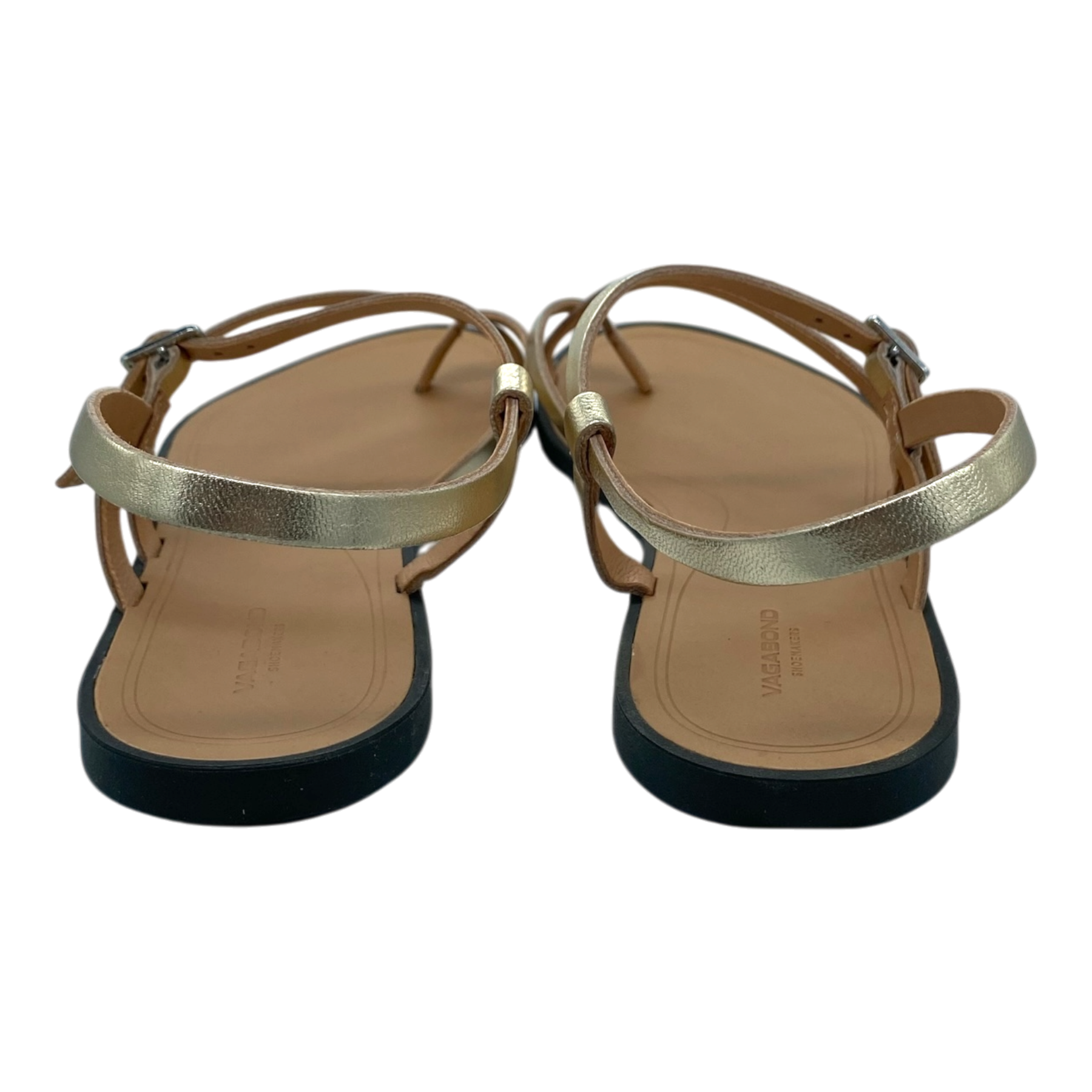 Vagabond strappy flat sandals in metallic gold leather. Features multiple thin leather straps that cross over the foot and wrap around the ankle with adjustable buckle closure. Flat sole with minimal heel.