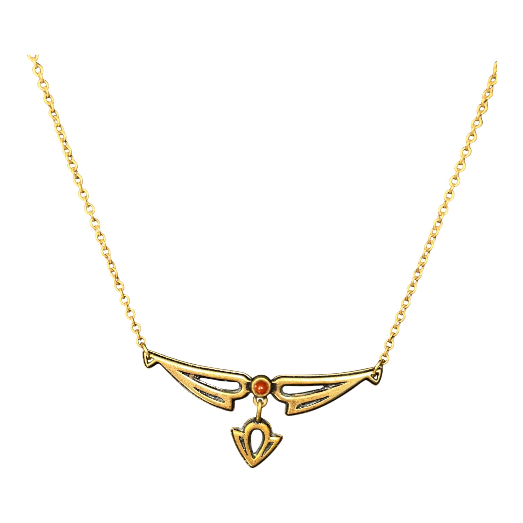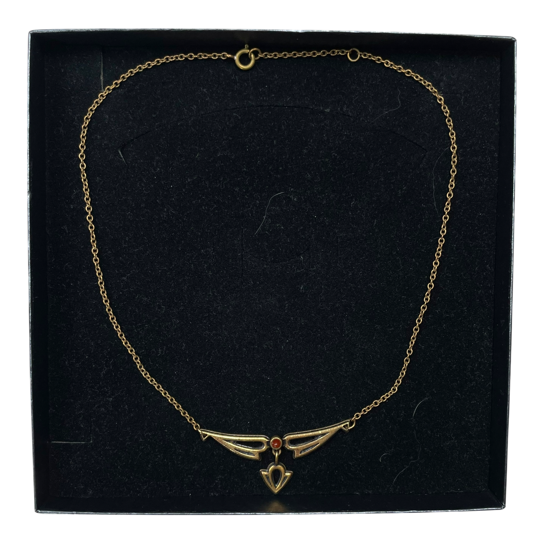 Kalevala Koru Illusioni necklace was designed by goldsmith Tony Granholm around the turn of the millennium. The piece features a small red, sugarloaf-shaped stone made of carnelian. The pendant section measures 54 mm in width and 22 mm in height. Annukeri chain, spring ring clasp.