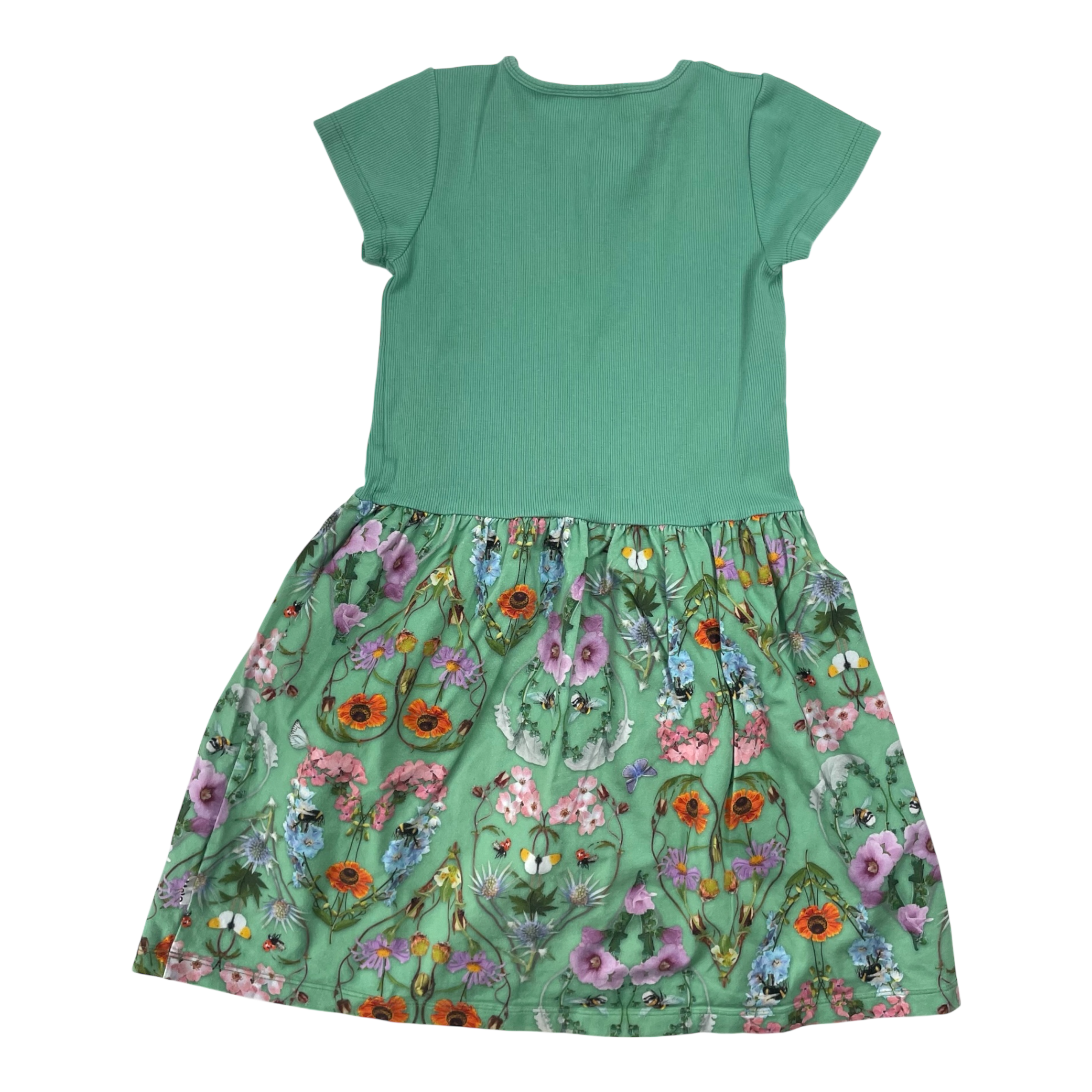 Molo short sleeve rib dress with a flower print on the hem. Top is made from rib fabric and the bottom is woven cotton.