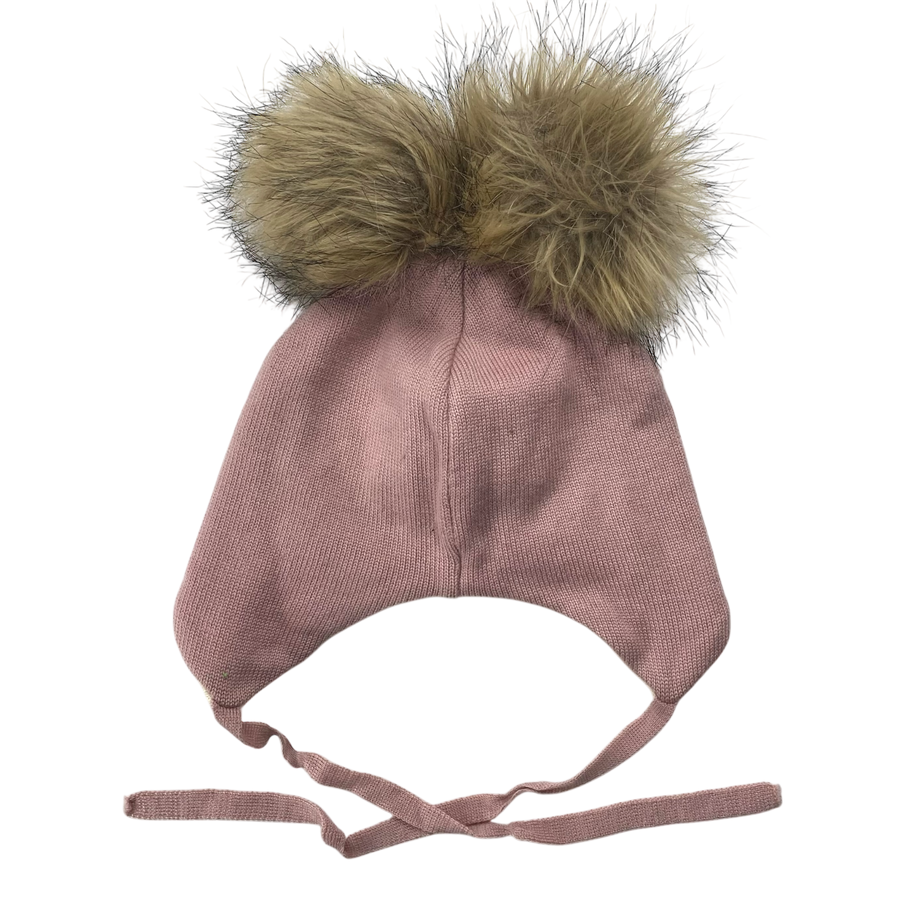 Metsola beanie with two fake fur poms and strings to tie with. Original size is XL.