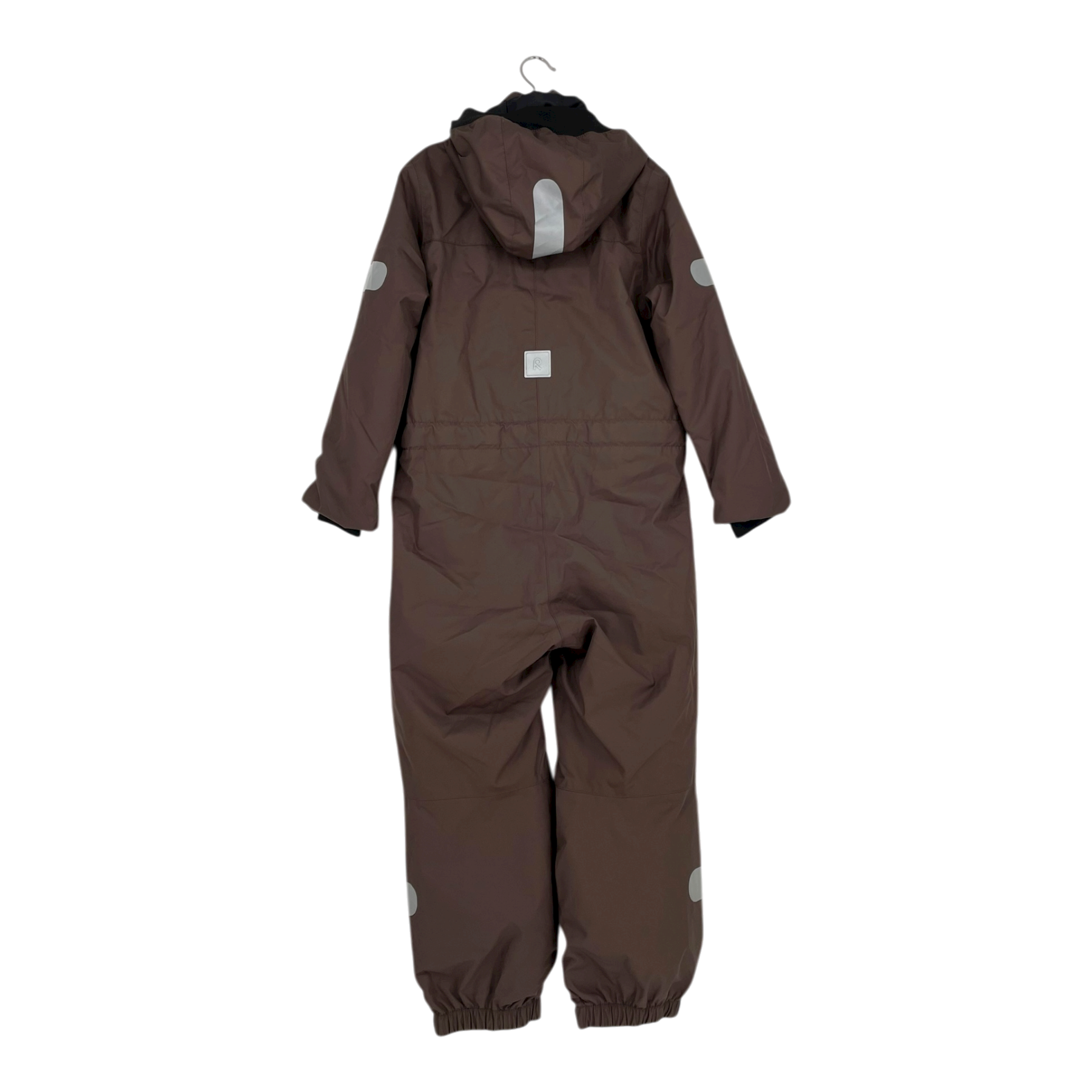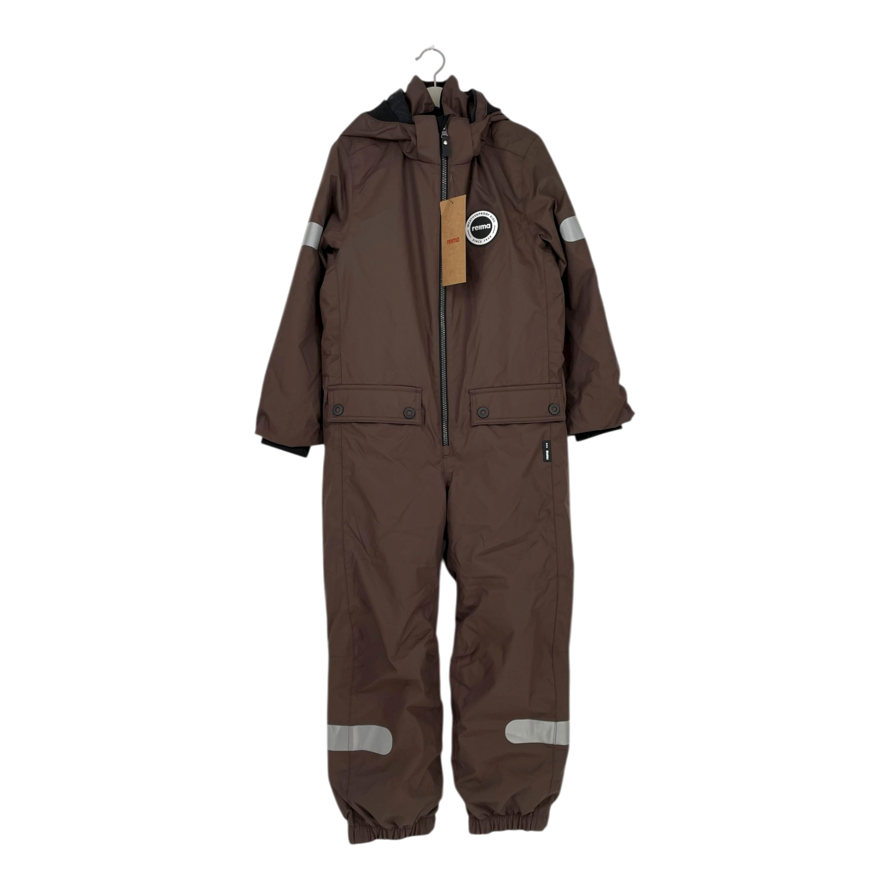 Reima Sevetti midseason overall draws inspiration from Reima's '70s-style collections. Overall has a detachable hood, adjustable elastic on the waist, silicone foot loops and two flap pockets on the front. Material is originally waterproof up to 10,000mm water column, all seams are sealed, and the material is dirt- and water-repellent.